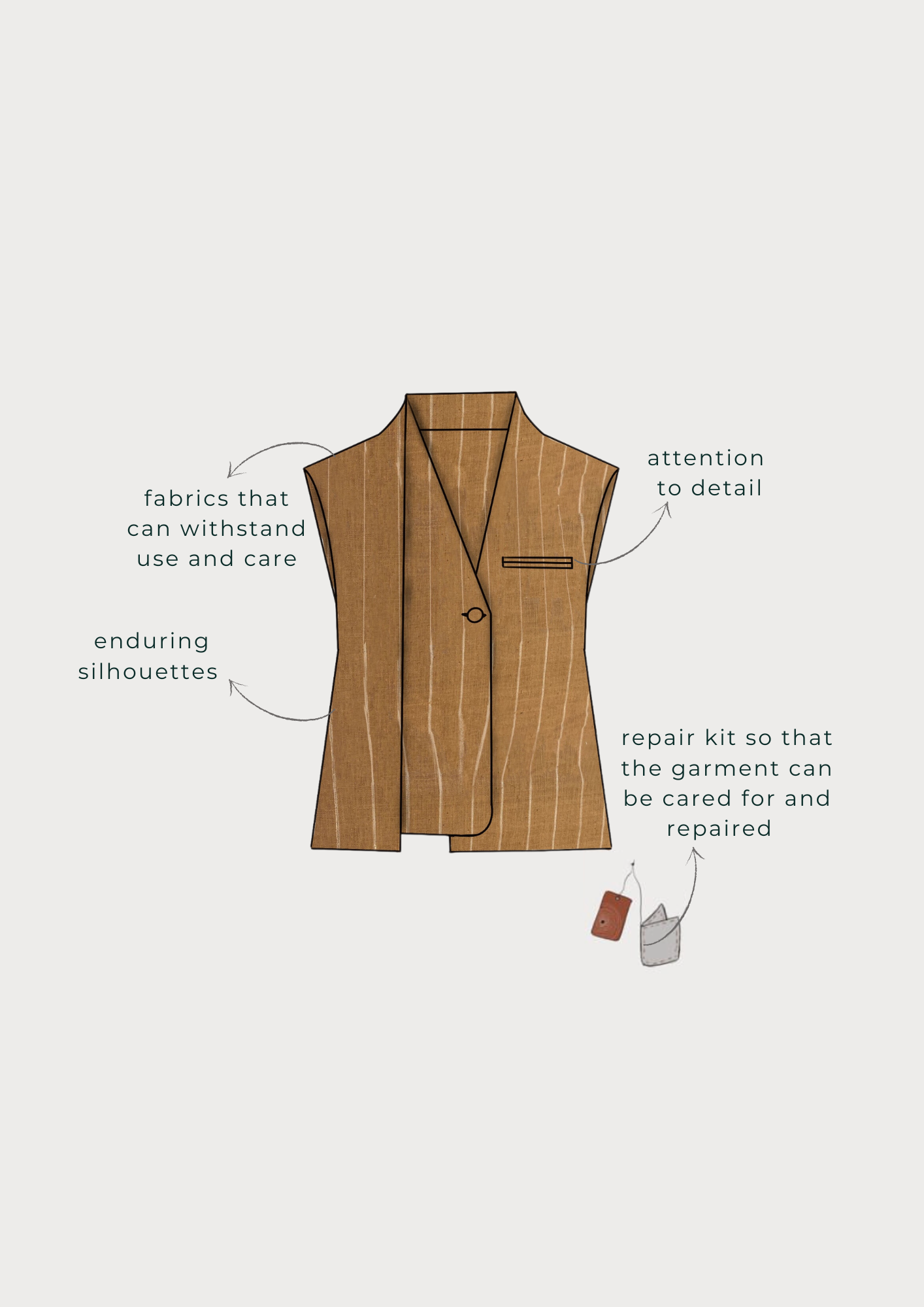 Garments designed in mono-materials with enduring silhouettes, attention to detail, and crafted in natural materials. Repair kits are provided to prolong garment use. From buttons to embroidery threads, our small batch manufacturing ensures eco-friendliness, making our products 100% biodegradable.