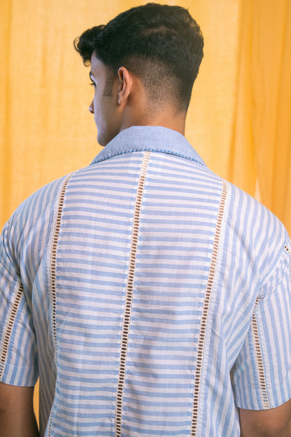 It features a Cuban collar and a front button opening. Ladder lace inserts run between the panels. The silhouette is relaxed with short sleeves and a straight hem- easy to wear, style, and layer.
