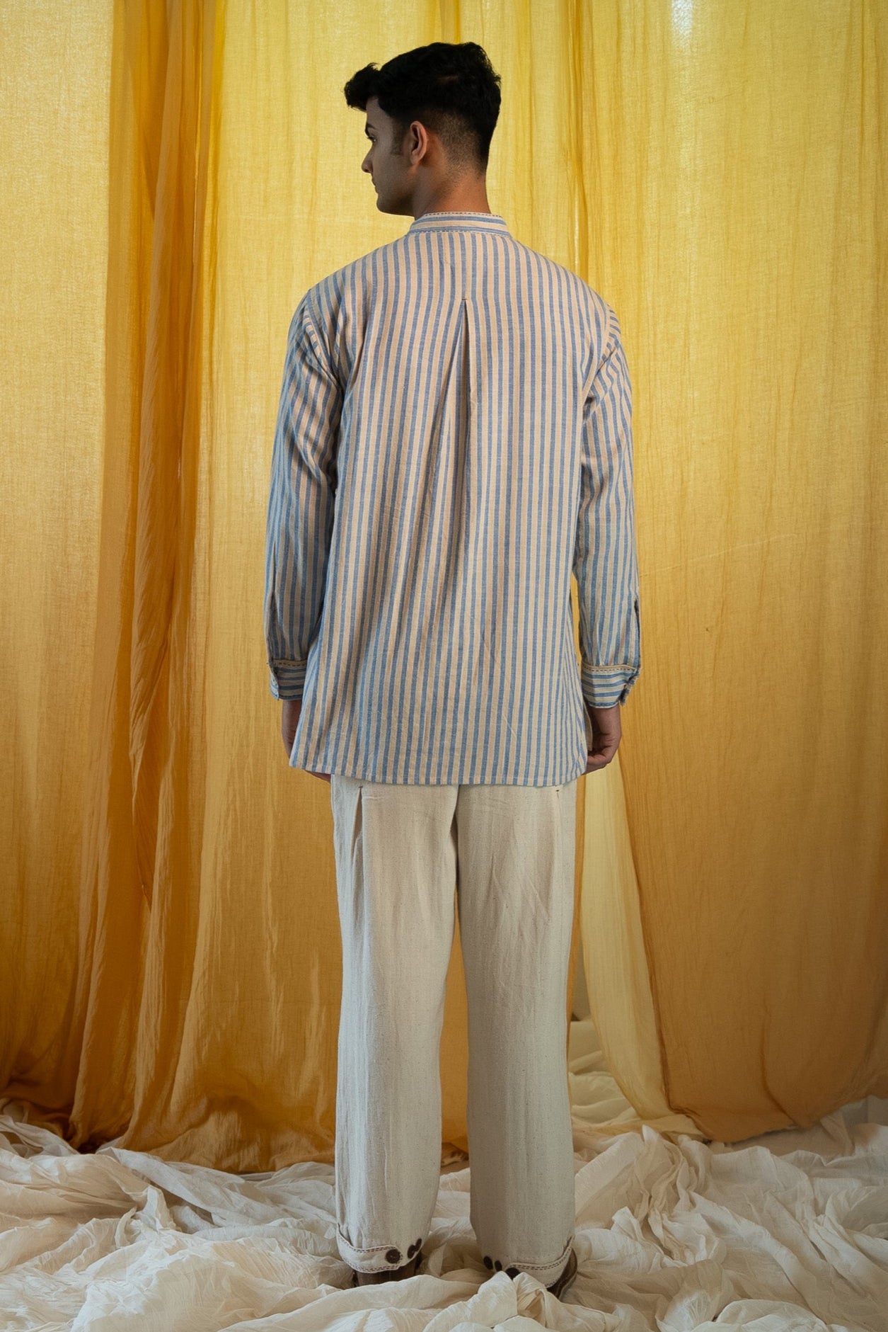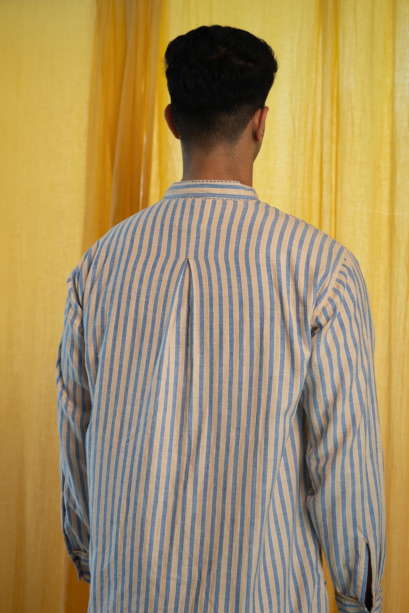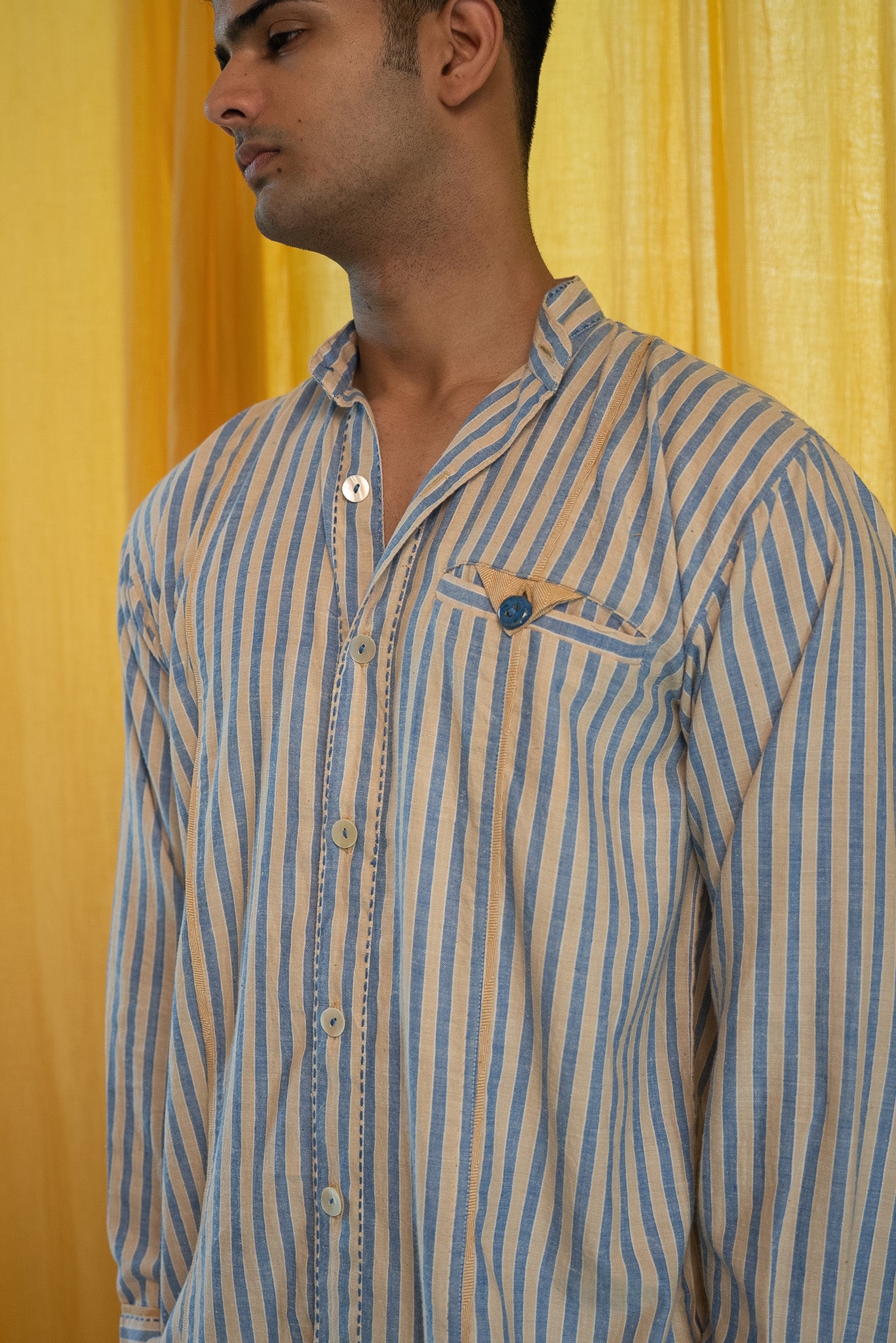Made from 100% cotton fibres and natural materials. The AY Panelled Shirt combines handwoven striped cotton and twill, both azo-free dyed.