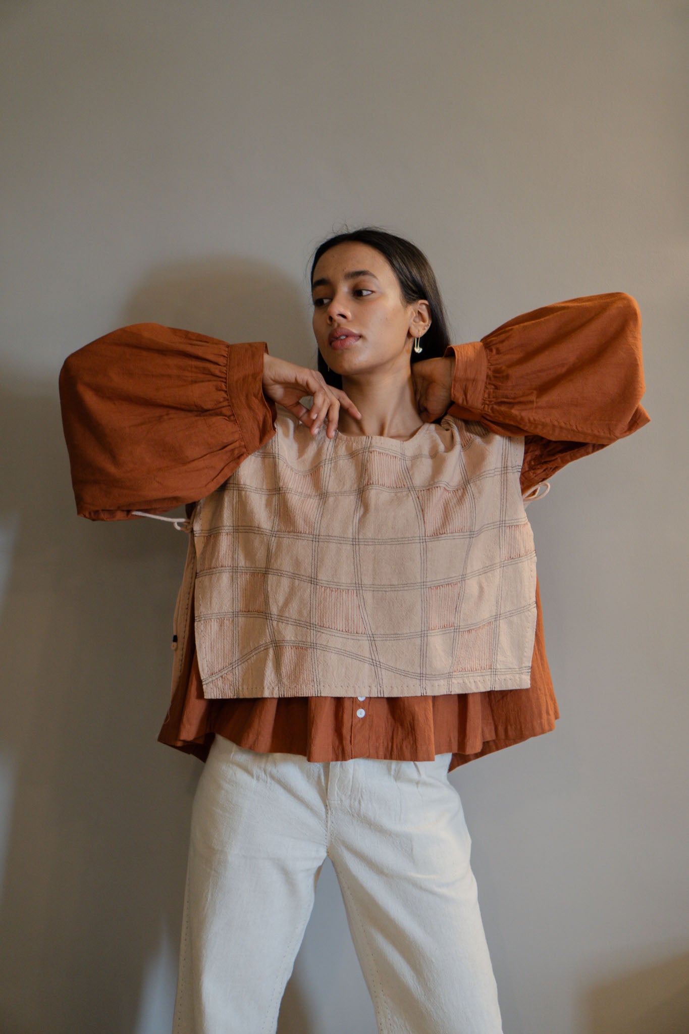 Tailored with intricate stitch lines in shades of black and rust, forming an asymmetric geometric pattern, this one-of-a-kind piece is tailored to flatter all body types with its free-size design.