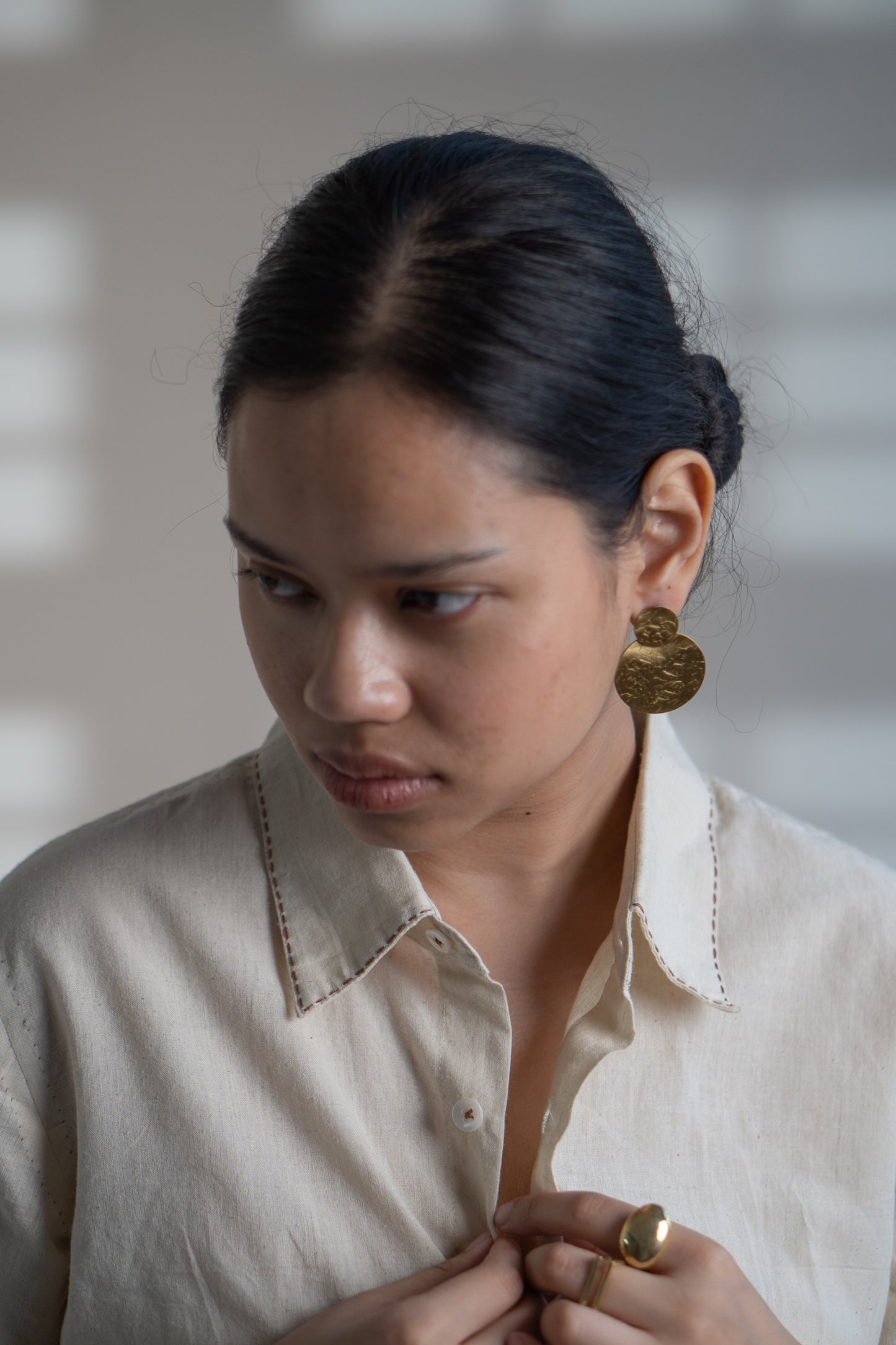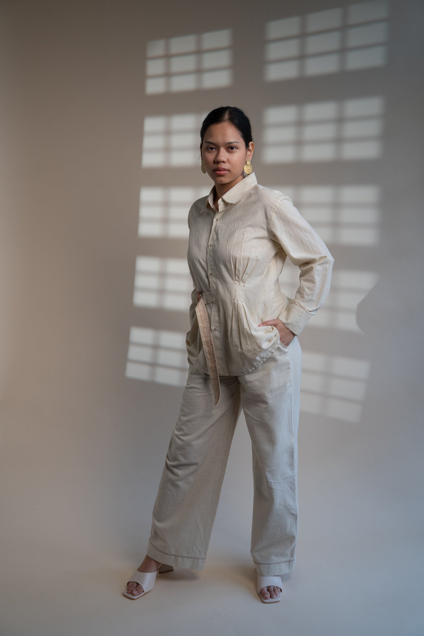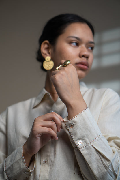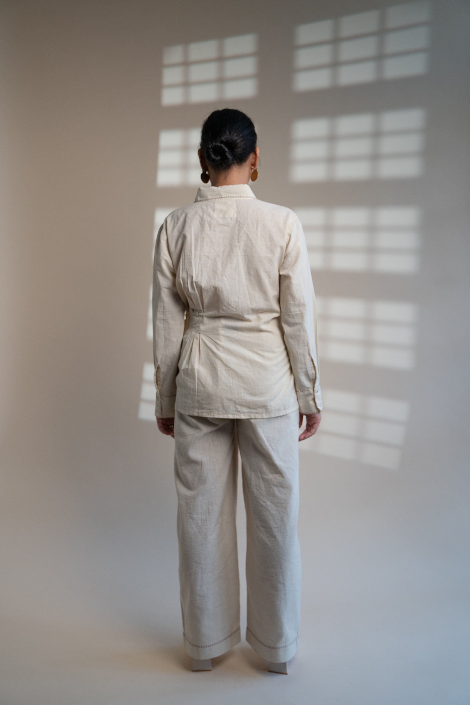 Crafted in 100% organic cotton fibres and natural materials. This 60s cotton shirt is undyed and unbleached. This shirt comes with a pleating detail on one side and is adorned with the stitches of Kantha, a form of Indian hand embroidery along the cuffs to create an ombre effect. Practical touches include a side-pocket.