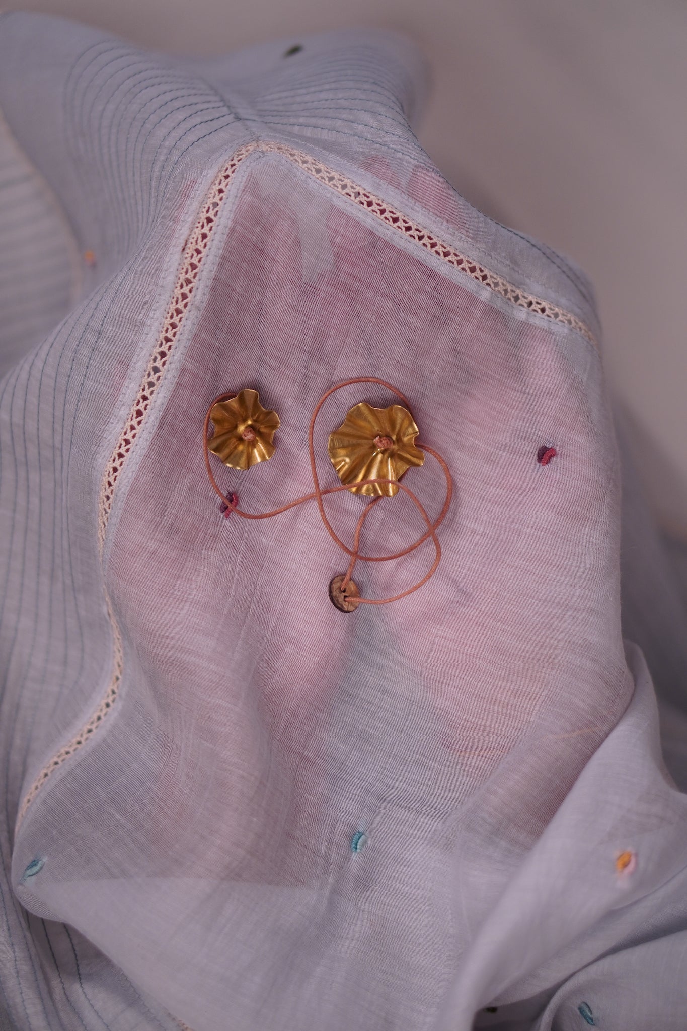 Long Scarf with Blue Stitch Lines: This 72*16 inches sheer Chanderi scarf unfolds, revealing a canvas of sophistication with light blue stitch lines resembling a tranquil sky. The magic lies in the details, with hexagon buttons at each corner accentuating the allure of this cool-toned masterpiece.