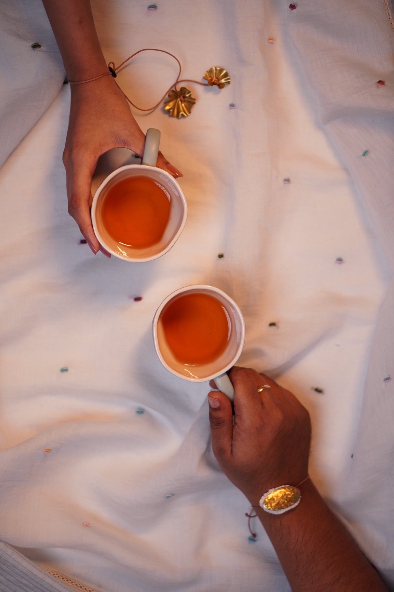 Bracelet cum Neckalce- A convertible modern take with added purpose beyond the festive occasion. Handcrafted in brass with waxed cotton string and mother of pearl button detail. It's an easy to switch design, from a tassel Bracelet to a Necklace by just a cross lock of crinkled poppy tassels. Wear it as a crosslock poppy tassel tie with a neat linen shirt or simply add the poppy tassel to accessorise your hairdo or bangles.