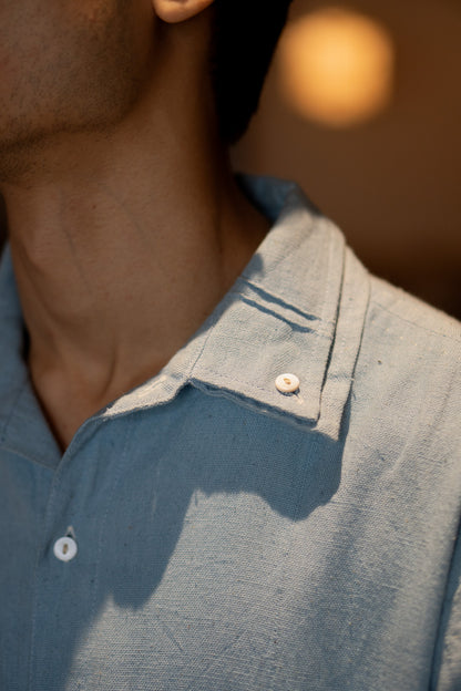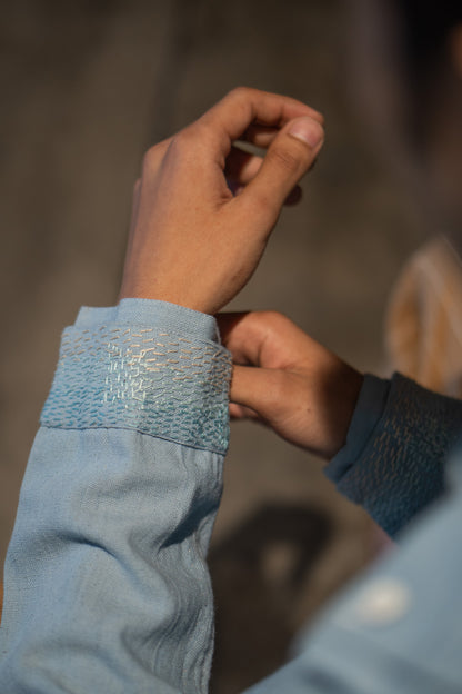 Replete with slits in the front, pintucked double collar & embroidered cuffs make this shirt a versatile button-up for an all-season wardrobe. This breathable cotton shirt features stitches of Kantha, running in shades of blue & off-white creating an ombré transition at the cuffs.