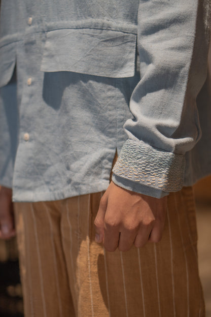 Crafted in 100% cotton fibres and natural materials, this Embroidered Cuff Detail Shirt has been naturally dyed using Indigo and Turmeric.