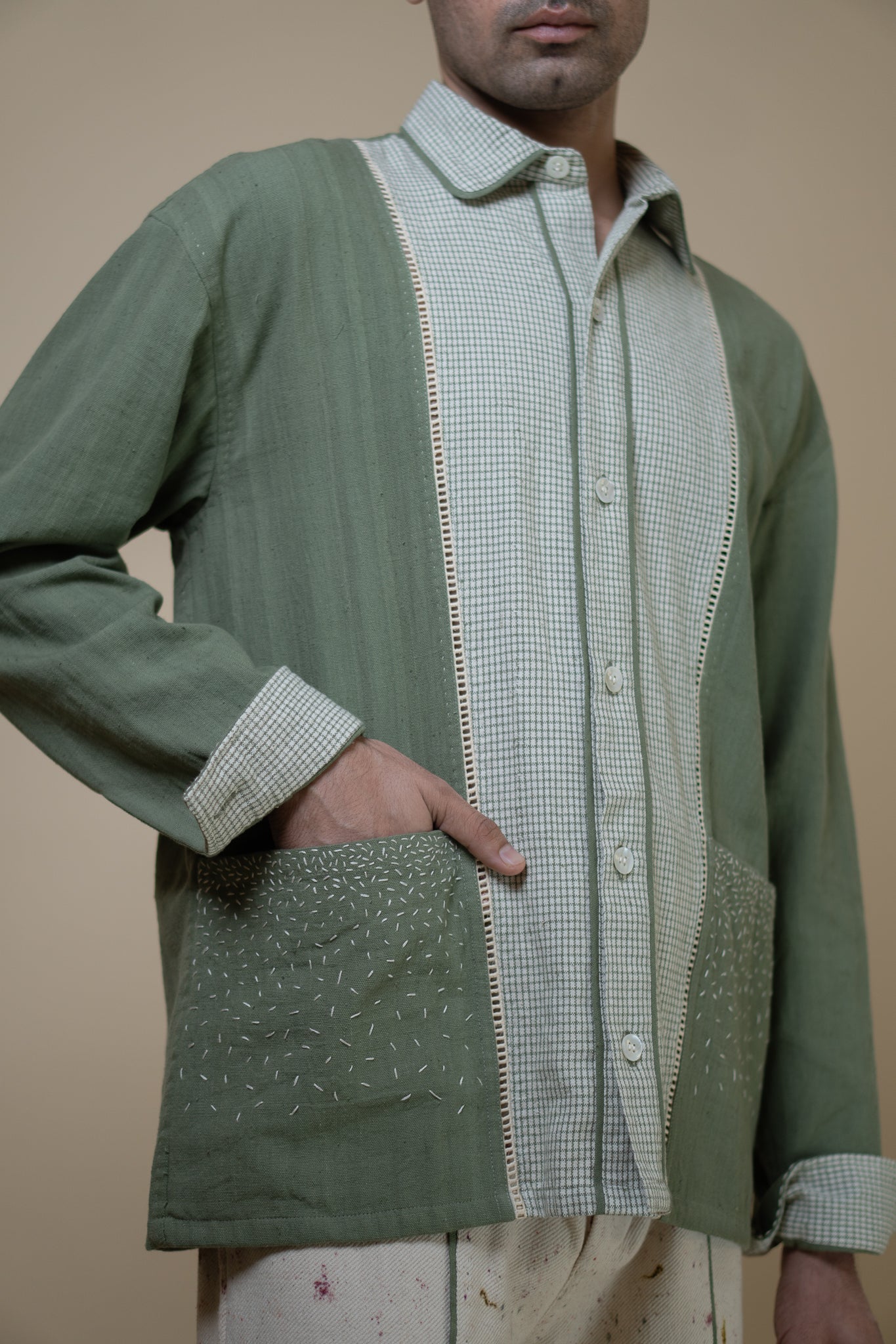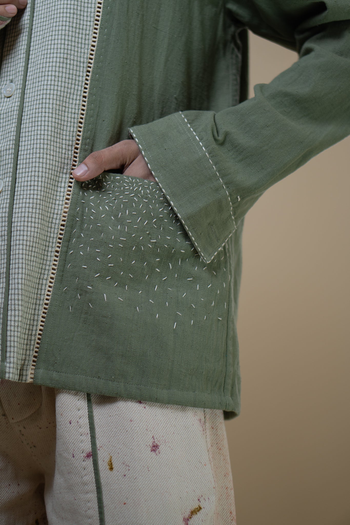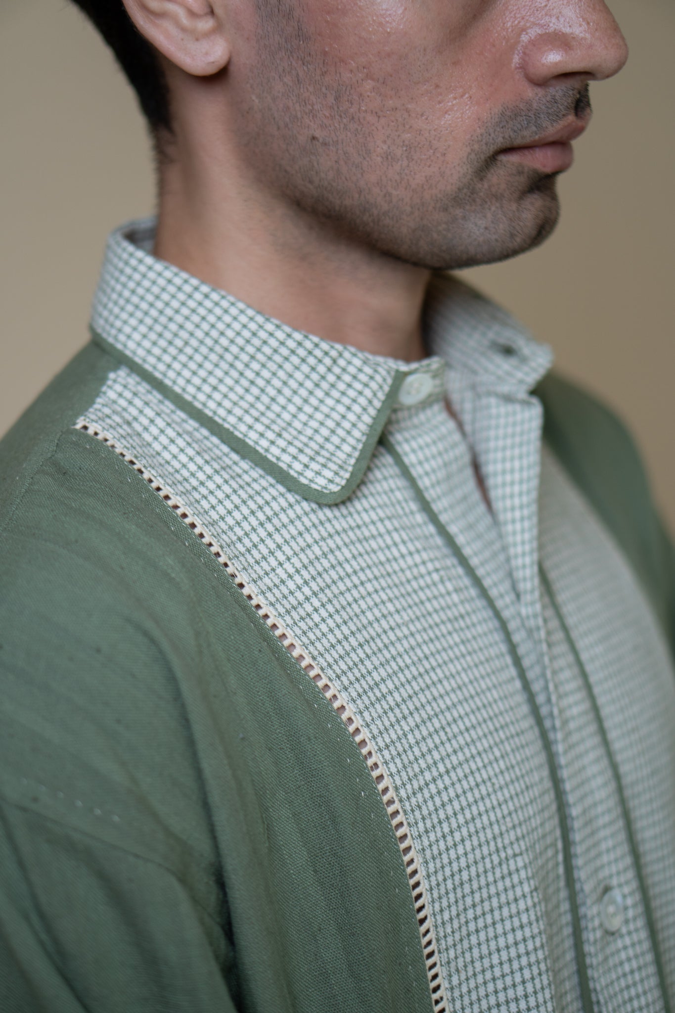 This classic silhouette is elevated with thoughtful details- olive piping runs along the placket and collar, while delicate lace detailing highlights the front color-blocking. The foldable cuffs reveal the check pattern when rolled, adding a subtle contrast. Big patch pockets add a functional touch, with traditional Kantha stitching flowing along the front panel and cuffs. Scattered Kantha details on the pockets further enhance its textured, handcrafted finish.