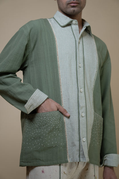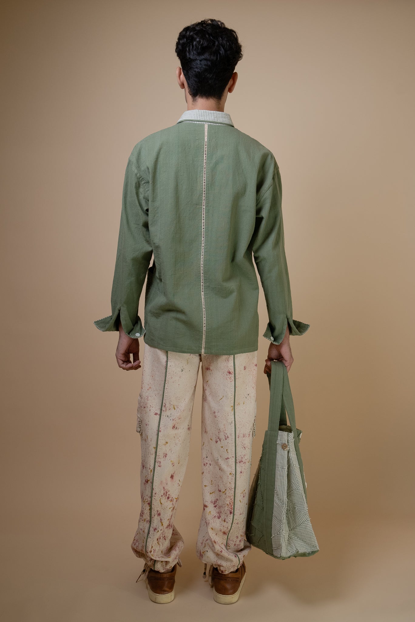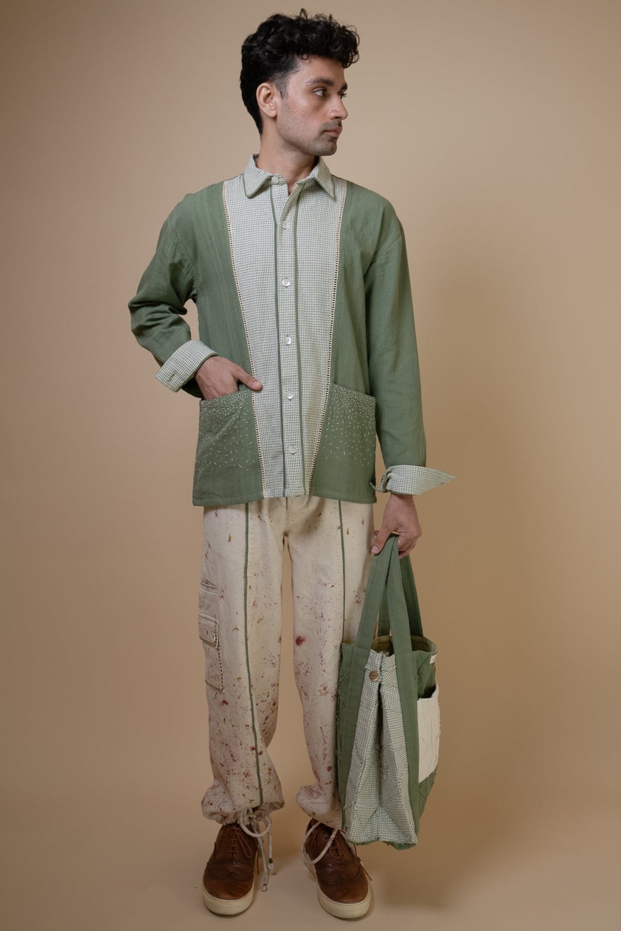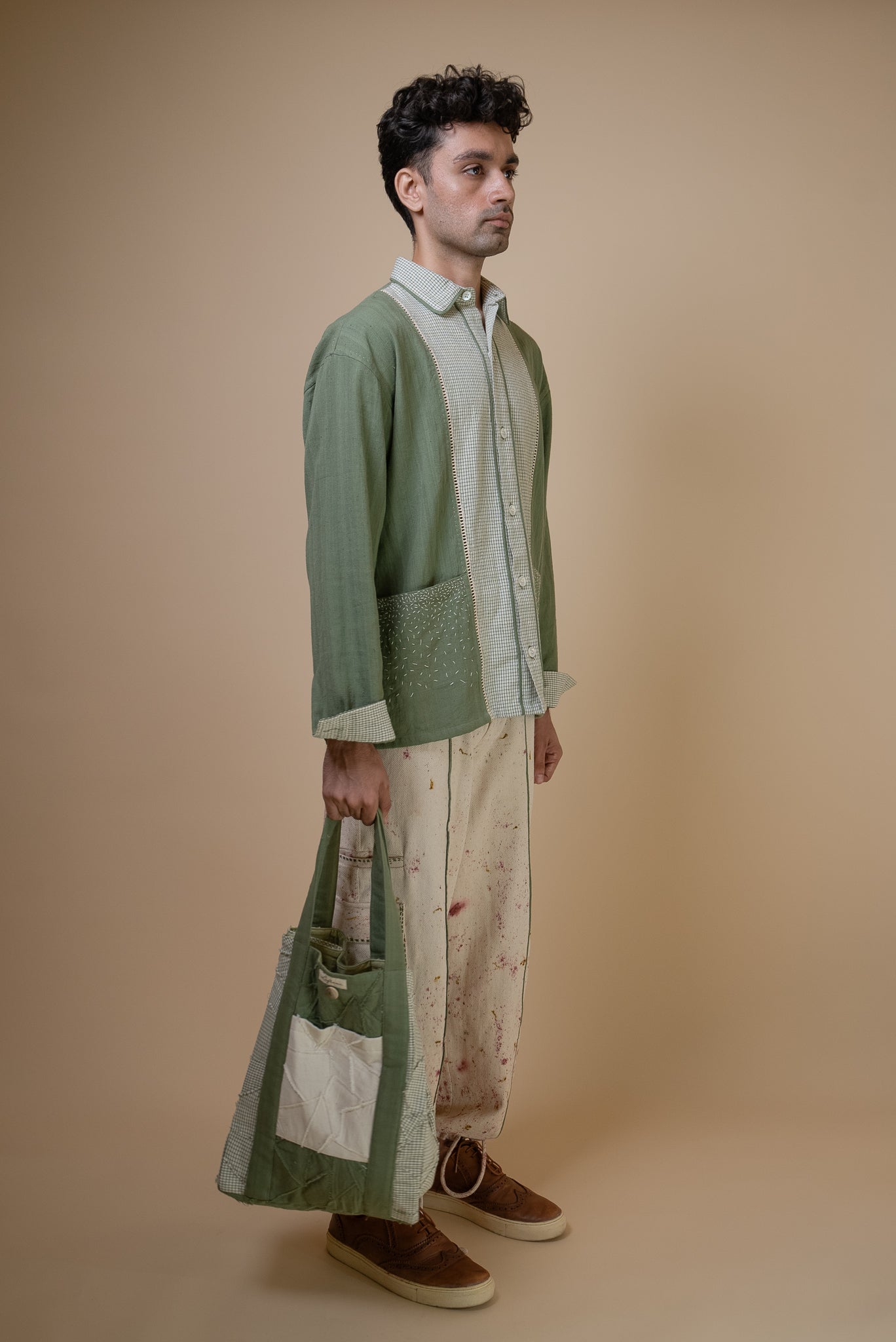 This classic silhouette is elevated with thoughtful details- olive piping runs along the placket and collar, while delicate lace detailing highlights the front color-blocking. The foldable cuffs reveal the check pattern when rolled, adding a subtle contrast. Big patch pockets add a functional touch, with traditional Kantha stitching flowing along the front panel and cuffs. Scattered Kantha details on the pockets further enhance its textured, handcrafted finish.