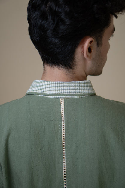 The Meadows Melange Shirt is crafted from a blend of our signature Kala Cotton- solid and checkered, both dyed in a soothing olive colour using azo-free dyes. Made from 100% cotton fibers, this shirt transitions seamlessly through the seasons, making it a versatile addition to any minimalist wardrobe with its refreshing yet cozy tone.