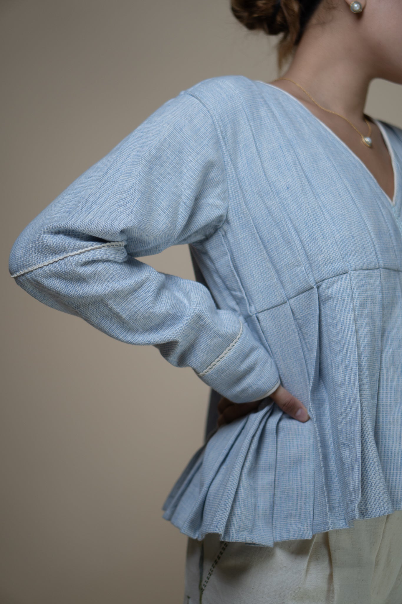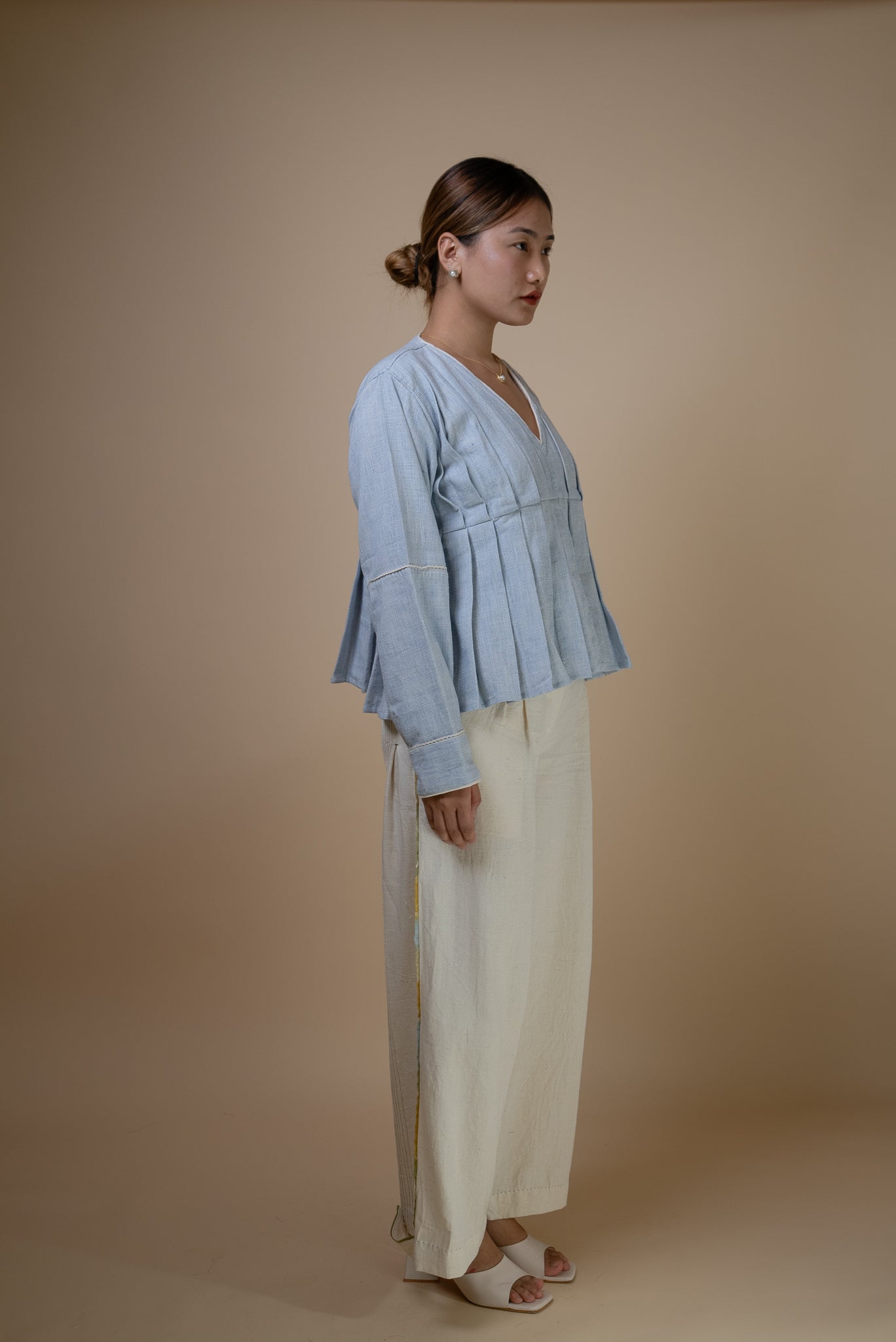 Crafted from 100% cotton fibers and natural materials, the Meadows Pleated Blouse combines azo-free dyed handwoven blue cotton with a hint undyed Kala Cotton.