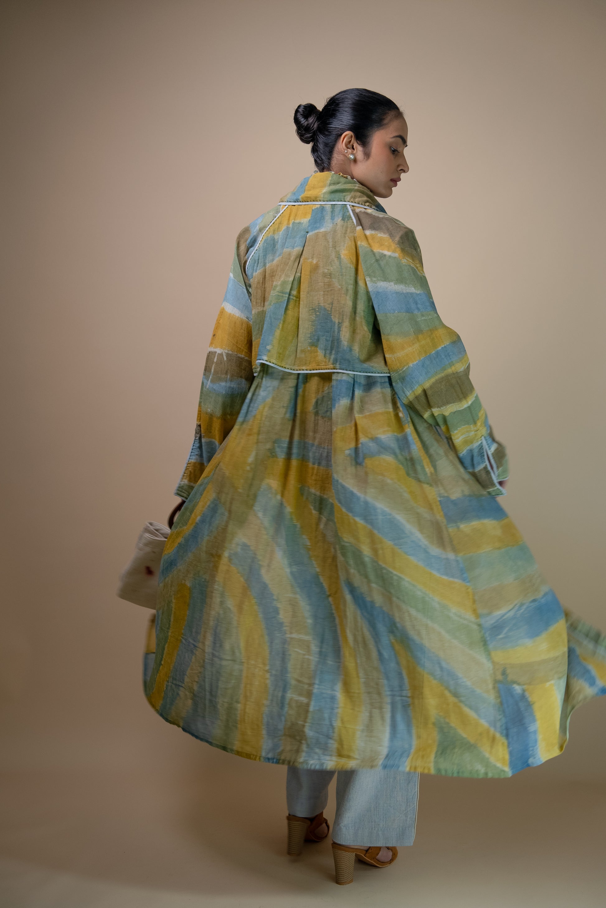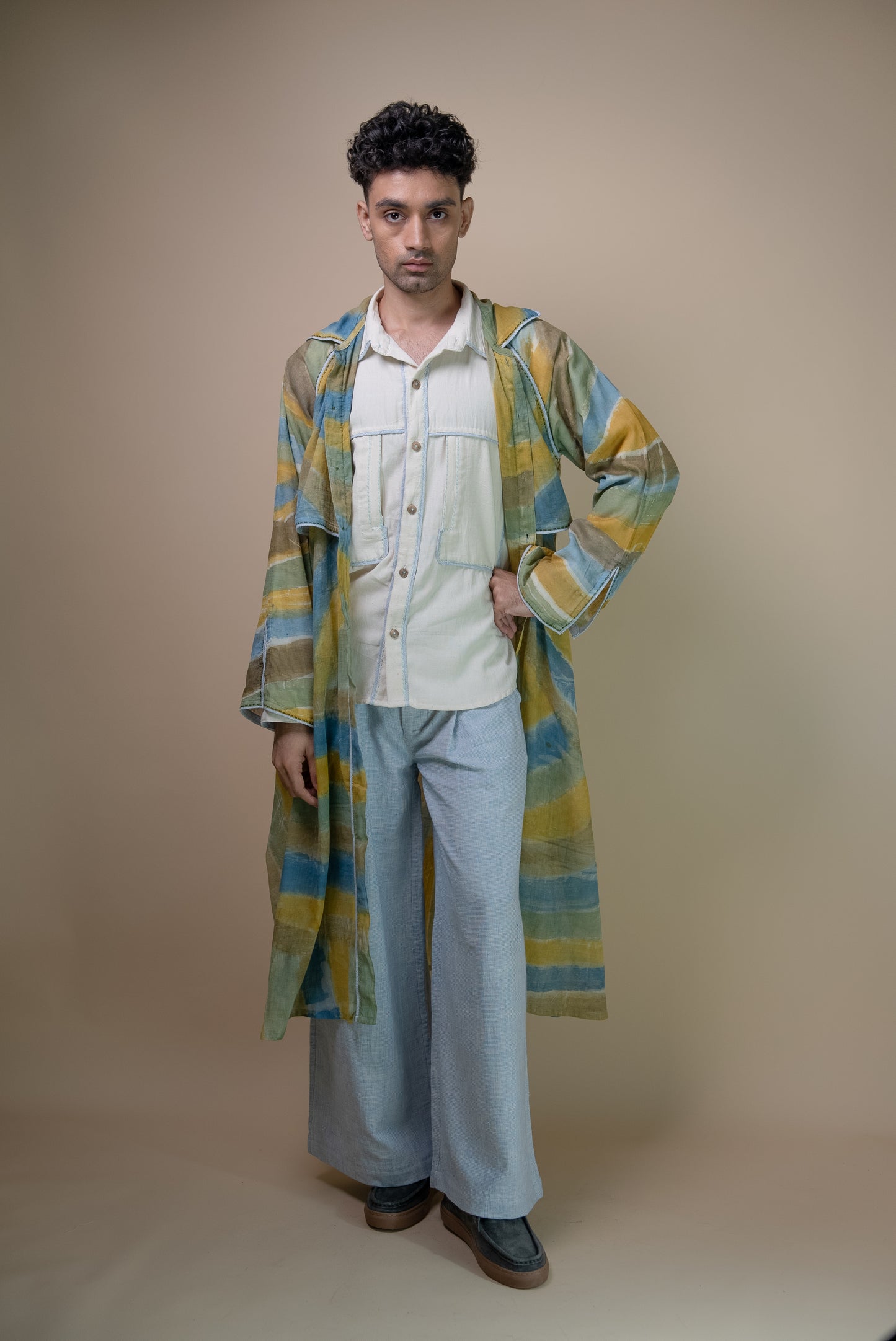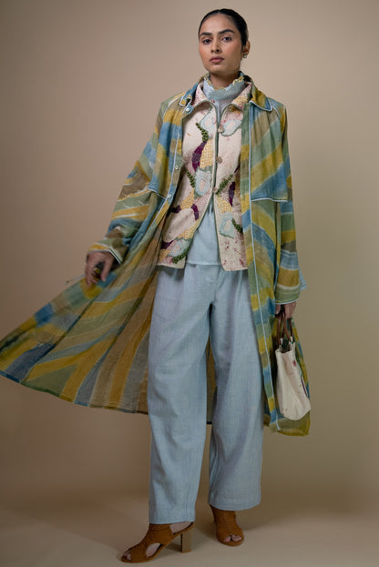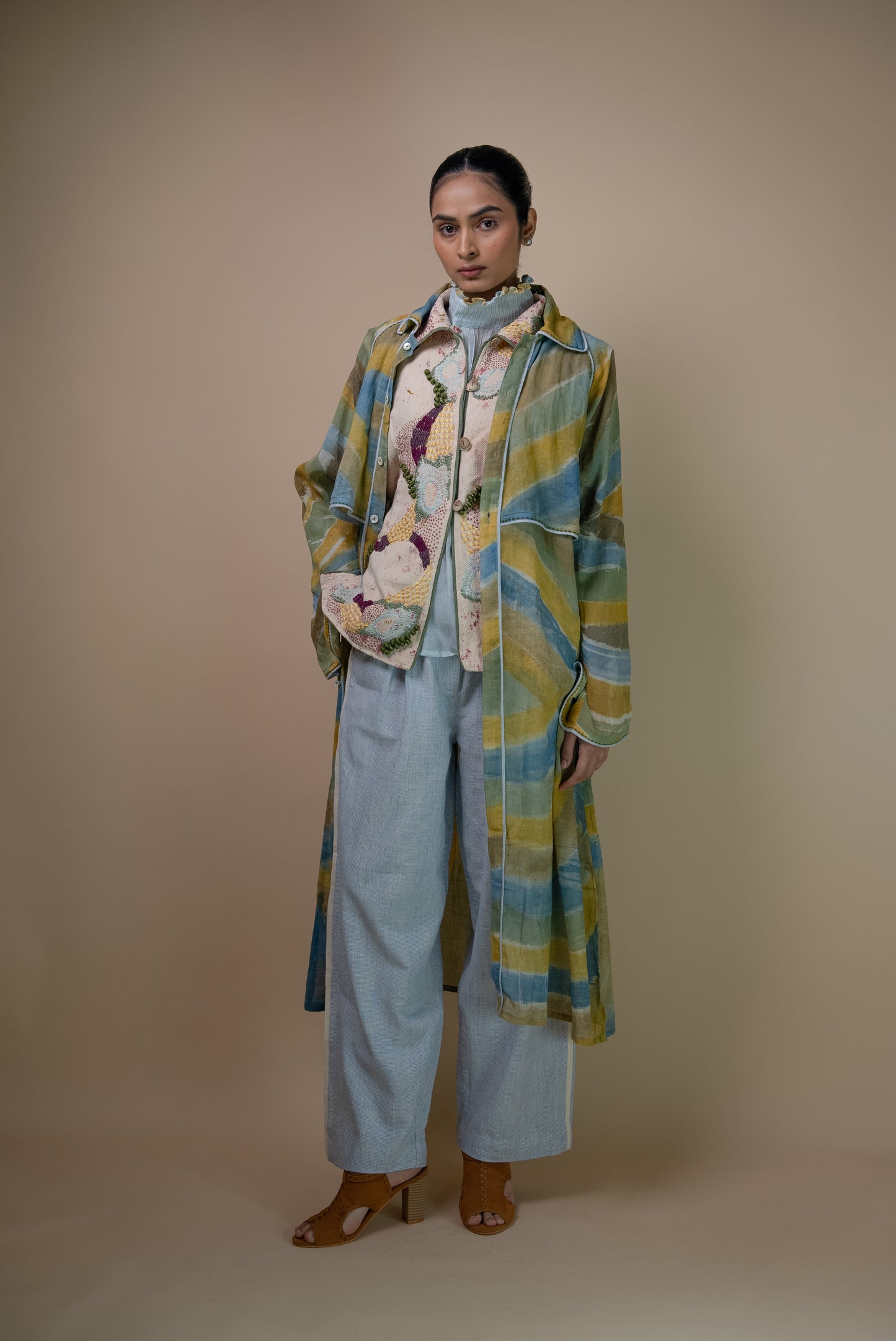 Crafted from 100% cotton fibres and natural materials, the Meadows Hand Painted Trench is made from soft mulmul, hand-painted using natural dyes from indigo, iron; and marigolds collected from temples and repurposed into dyes.