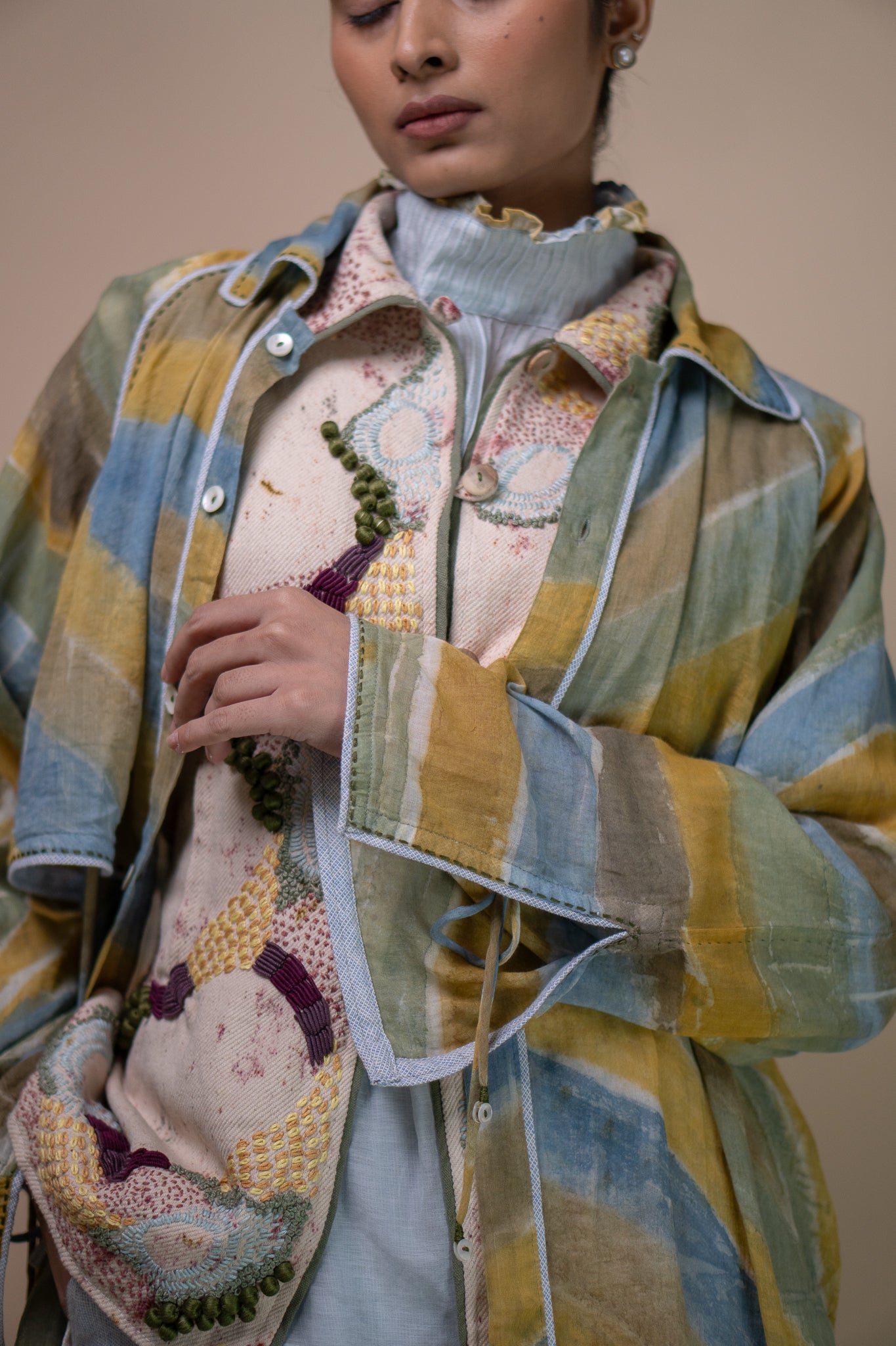 Kantha embroidery adds texture to the intuitive brushstrokes on the fabric. The back is designed with generous box pleats for a breezy, light silhouette, while the wide sleeves incorporate slits for added movement.