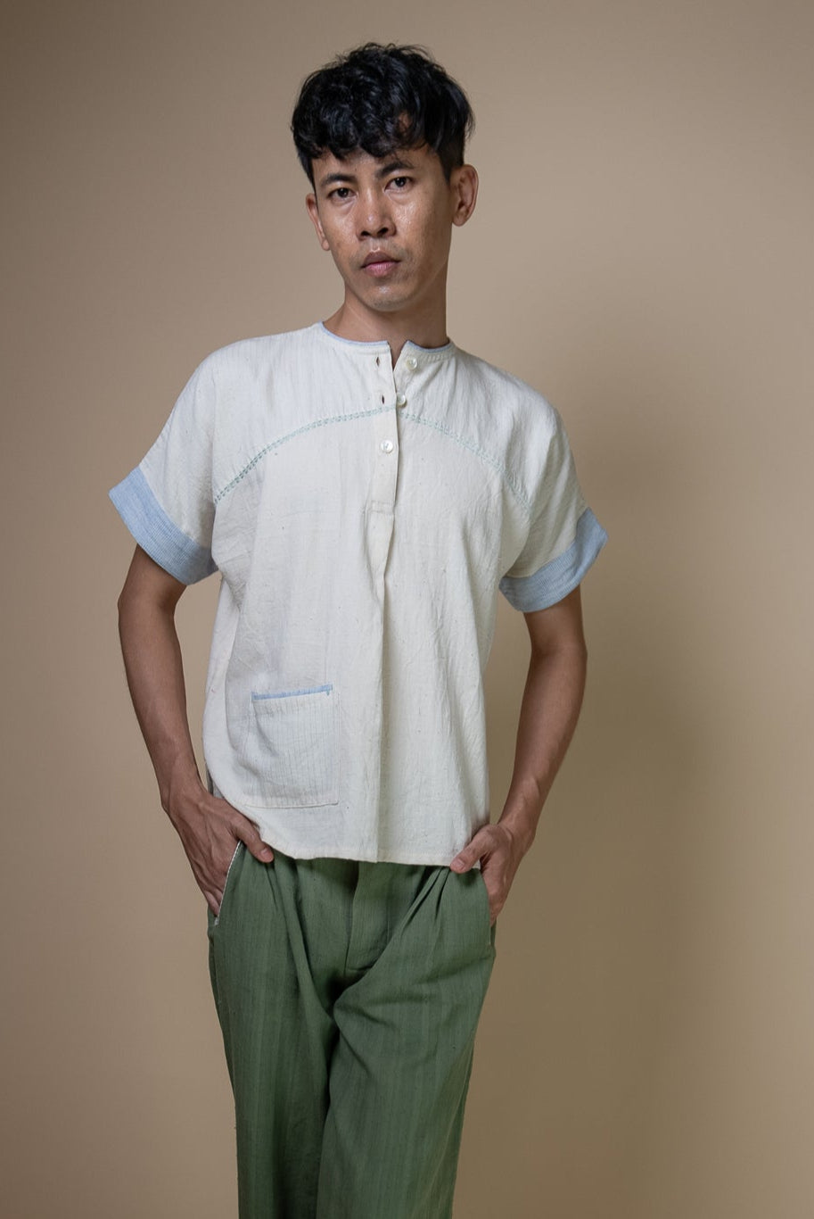 This minimal shirt features wide sleeves, a round neckline, and yoke detailing for a relaxed yet sleek look. A functional patch pocket, along with intricate hand-embroidered Kantha lines along the yoke and neckline, add to this simple piece making it a versatile separate or ideal for layering.