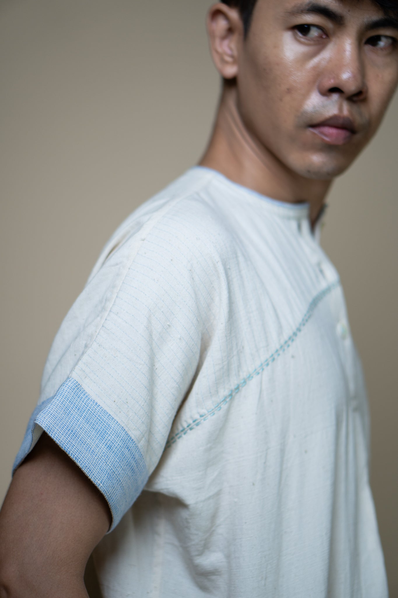 Crafted from 100% cotton fibers and natural materials, the Meadows Unisex Yoke Detail Shirt features a effortless combination of azo-free dyed blue handwoven cotton and undyed Kala cotton.