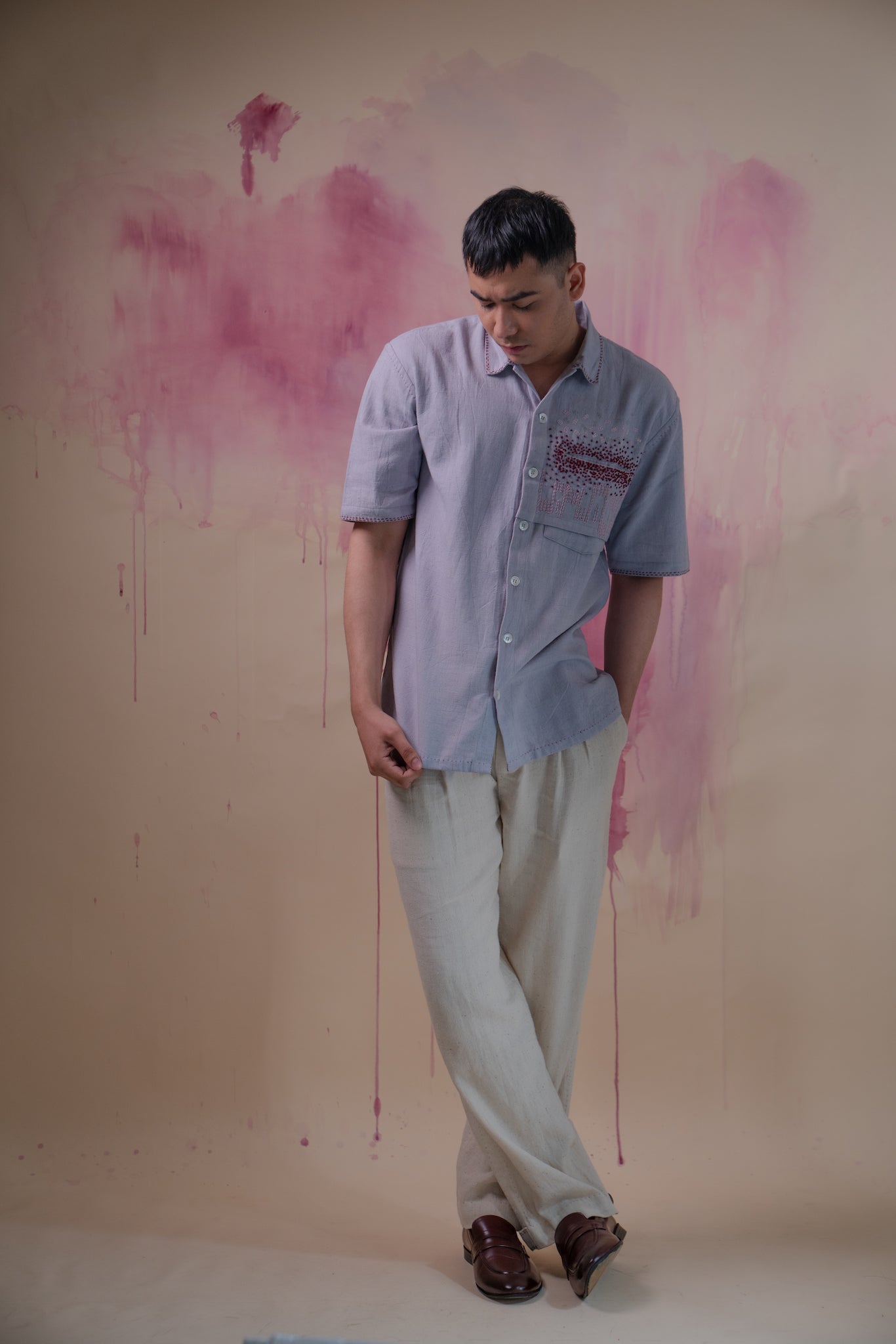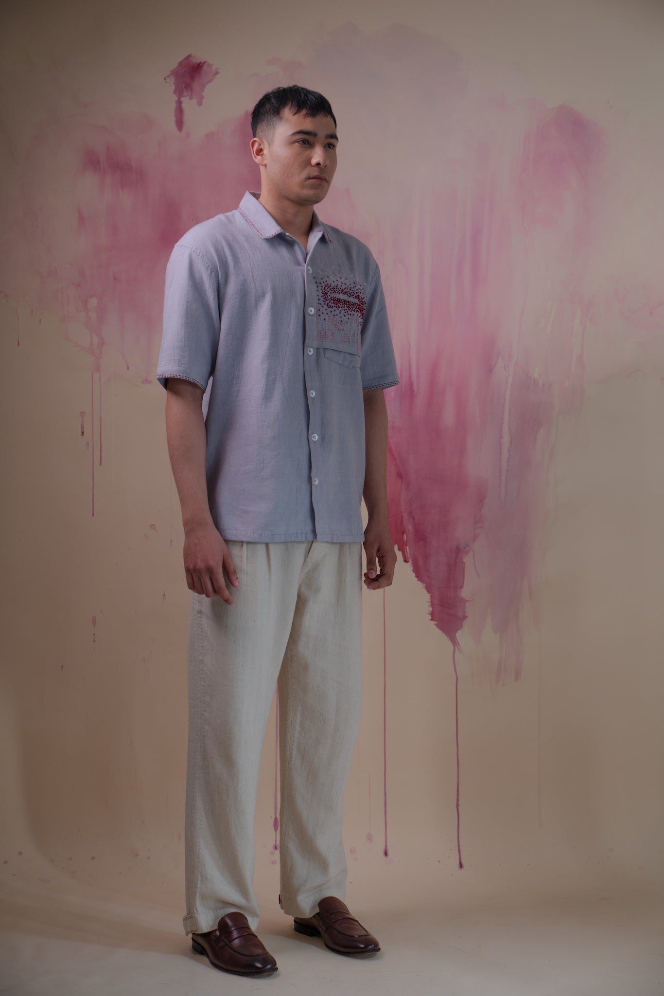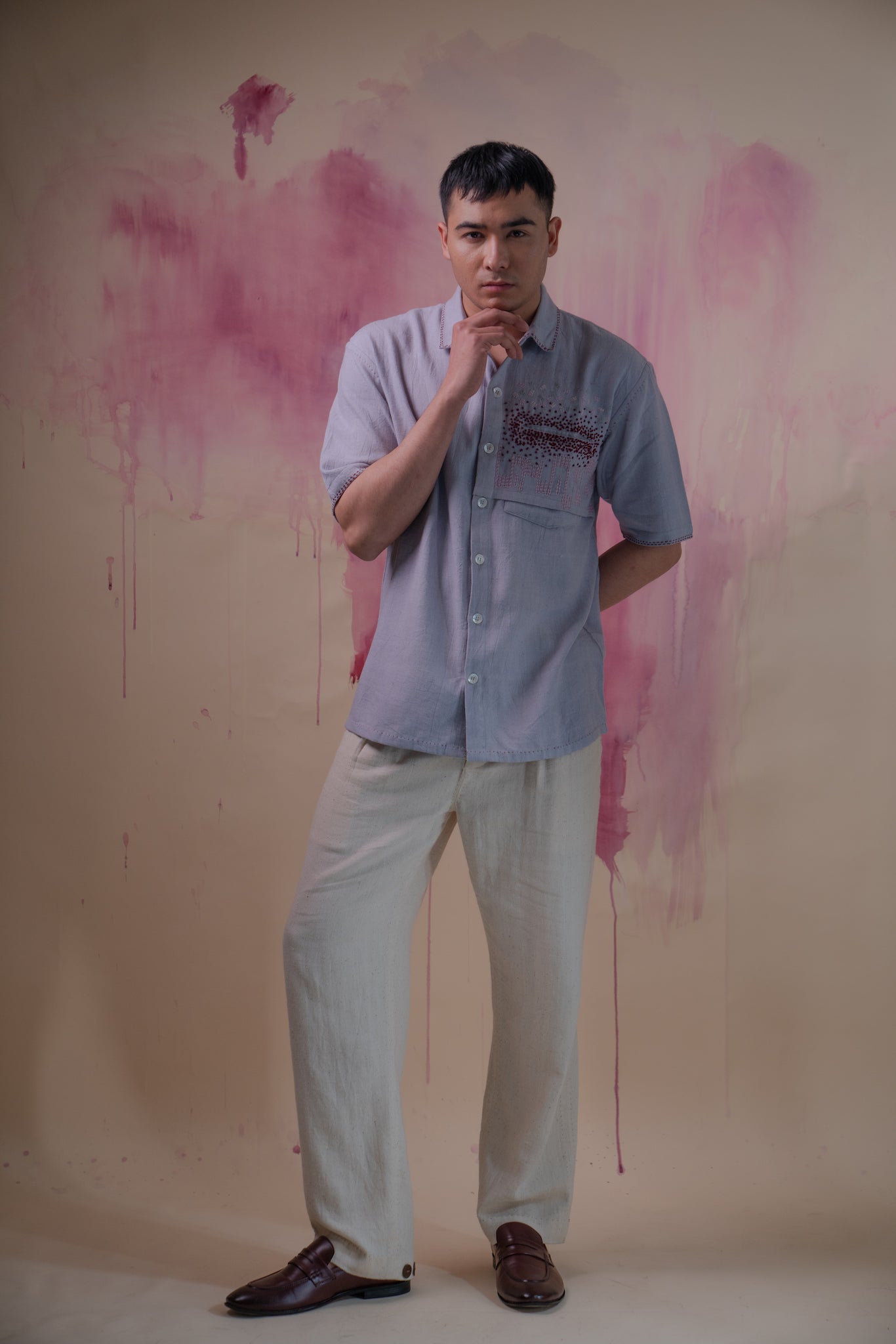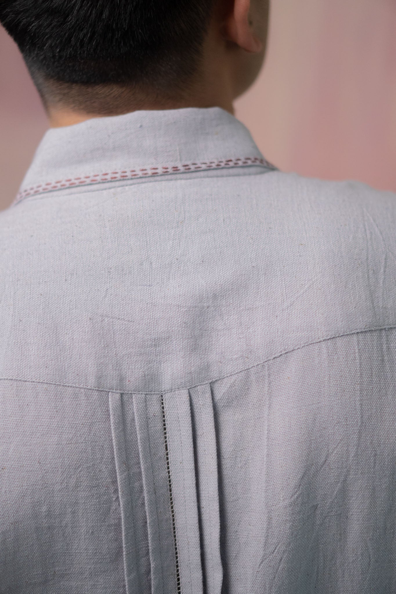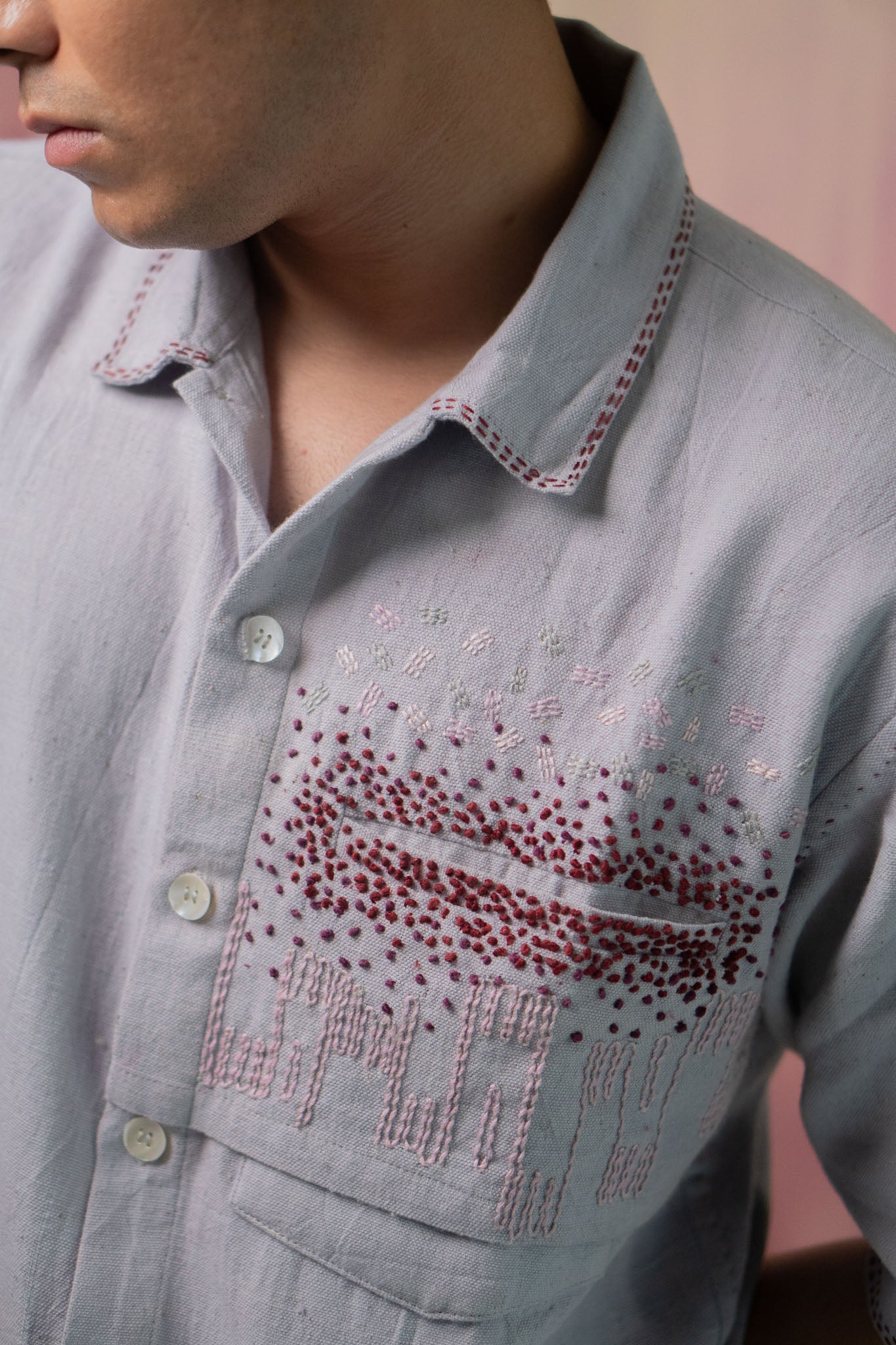 Introducing our most loved shirt silhouette, a timeless classic with a modern twist. This spread collar shirt in a light grey hue with a pop of color seamlessly integrated through intricate embroidery is truly a must have. The extra fabric flap on the pocket is adorned with a mix of Couching, Kantha and French knots in shades of maroon, plum, pink and grey.