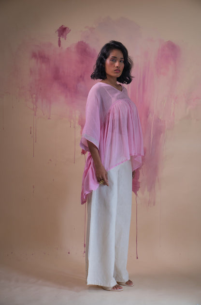 This free-size silhouette follows a mindful approach with minimal wastage in its boxy design, the blouse is reversible and delicately transforms into an asymmetrical gathered blouse when relaxed.
