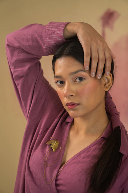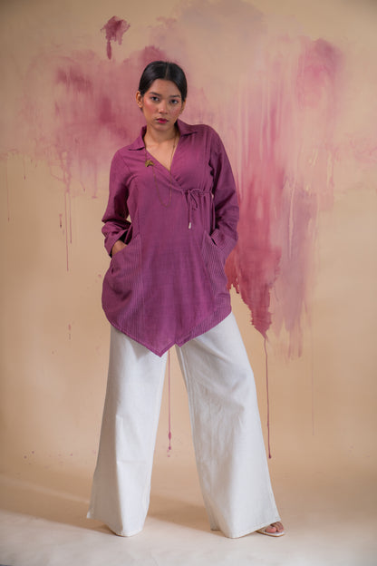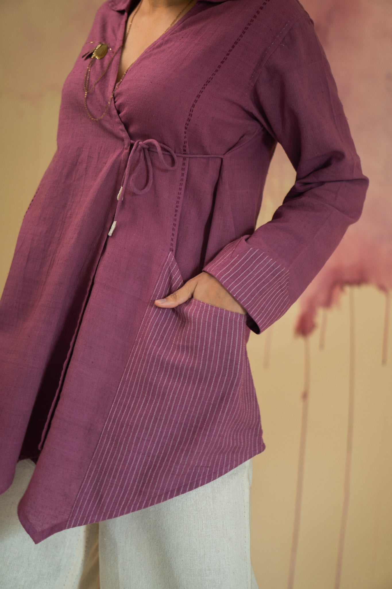 Effortless elegance meets asymmetry in this plum overlay. Enclosed with tie-ups, its easy silhouette boasts spacious pockets and stitch line detailing in a striking contrast of white, creating a look that blends functionality and style.The cuffs, adorned with stitch lines also serve as a captivating highlight.
