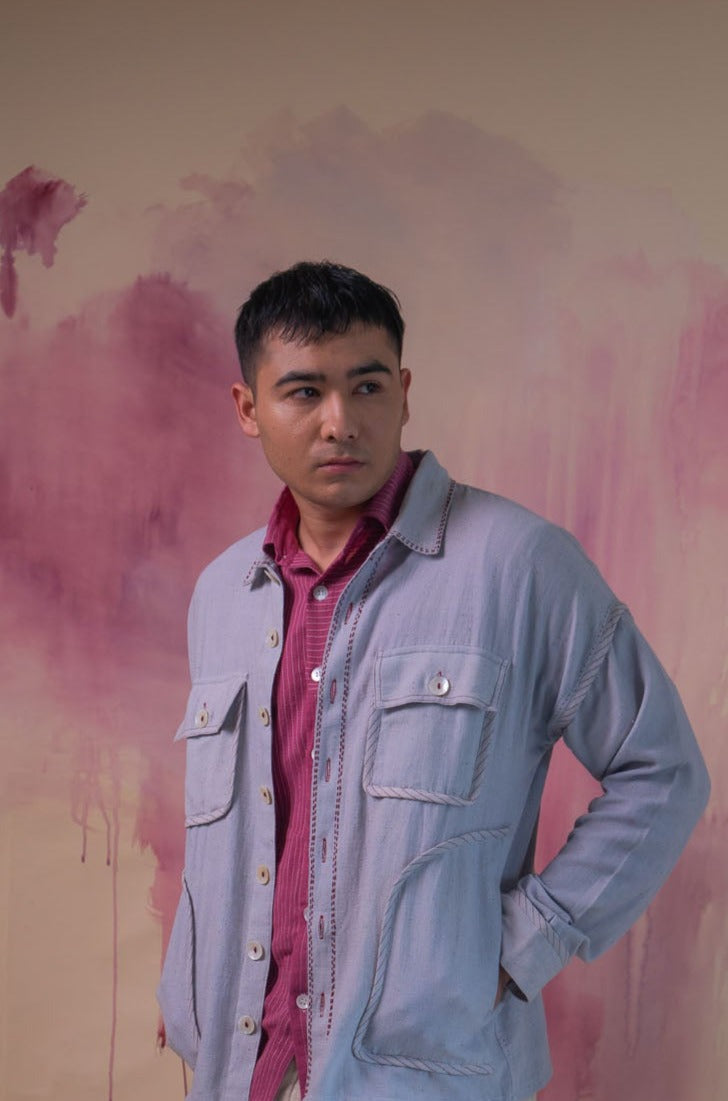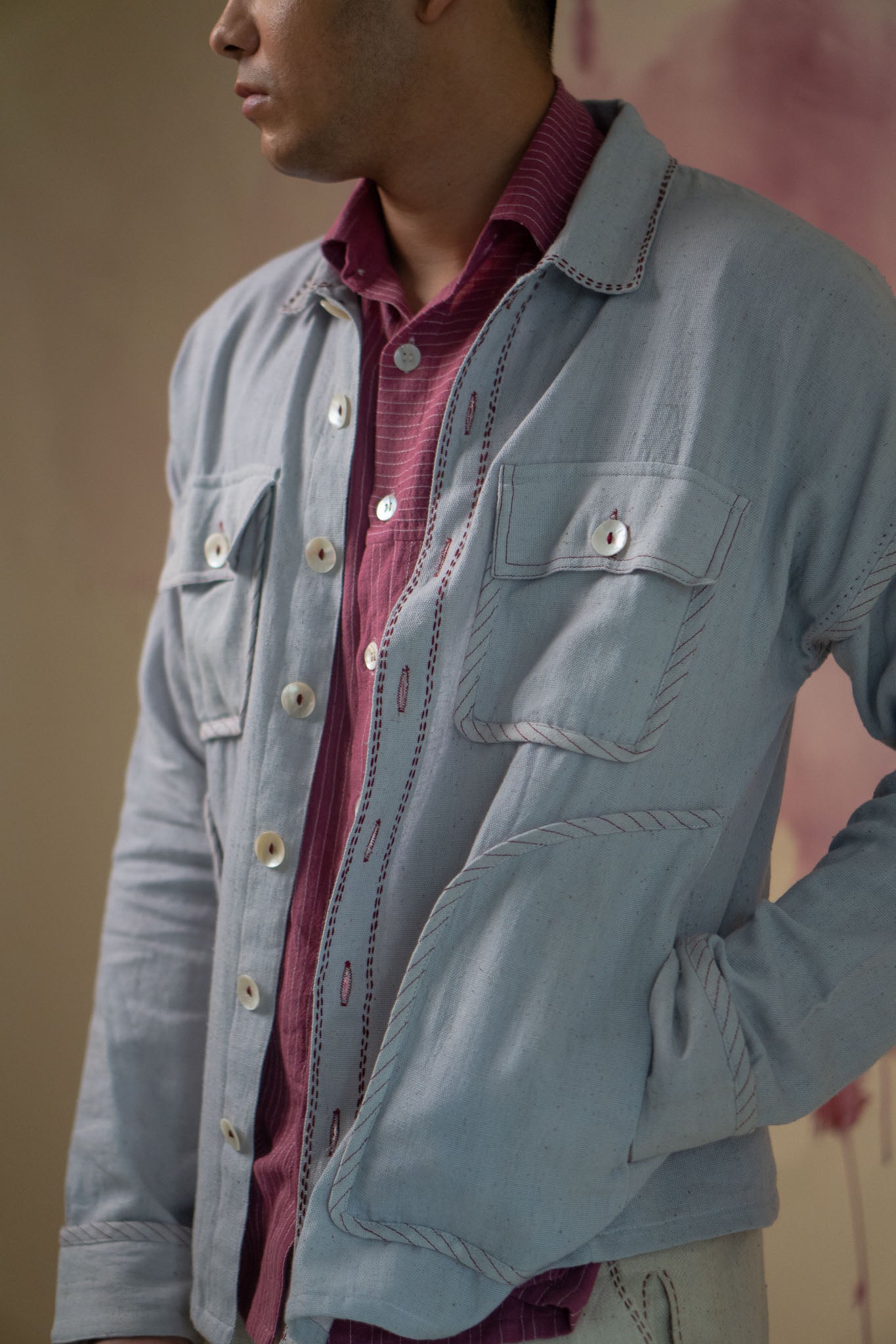 This sophisticated grey jacket features both regular and curved patch pockets, elevating its classic Bomber style. The pockets are not only stylish but also functional, providing practical storage space for your essentials.The cuffs and pockets are meticulously highlighted with a maroon bias tape finish with maroon stitch lines. Kantha stitches enhance its clean and understated features.