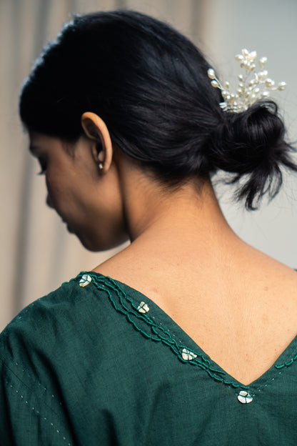 Crafted in 100% cotton fibres and natural materials. The 60s organic cotton reversible silhouette comes with a buttoned-down boat neck on one side and a V-neck on the other. The adjustable drawstring on the waist allows you to manipulate the blouse to your style and fitting. Featuring bullion knots and the embellishment of uncut mother of pearl buttons along the neckline, it adds a hint of delicate allure. The feature of reversibility is an element of multi-functionality involving the wearer in the process of choice and interchangeability.