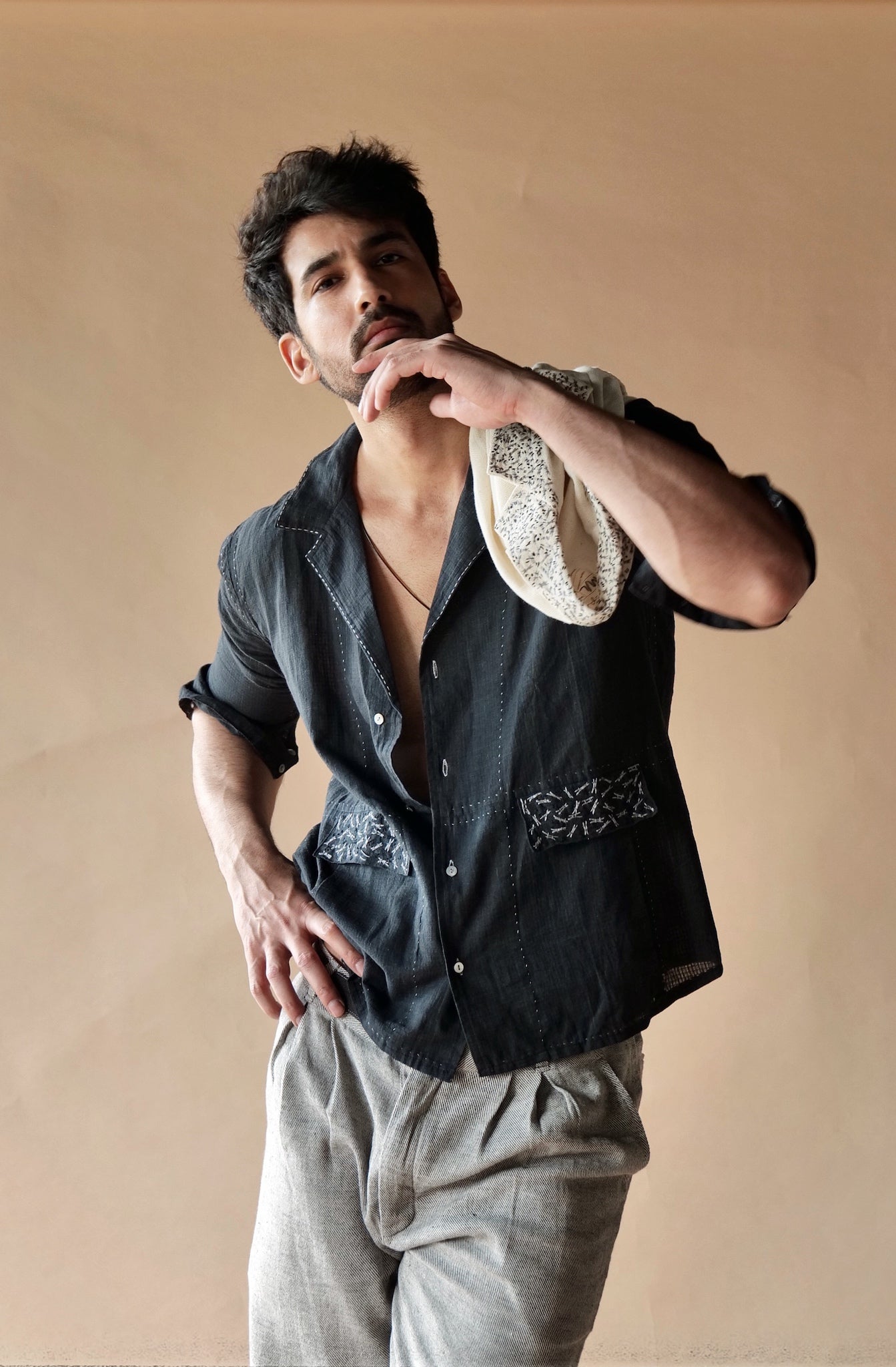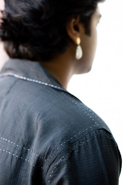 Replete with a spread collar, this self-checked black shirt makes a breezy must have for any summer wardrobe. This light and breathable cotton shirt adorned with a modern take on classic running stitches and French knots on the flaps.