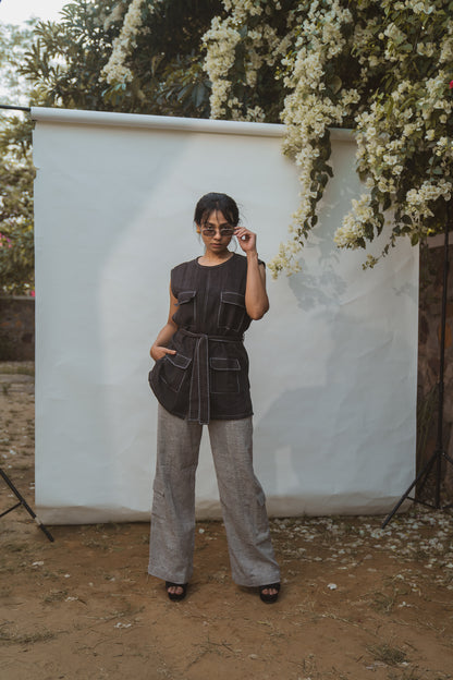 The Kala Cotton Unisex Vest comes with a round neck and four patch pockets. It is adorned with stitch lines and stitches of Kantha, a form of Indian hand embroidery along the patch pockets and belt. It has an adjustable and removable belt as an element of multi-functionality.