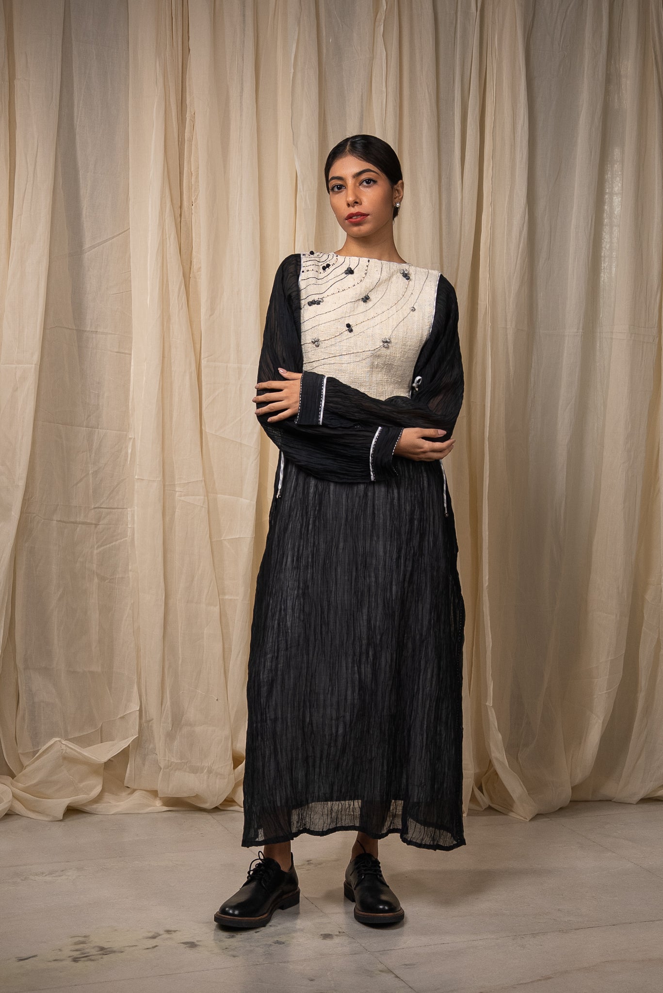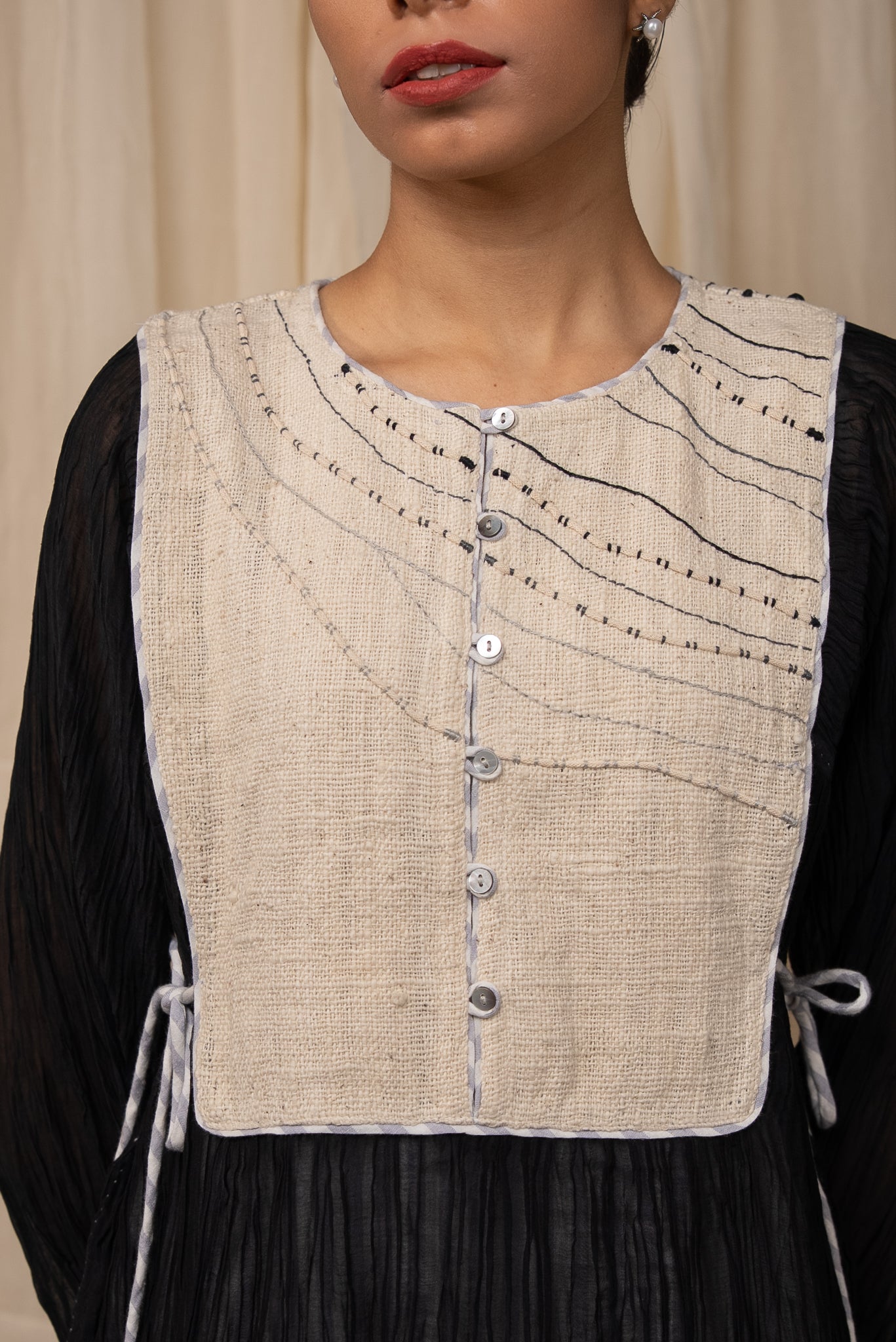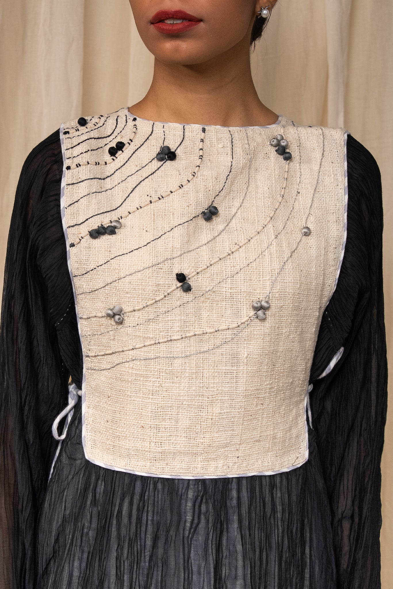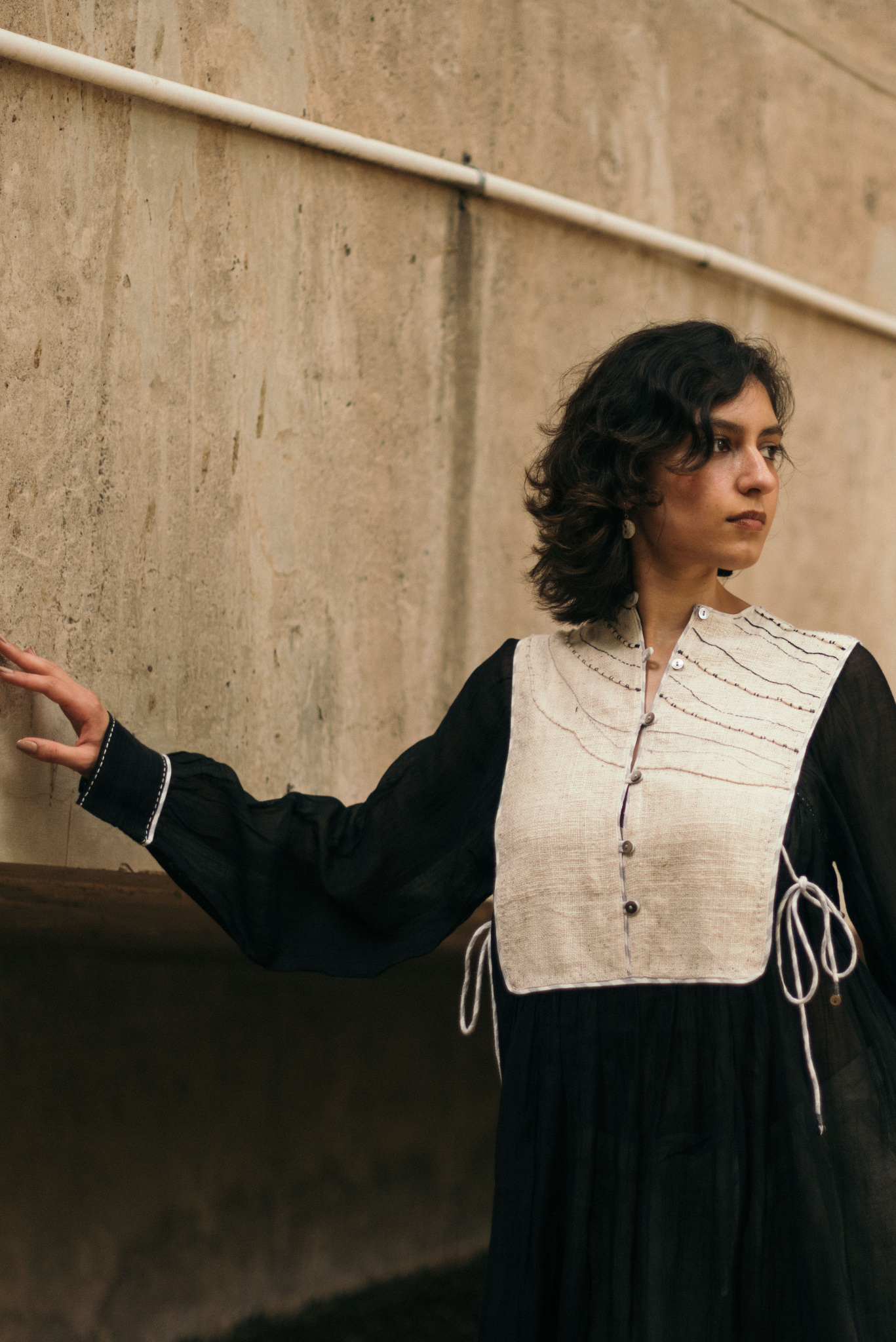 Crafted from handwoven Chanderi and natural materials, this Reversible Dress combines undyed, unbleached zero-count cotton with azo-free dyed Midnight Black Chanderi. The structured bib-like panel in zero-count cotton features hand embroidery of organic rings from our logo - rendered through beads, couching, Kantha, and backstitch variations.
