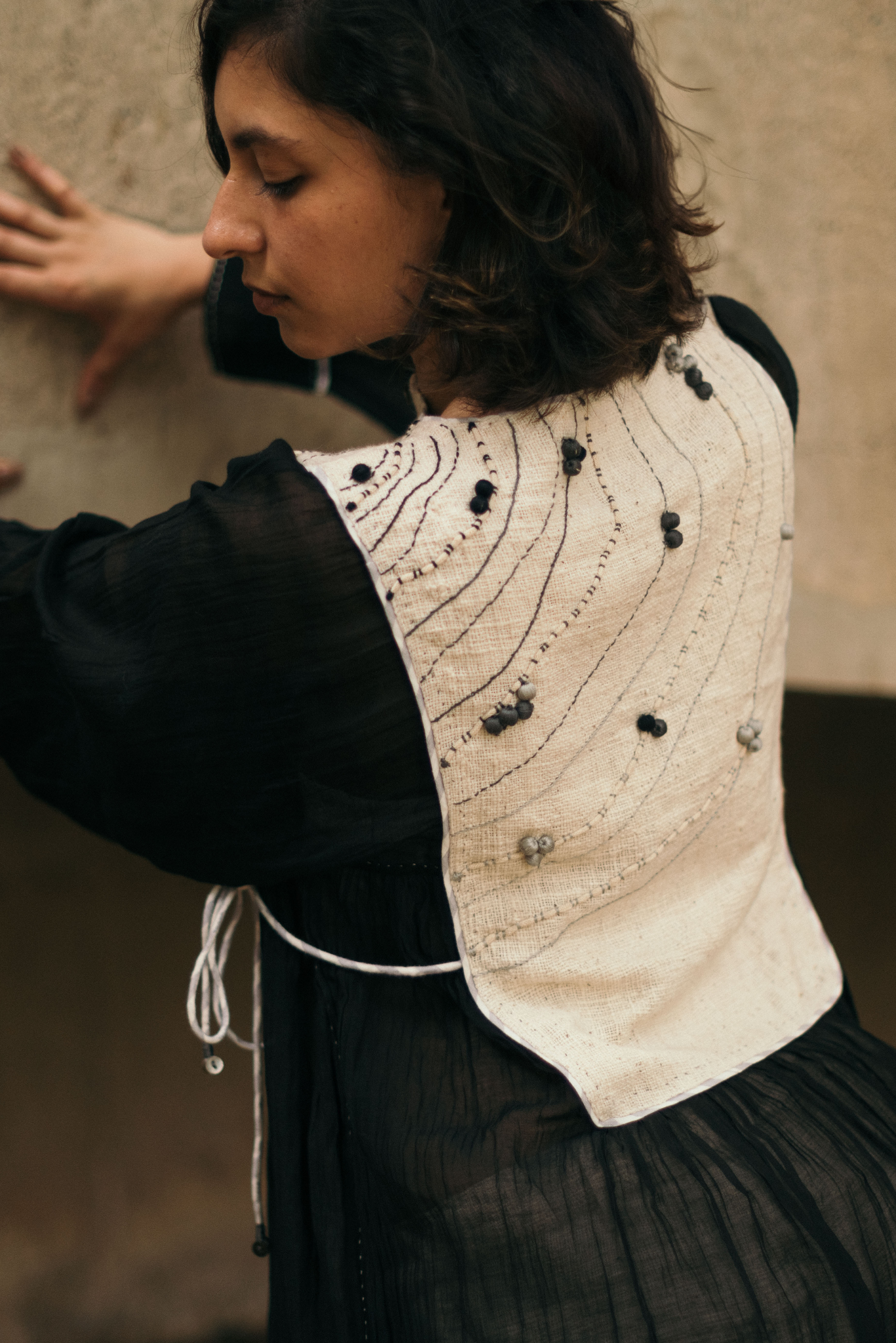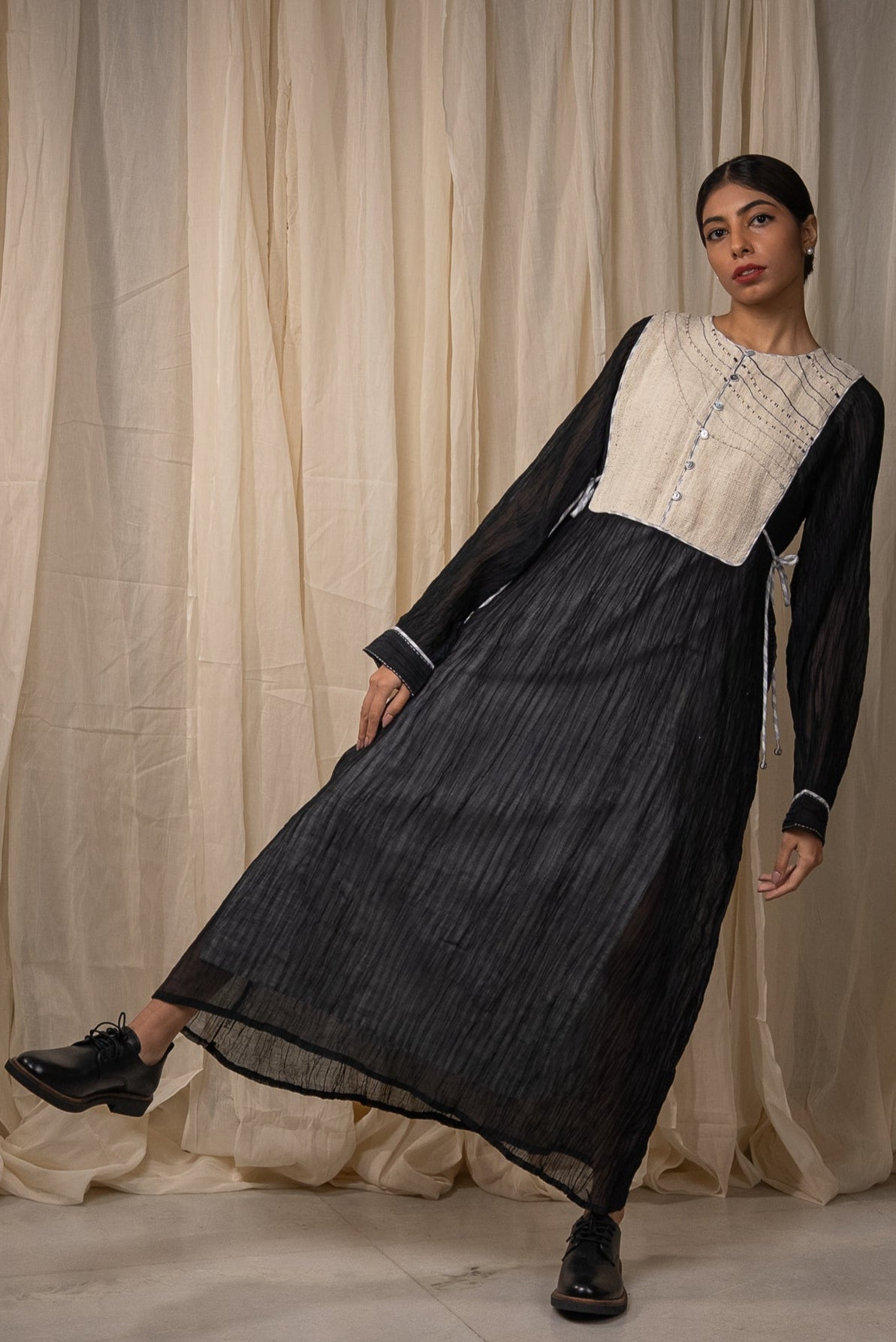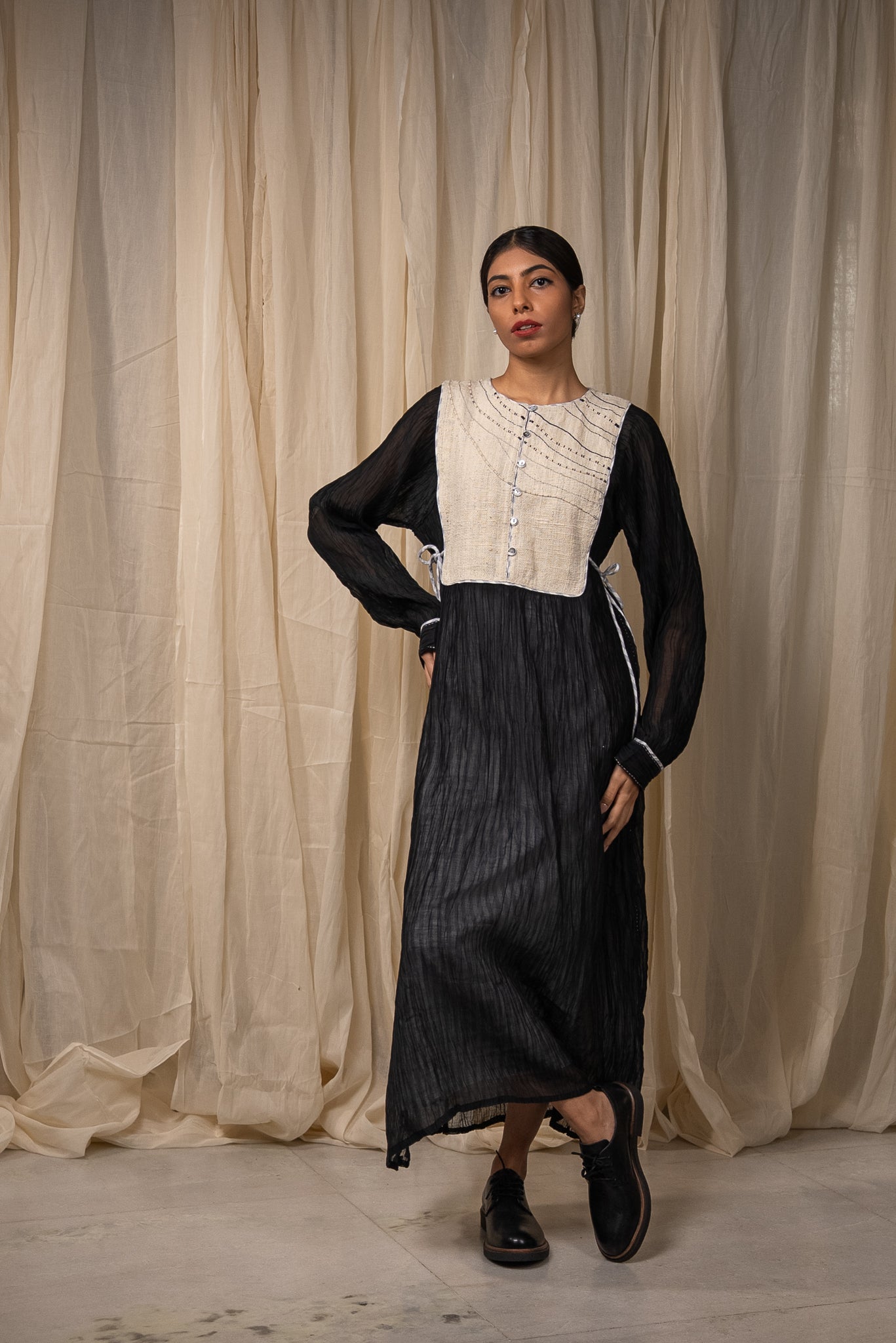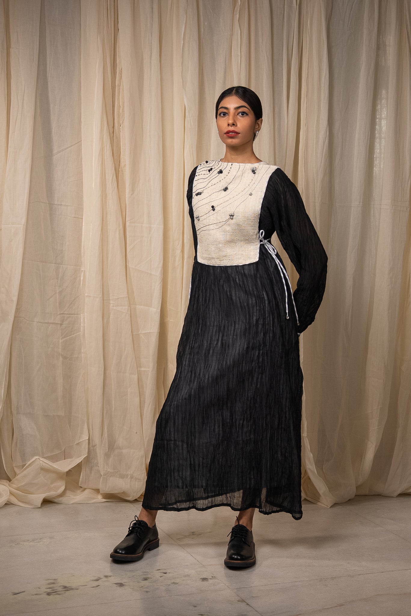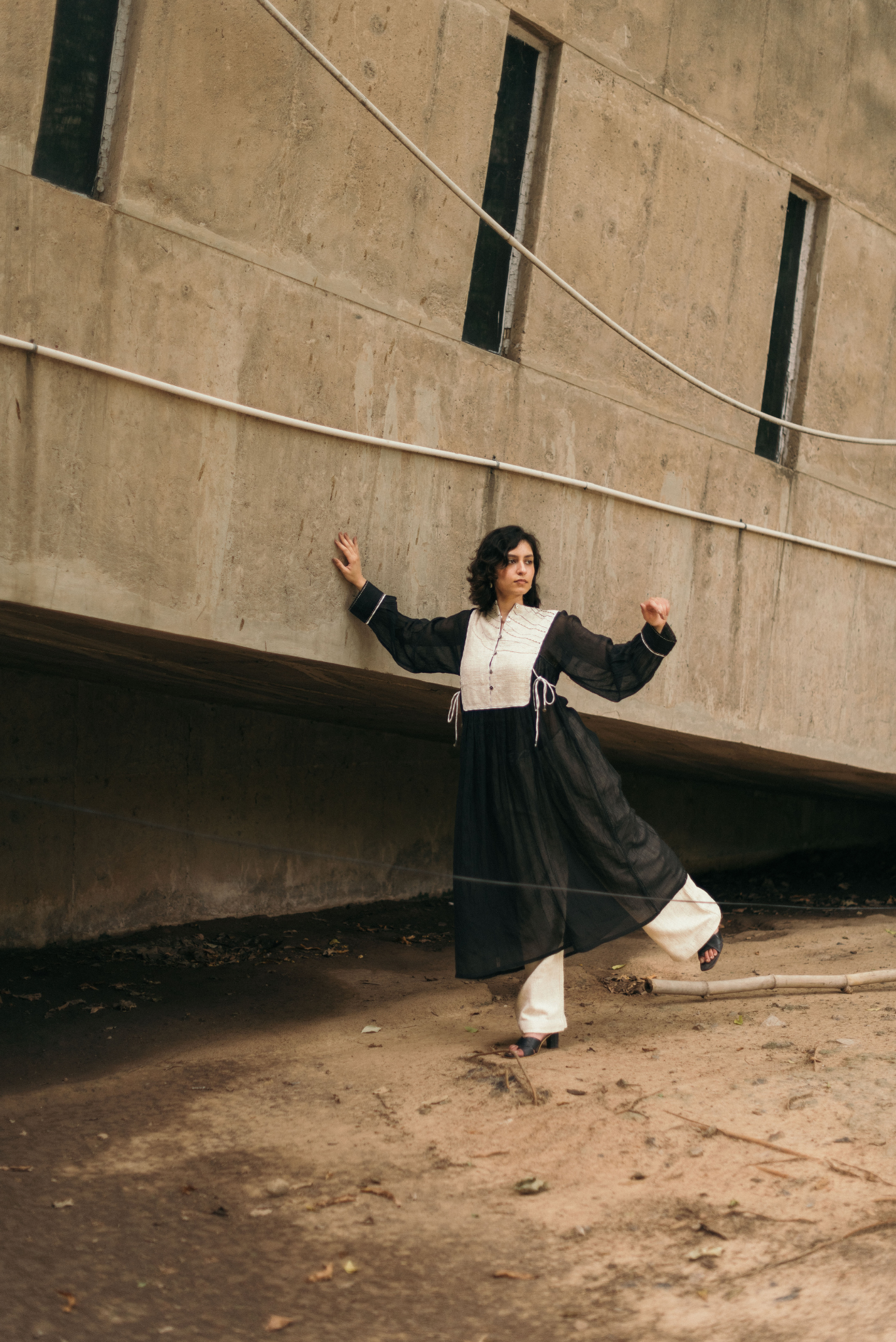 Crafted from handwoven Chanderi and natural materials, this Reversible Dress combines undyed, unbleached zero-count cotton with azo-free dyed Midnight Black Chanderi. The structured bib-like panel in zero-count cotton features hand embroidery of organic rings from our logo - rendered through beads, couching, Kantha, and backstitch variations.
