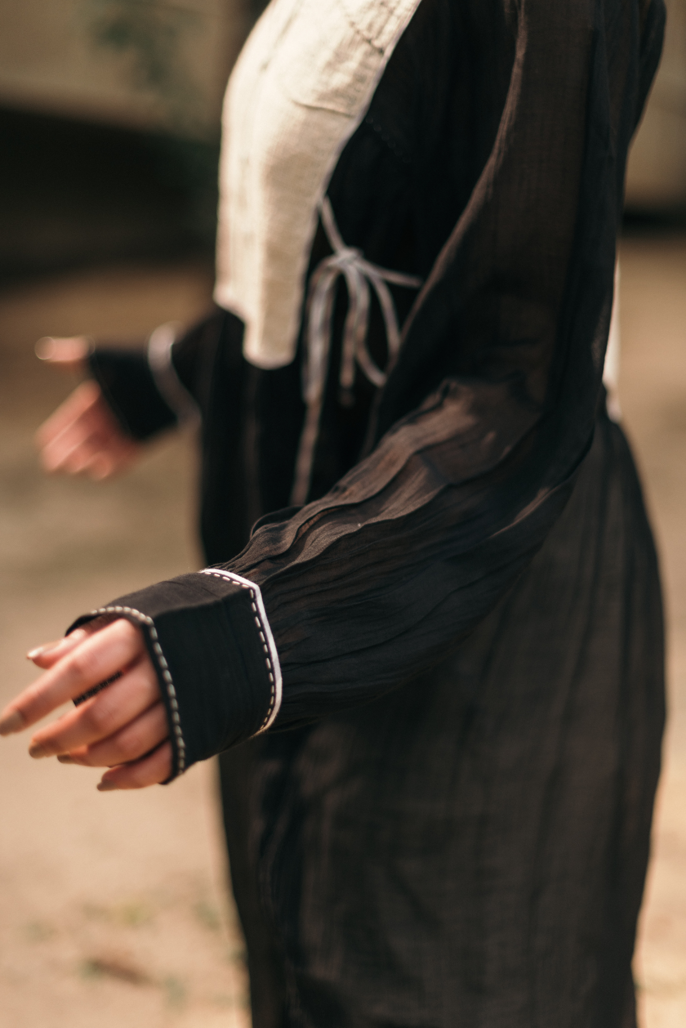 The bib fastens with loop buttons on one side and remains open on the other.Midnight Black Chanderi sleeves and a bottom panel offer lightness and contrast. Adjustable tie-ups on the sides allow for flexibility in fit. Reversible front to back, the piece offers multifunctionality and layered form.
