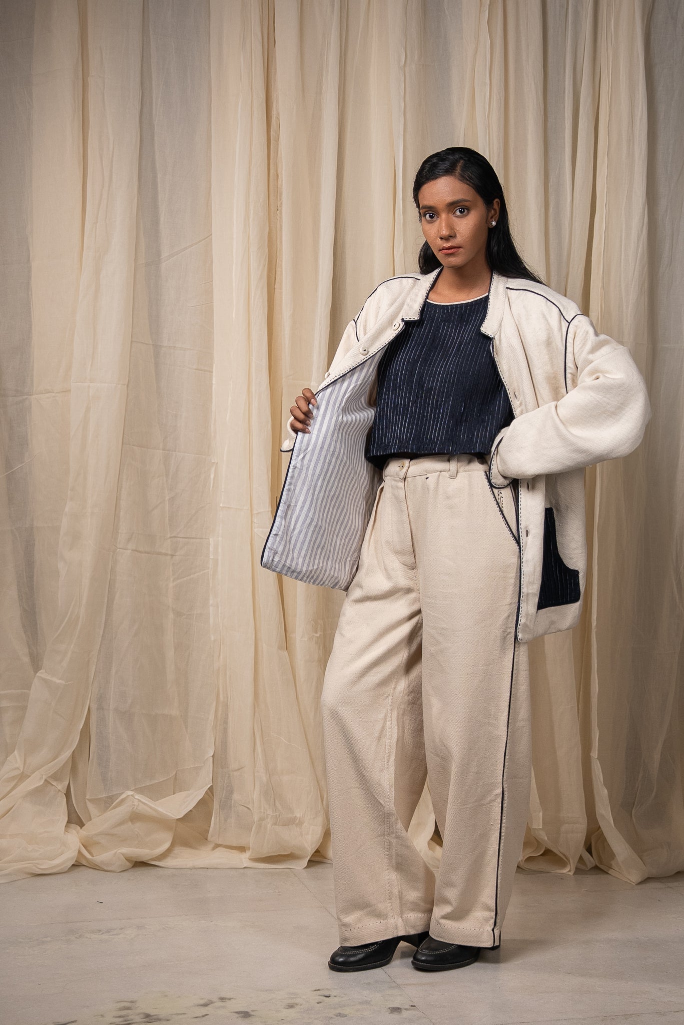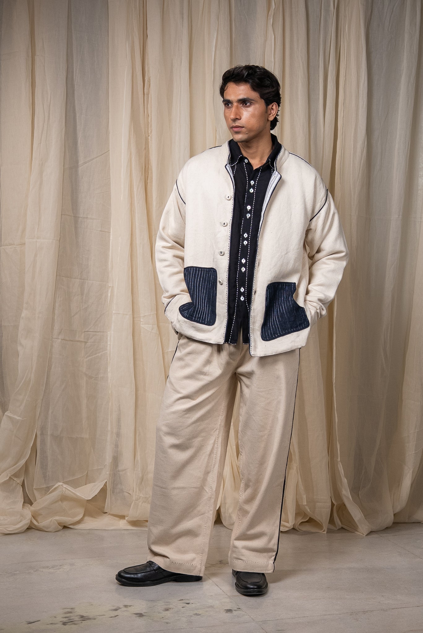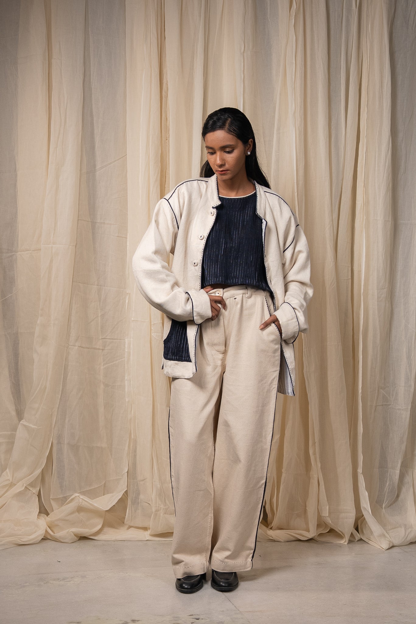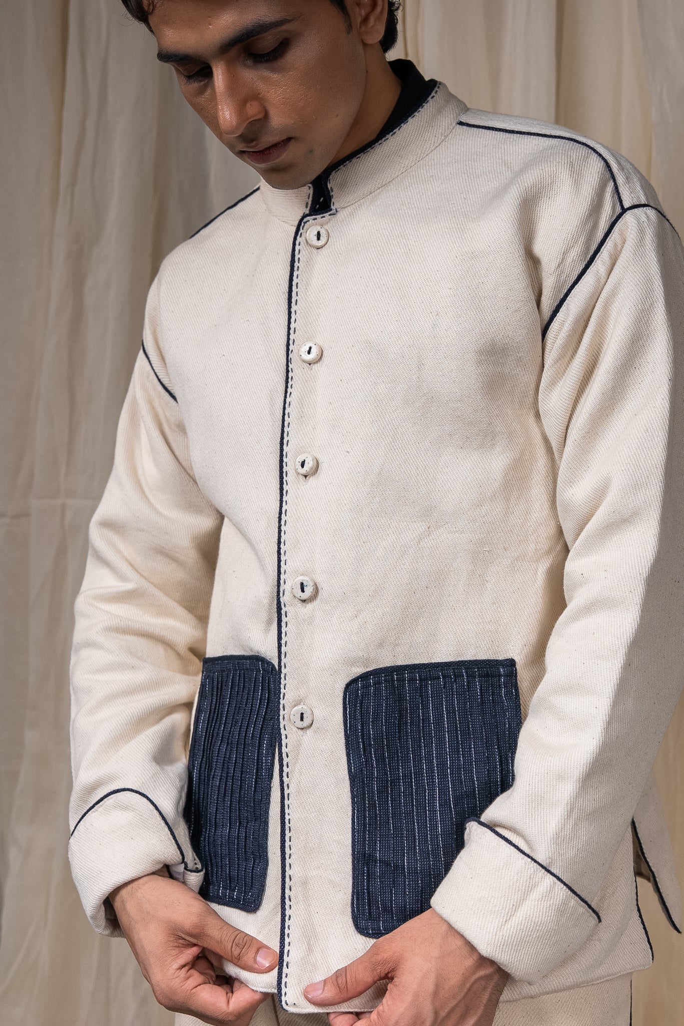 The silhouette features a Mandarin collar, side slits for ease, and broad cuffs finished with handwoven grey stripes and Midnight Black piping. Pockets in handwoven Midnight Black cotton are pintucked for subtle structure and contrast. Ceramic buttons complete the piece- adding a textural detail.