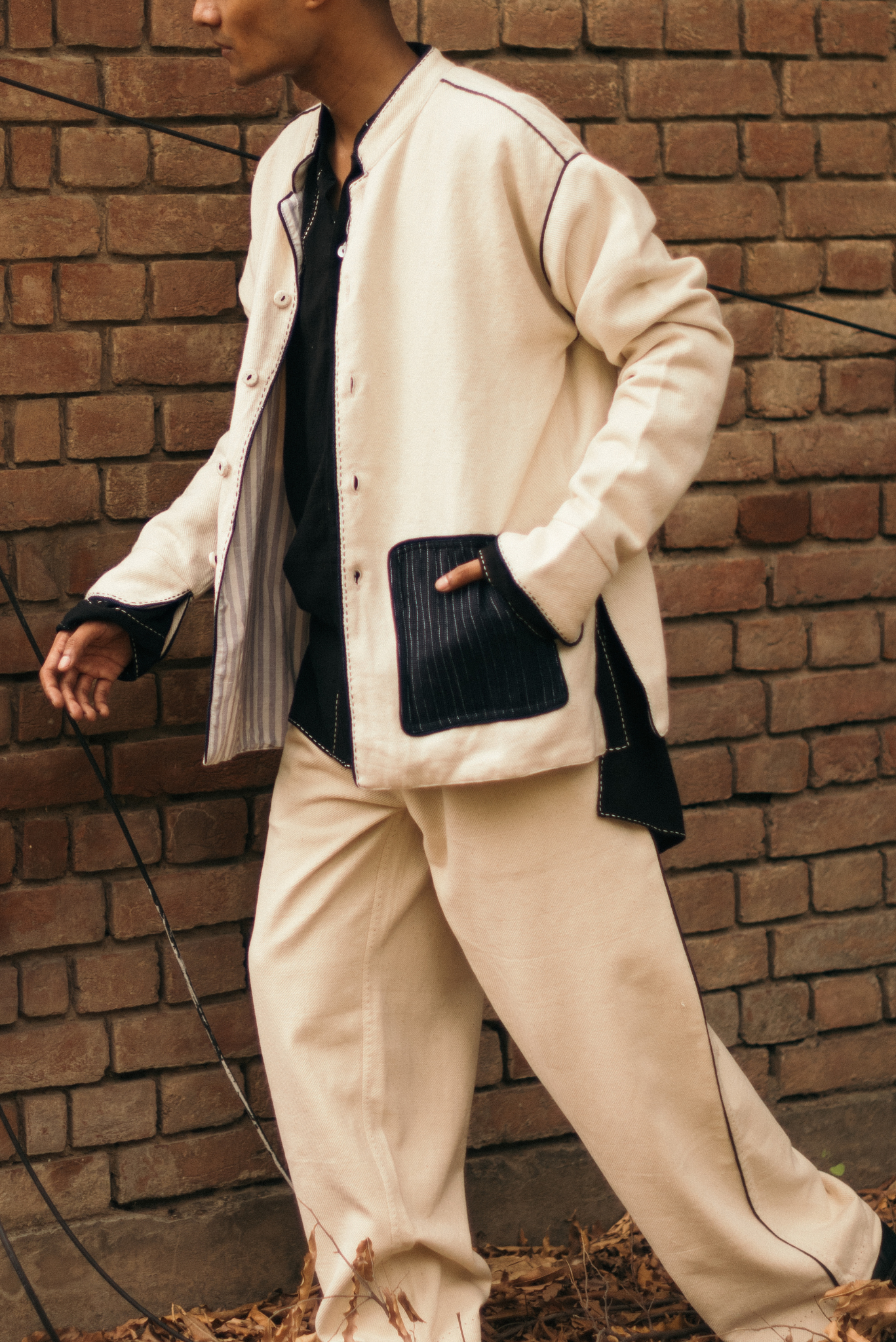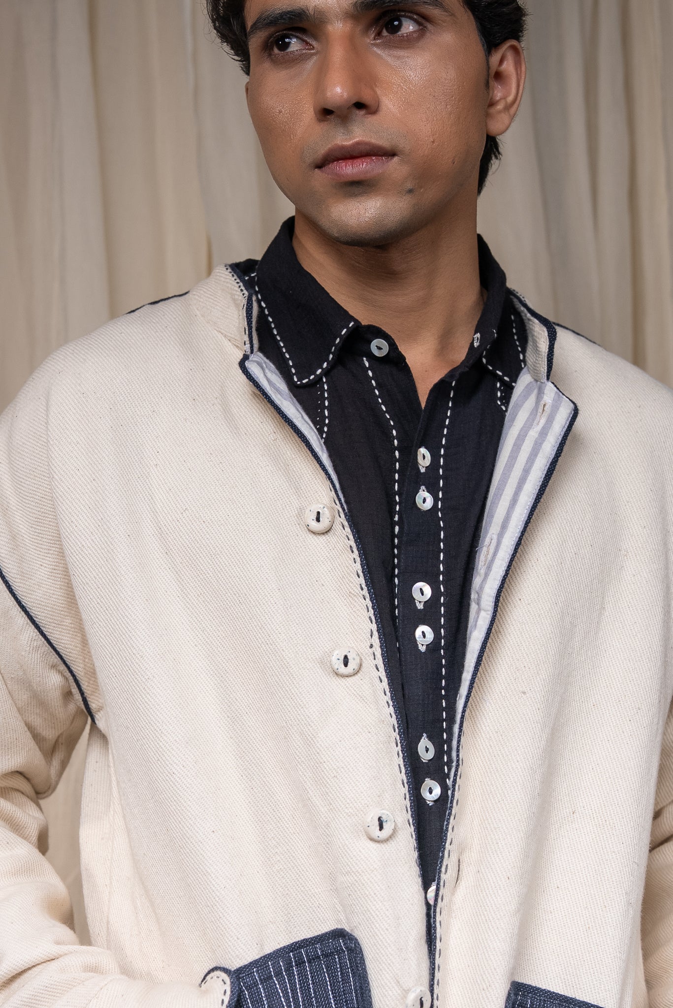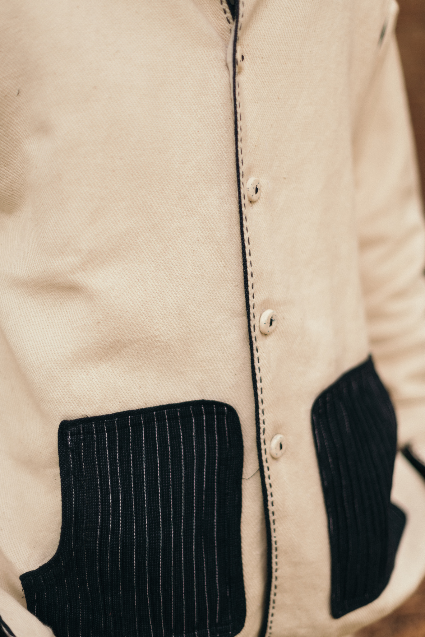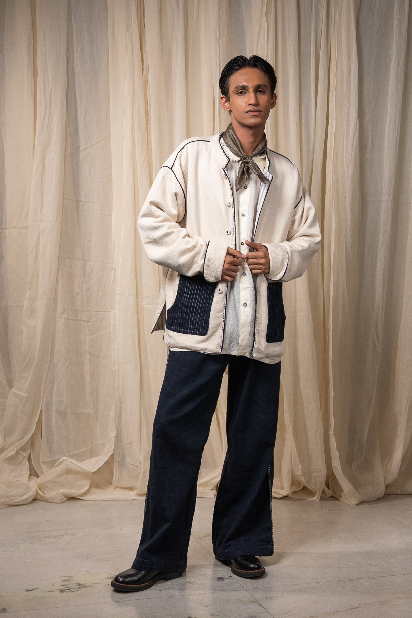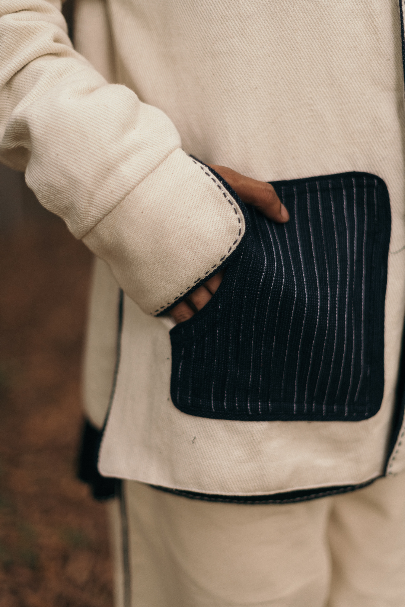The silhouette features a Mandarin collar, side slits for ease, and broad cuffs finished with handwoven grey stripes and Midnight Black piping. Pockets in handwoven Midnight Black cotton are pintucked for subtle structure and contrast. Ceramic buttons complete the piece- adding a textural detail.