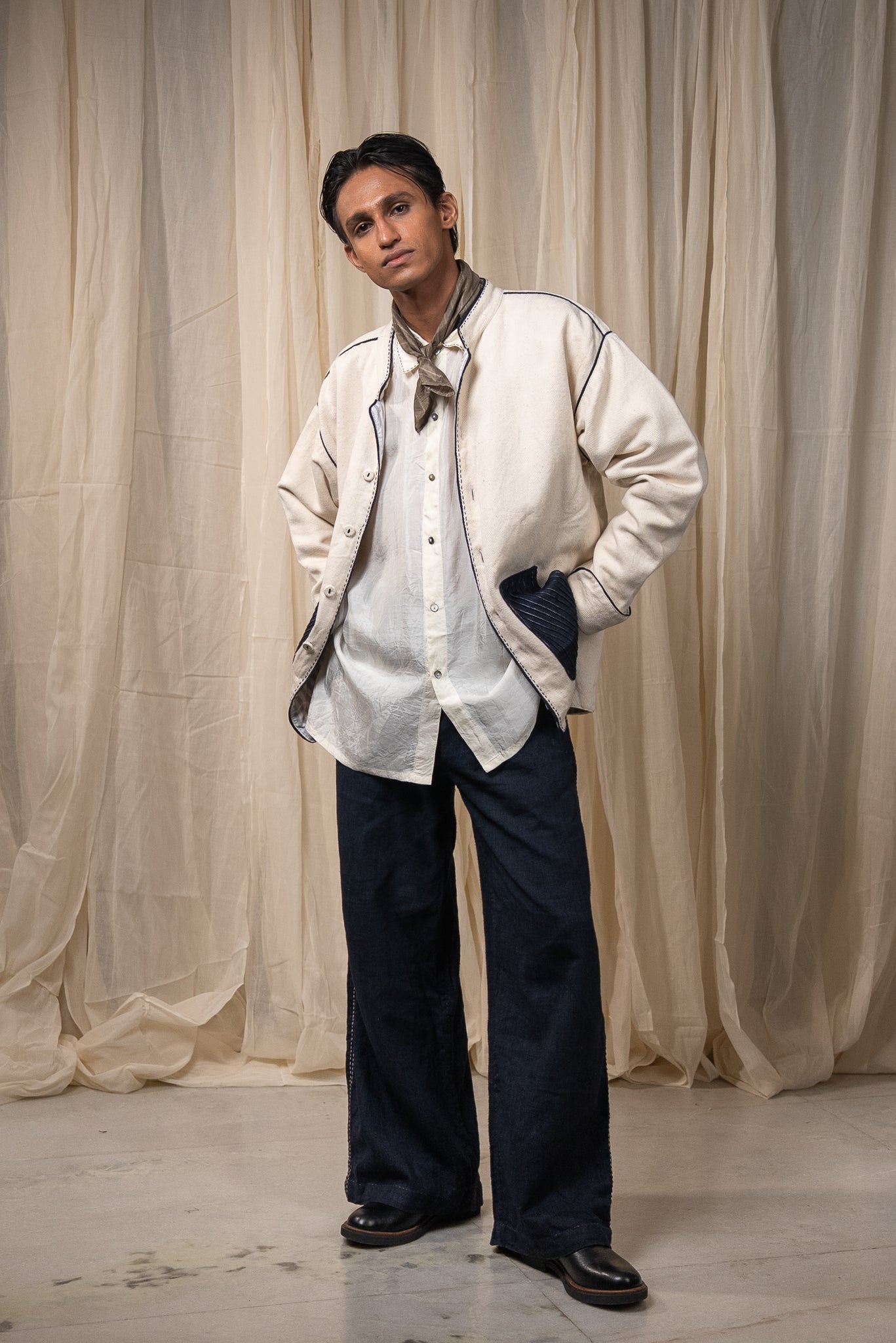 Made from 100% cotton fibres and natural materials, this Jacket is crafted in undyed and unbleached Kora denim- a weightier, handwoven fabric that holds its shape while softening with wear. The interior is lined with grey striped cotton, offering quiet contrast and comfort.