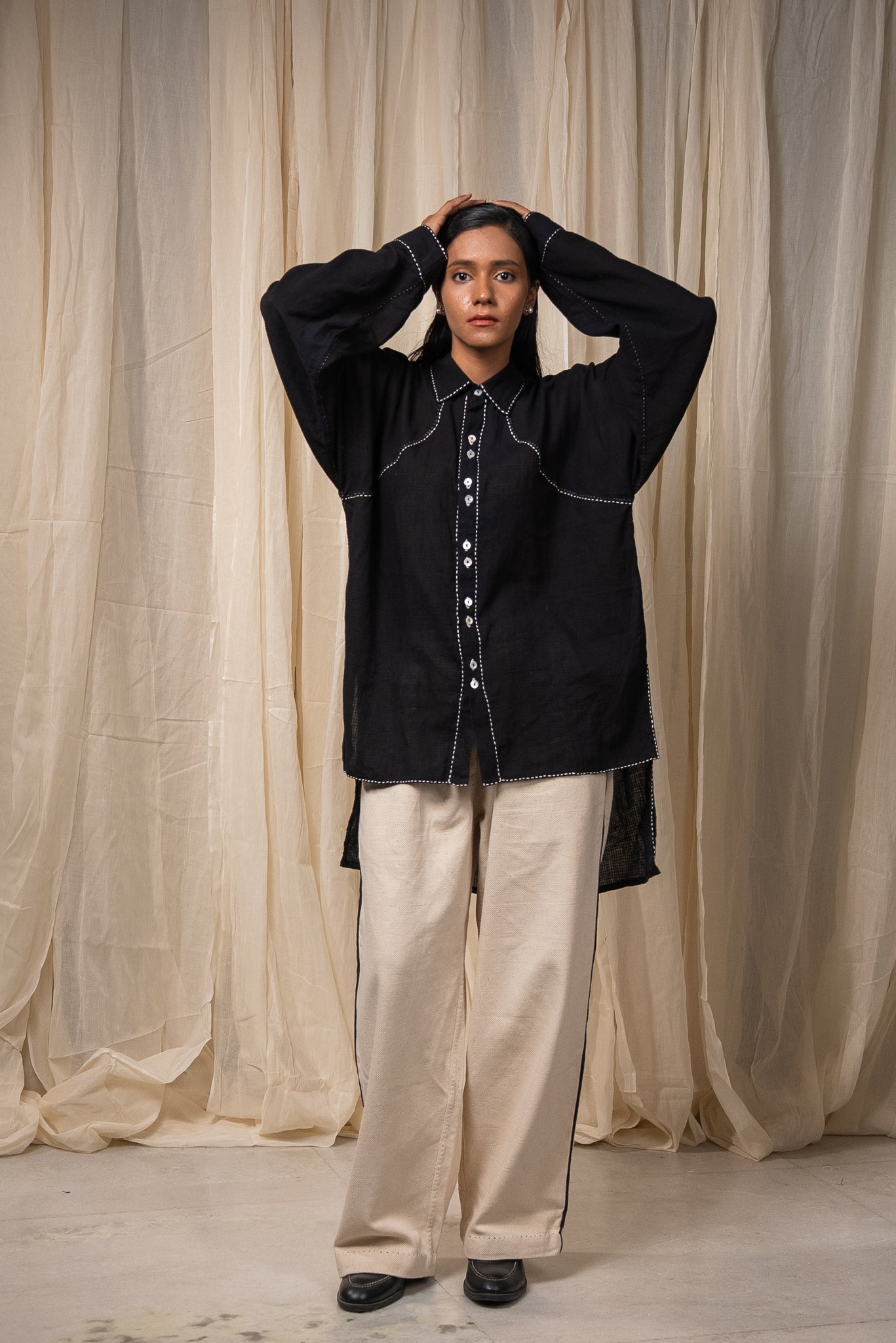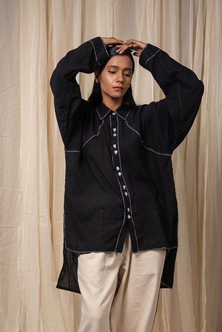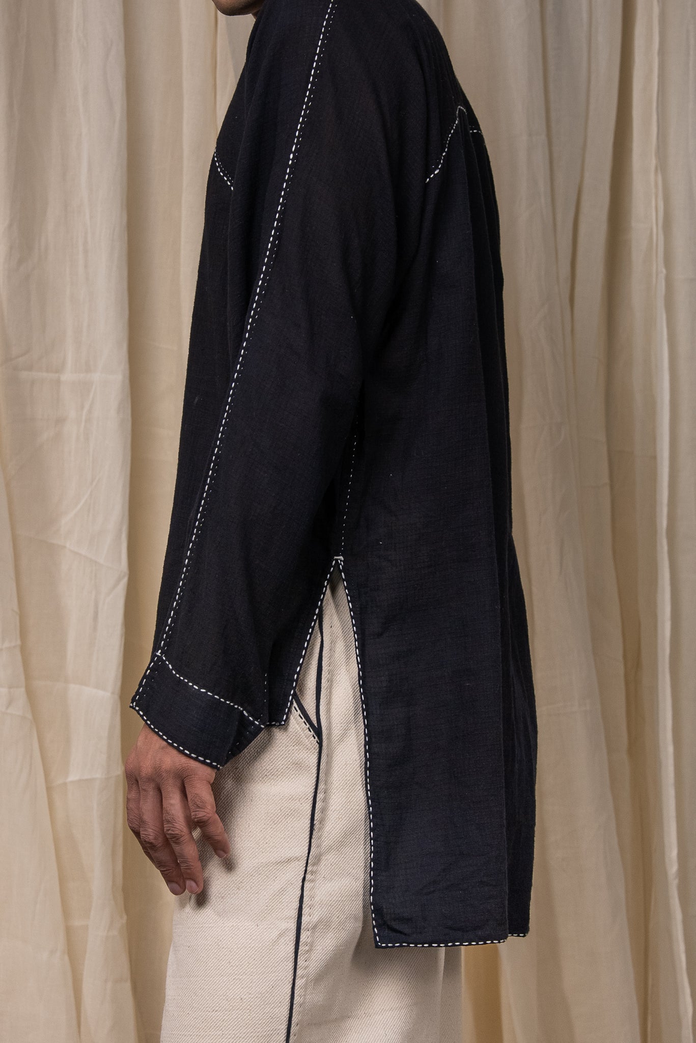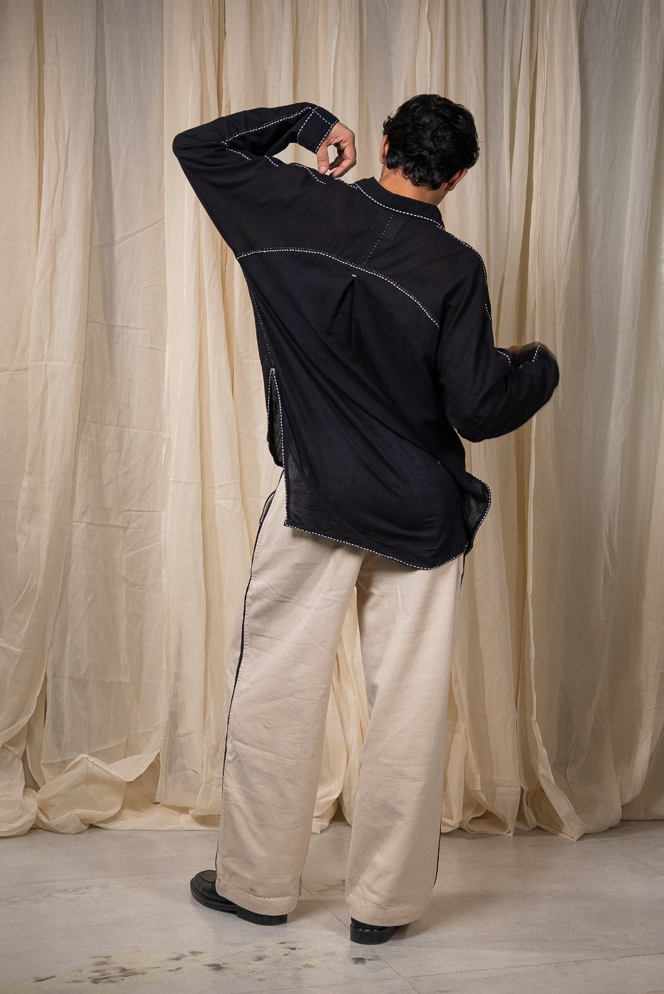 Made from 100% cotton fibres and natural materials, The Curve Shirt is crafted in azo-free dyed black cotton featuring a small check pattern. The surface is adorned with hand-done Kantha lines, offering a quiet rhythm and tactile richness throughout the piece.