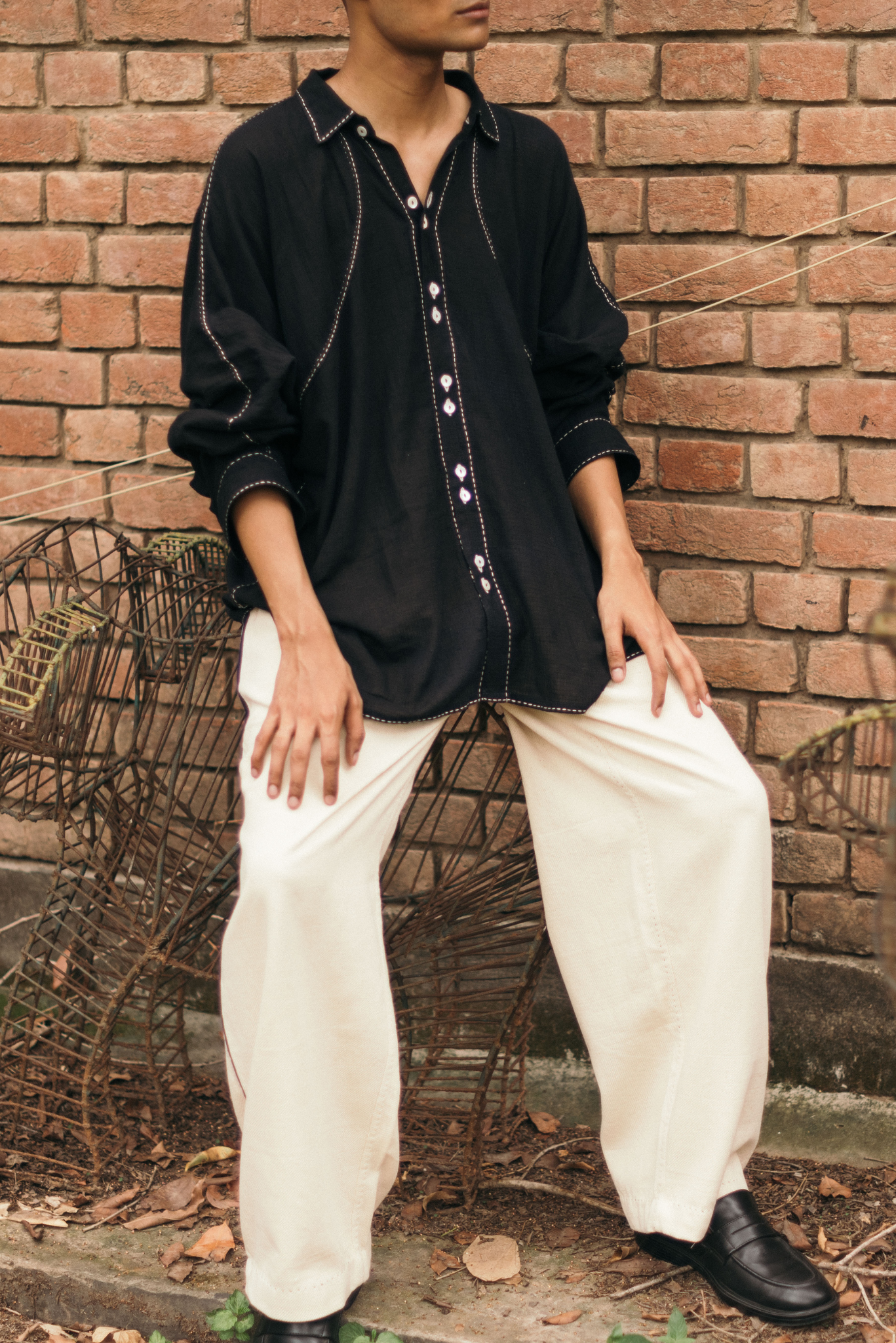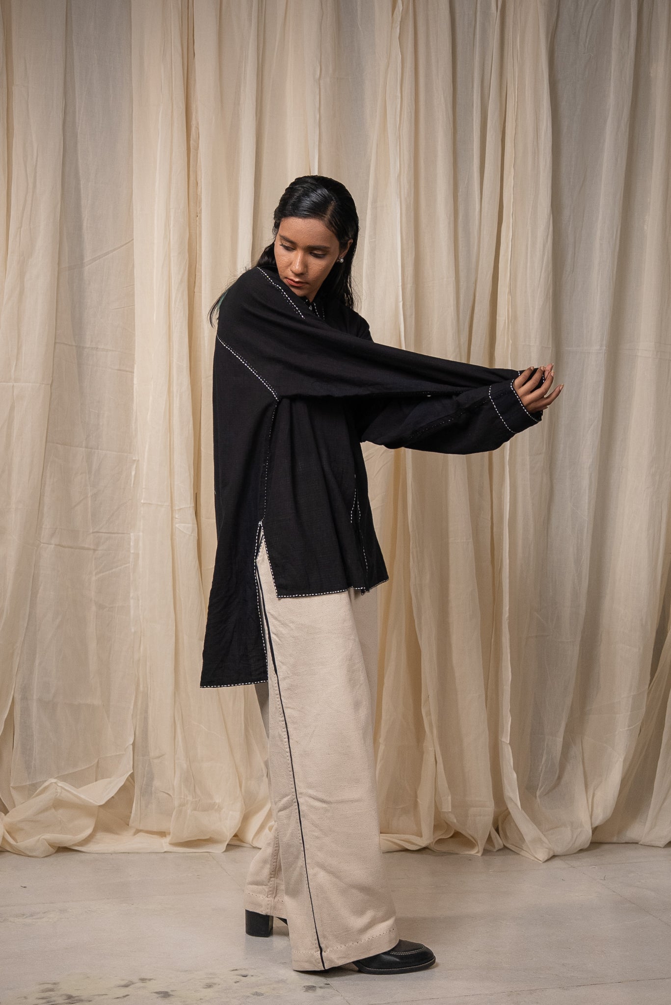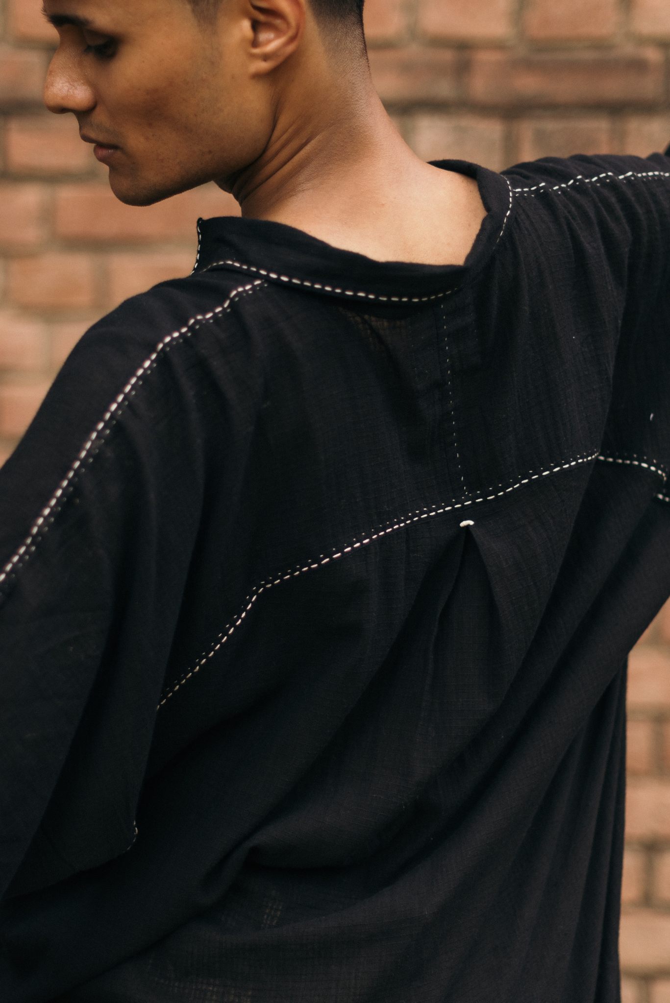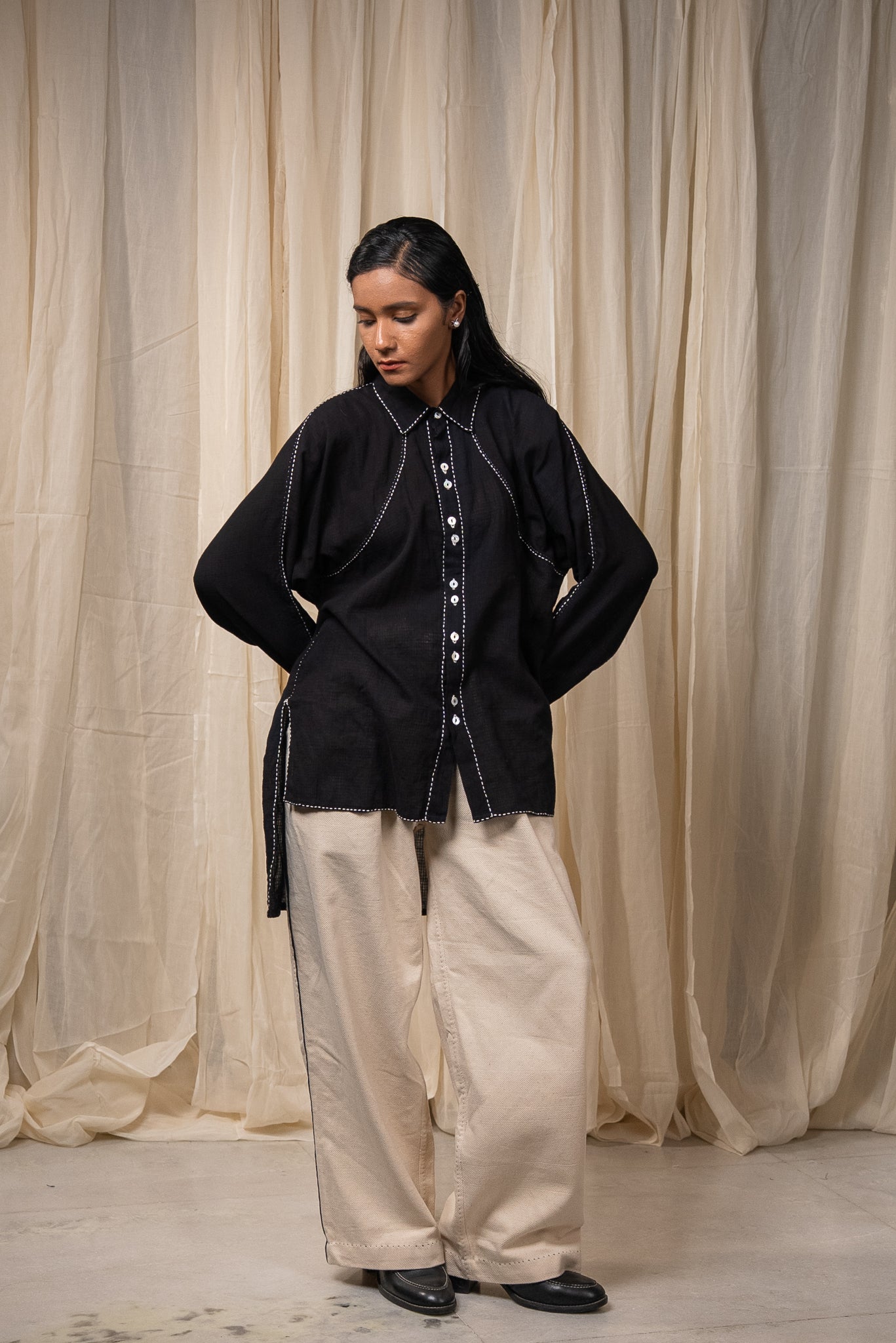 Made from 100% cotton fibres and natural materials, The Curve Shirt is crafted in azo-free dyed black cotton featuring a small check pattern. The surface is adorned with hand-done Kantha lines, offering a quiet rhythm and tactile richness throughout the piece.