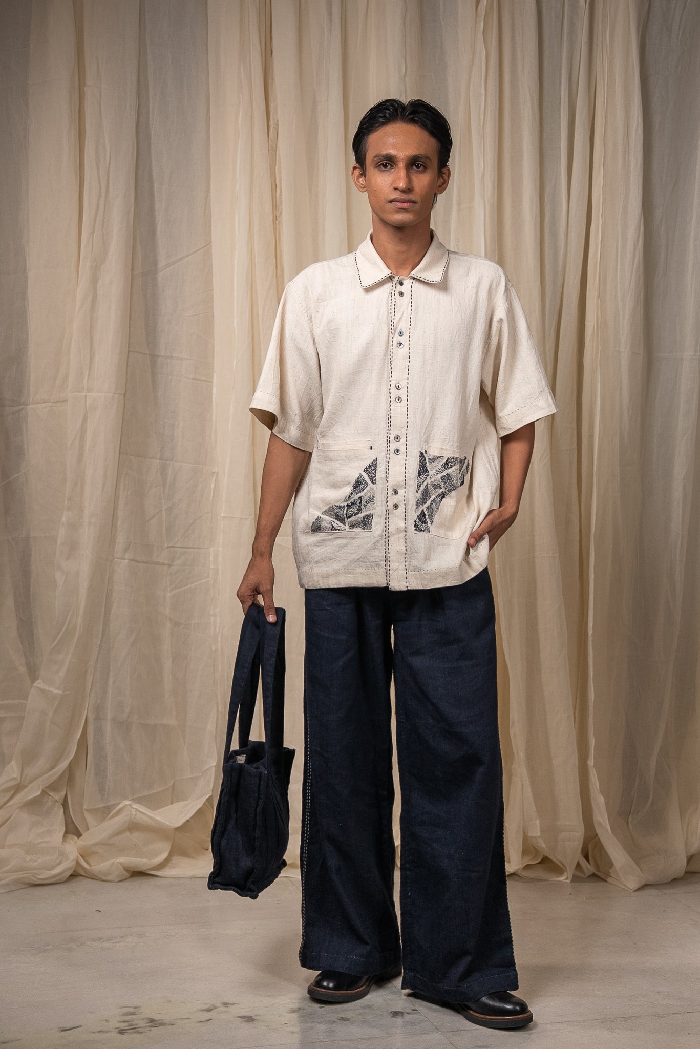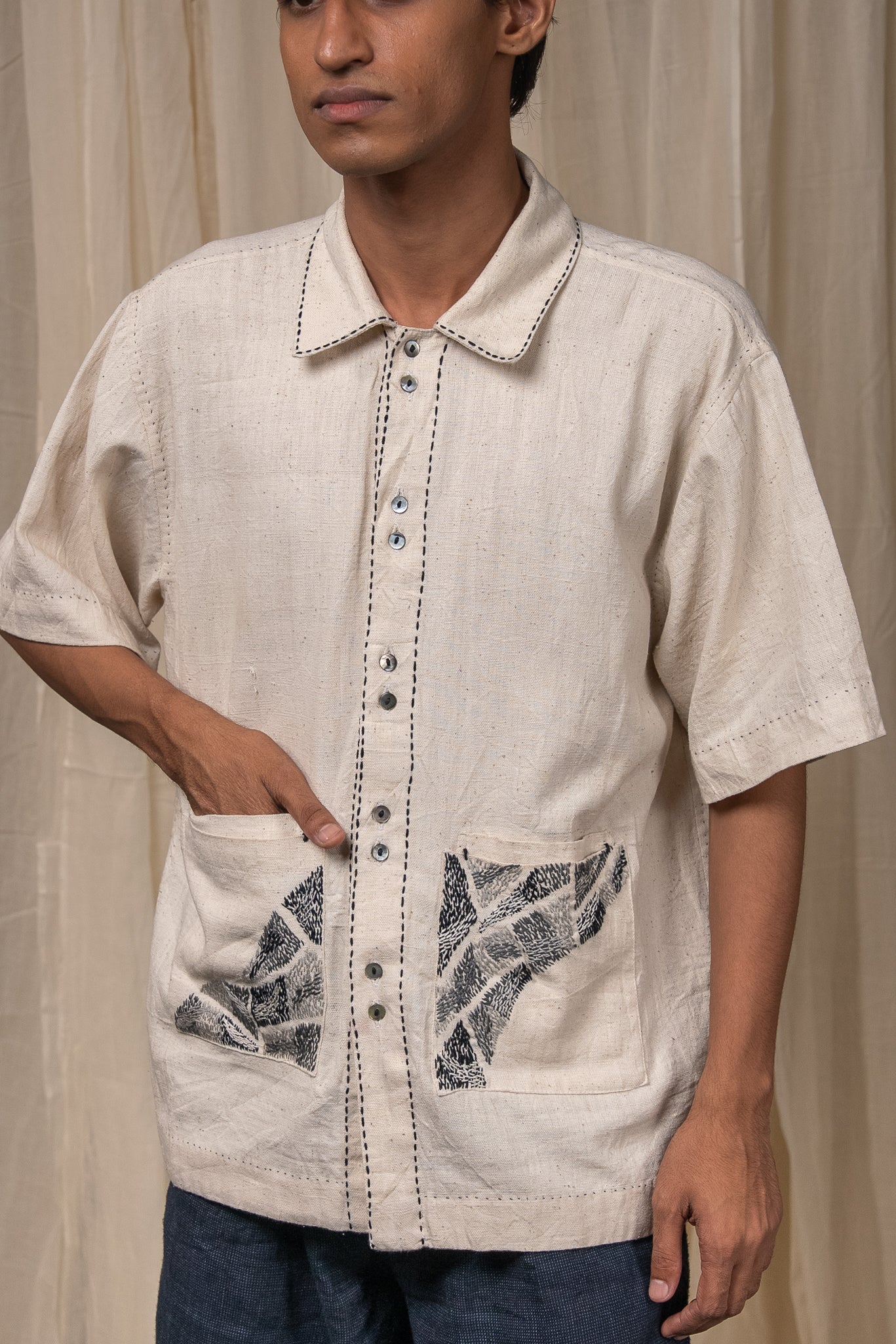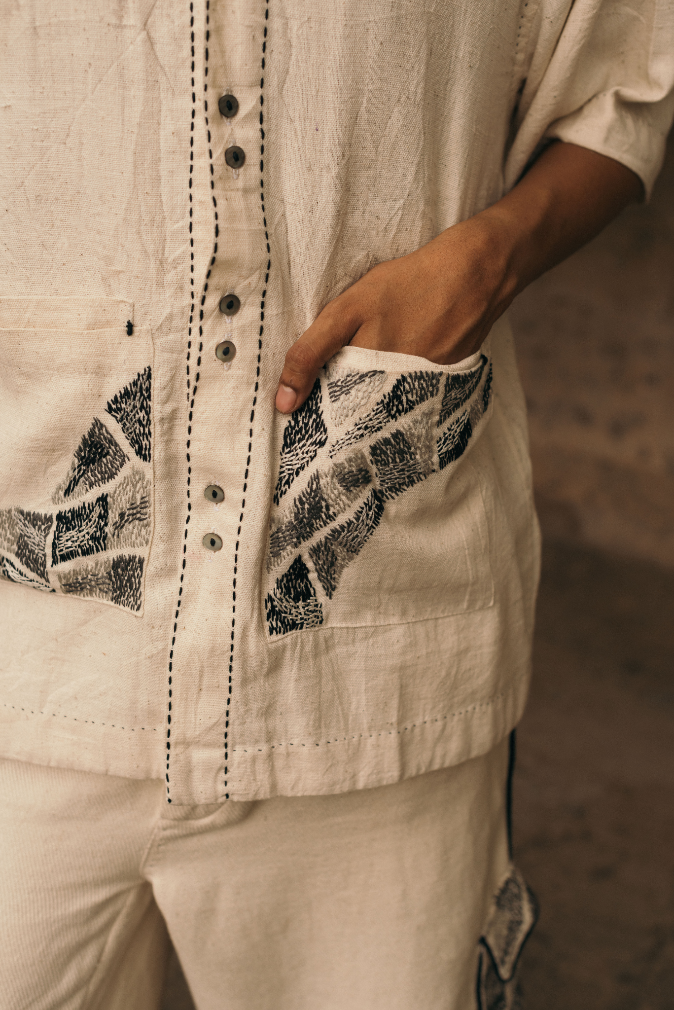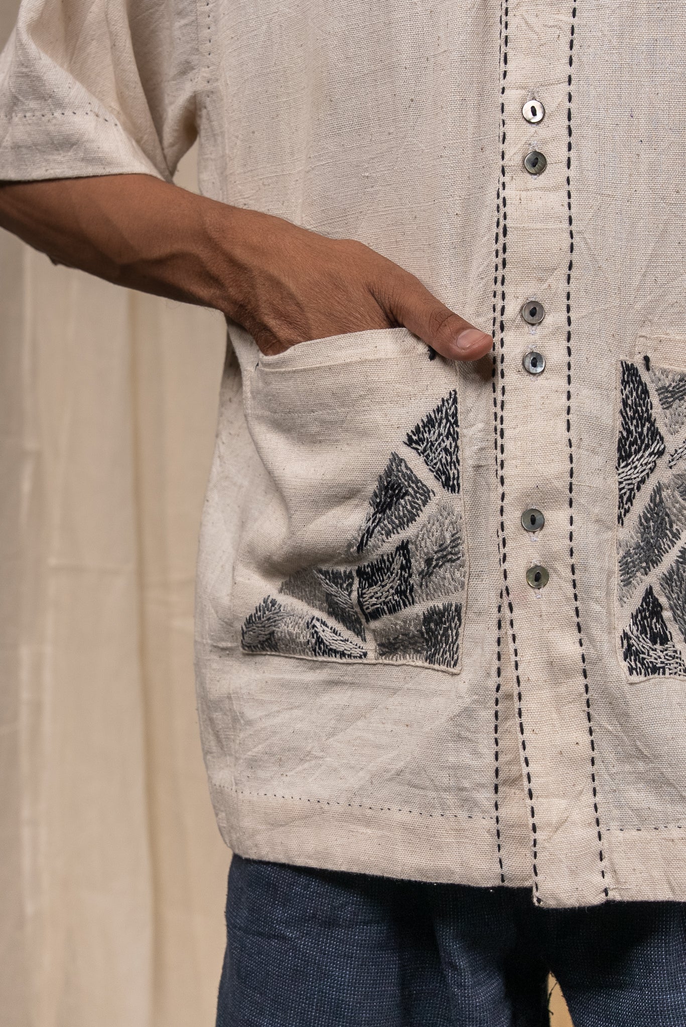 Double patch pockets on the front are richly hand-embroidered with Kantha reimagined - dense in detail and layered in technique. Pleats at the back allow for ease and movement.