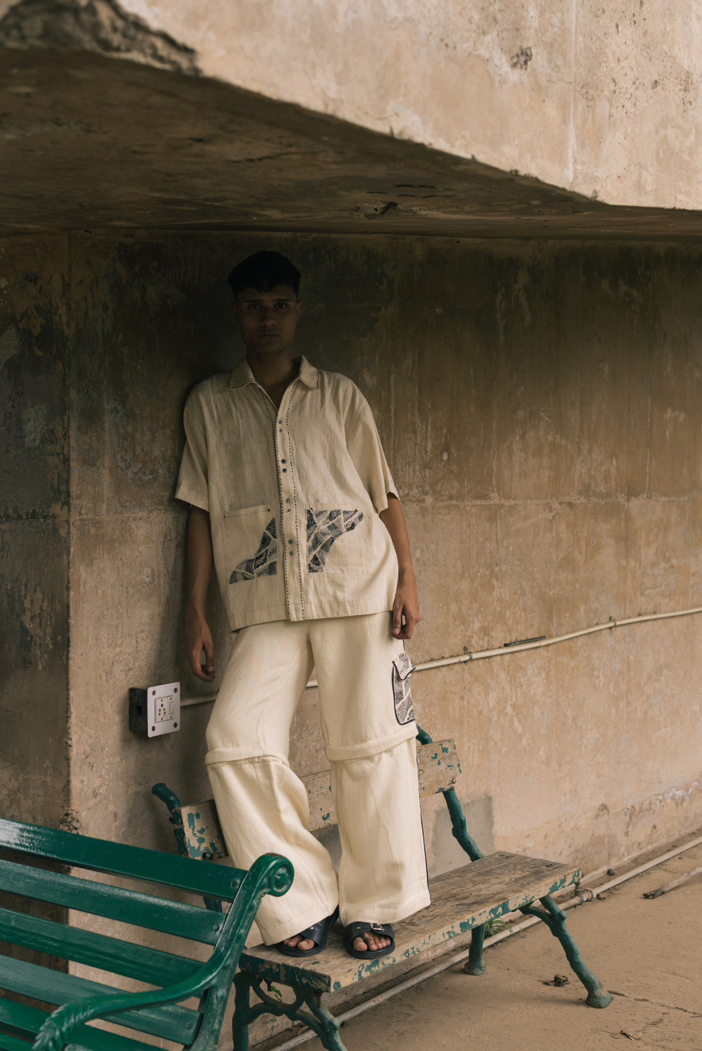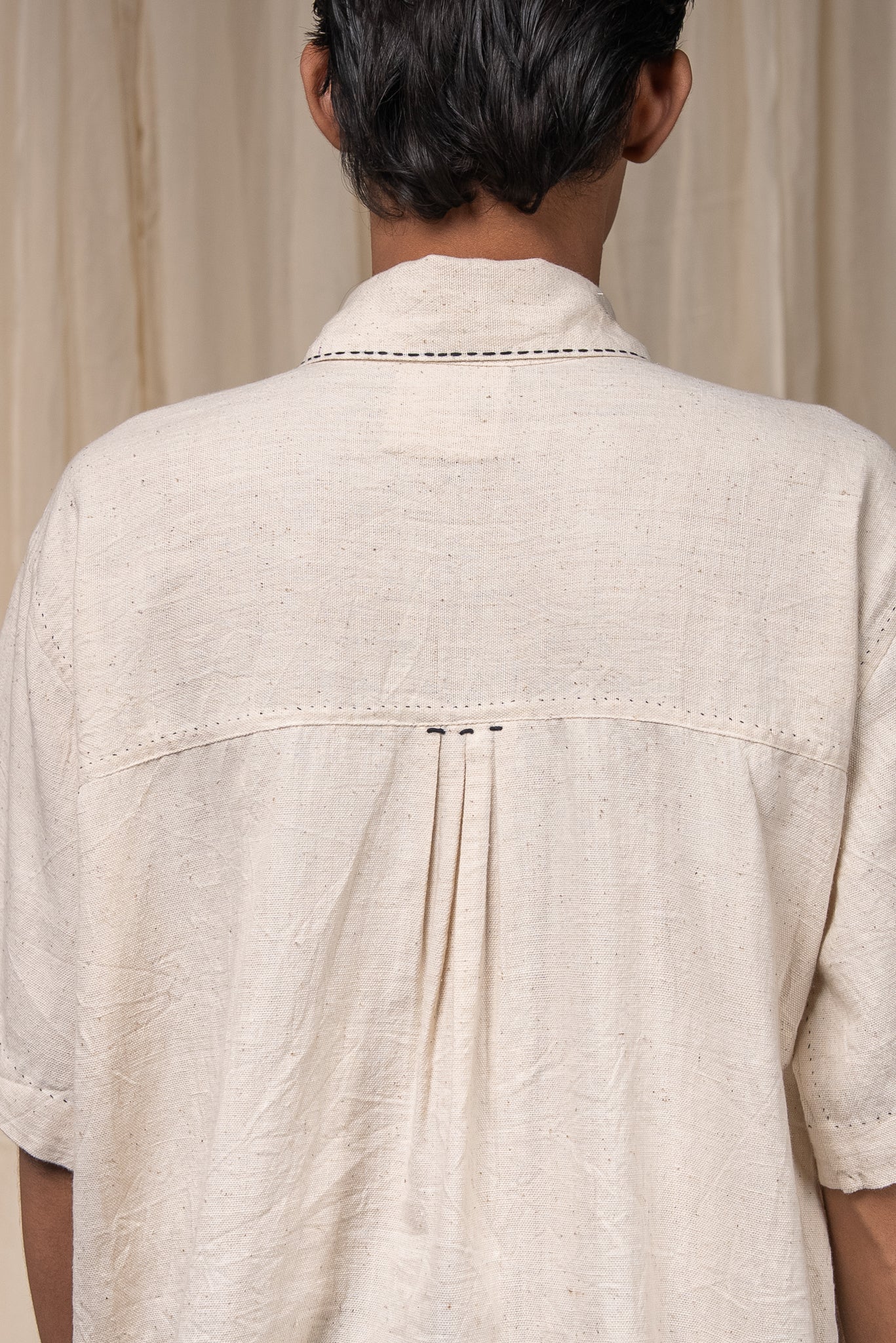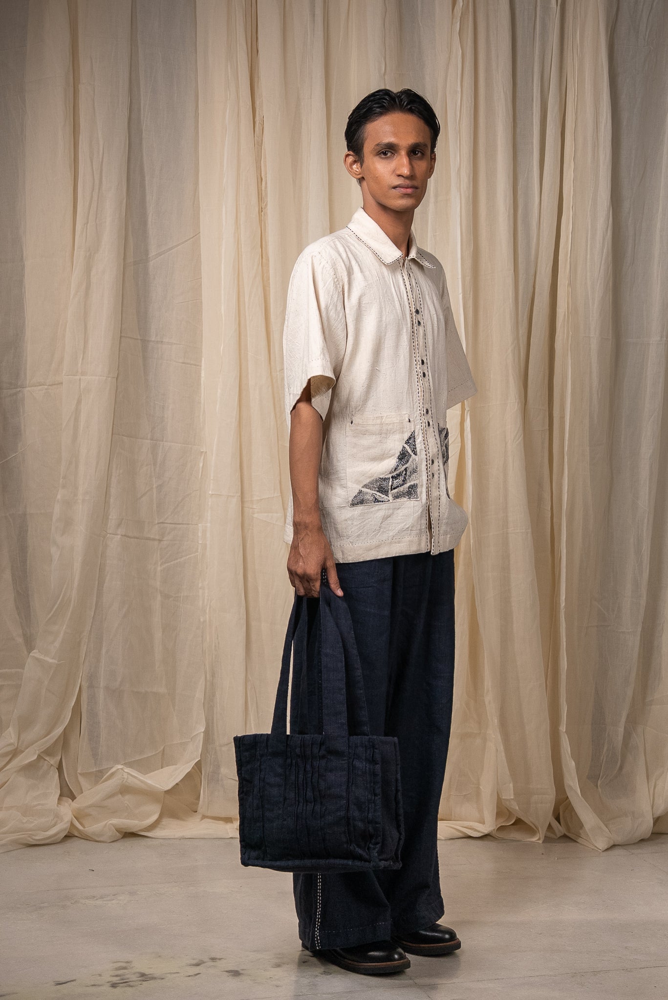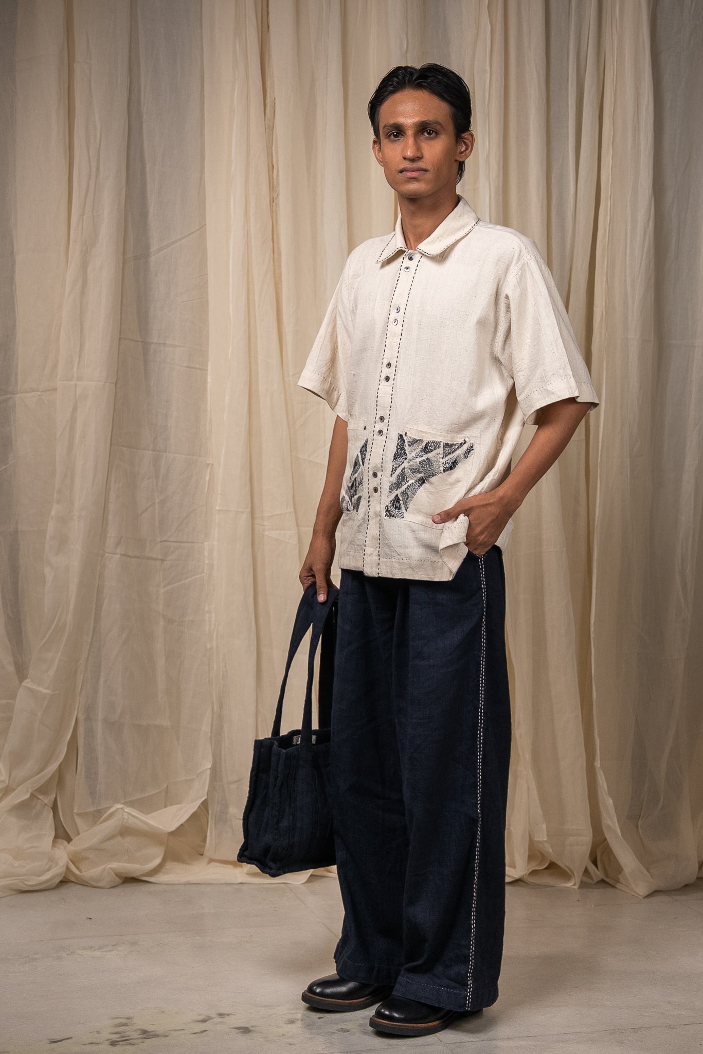 Double patch pockets on the front are richly hand-embroidered with Kantha reimagined - dense in detail and layered in technique. Pleats at the back allow for ease and movement.