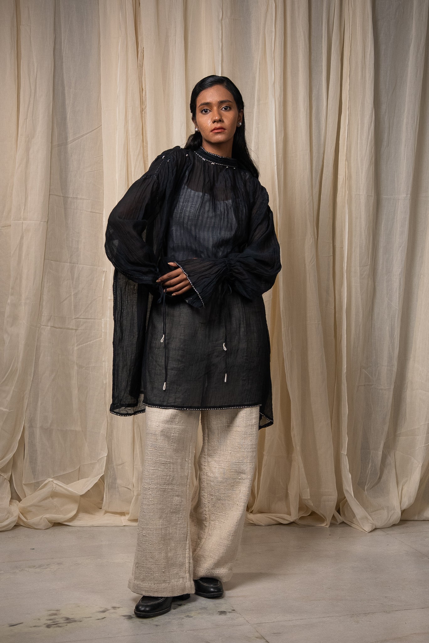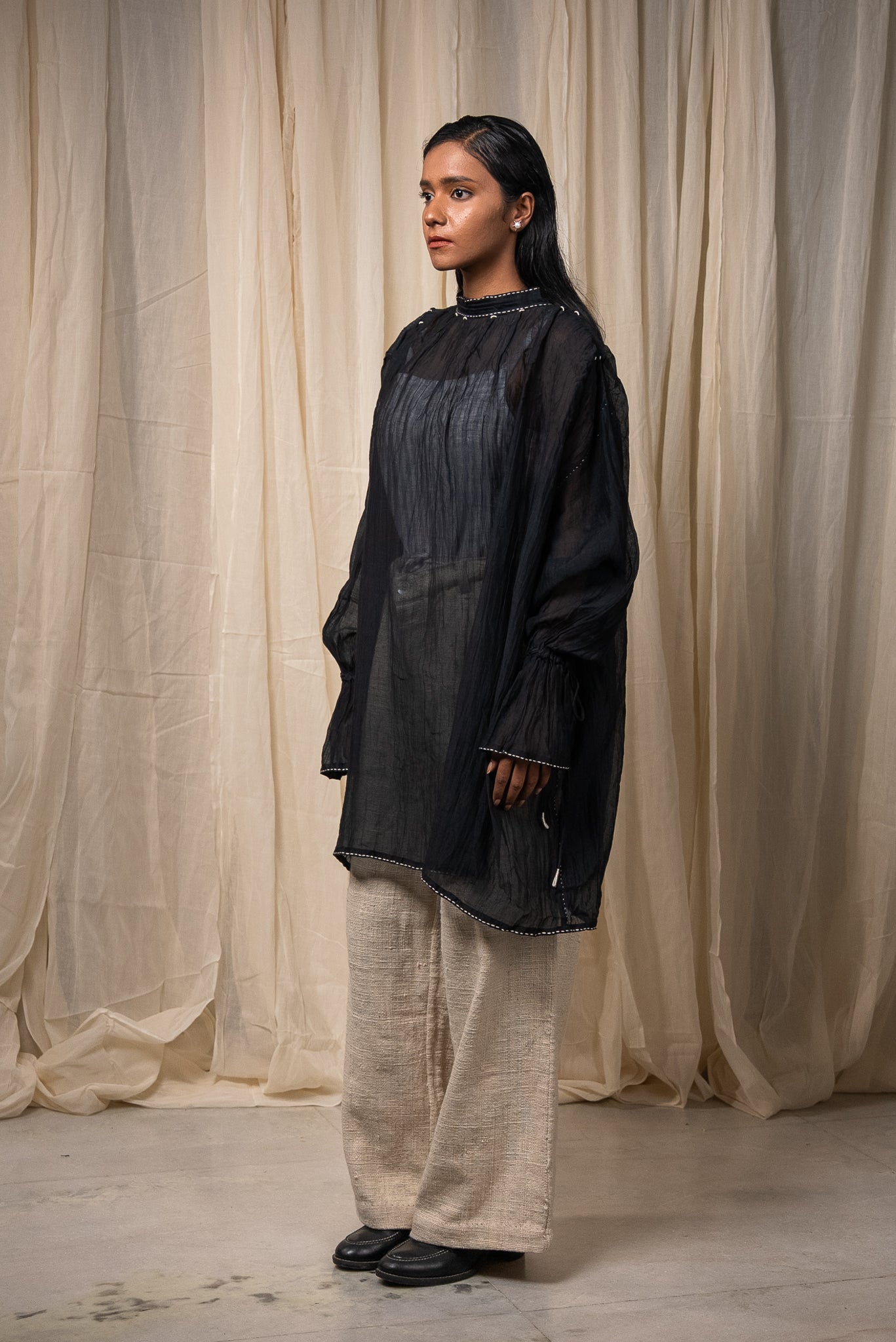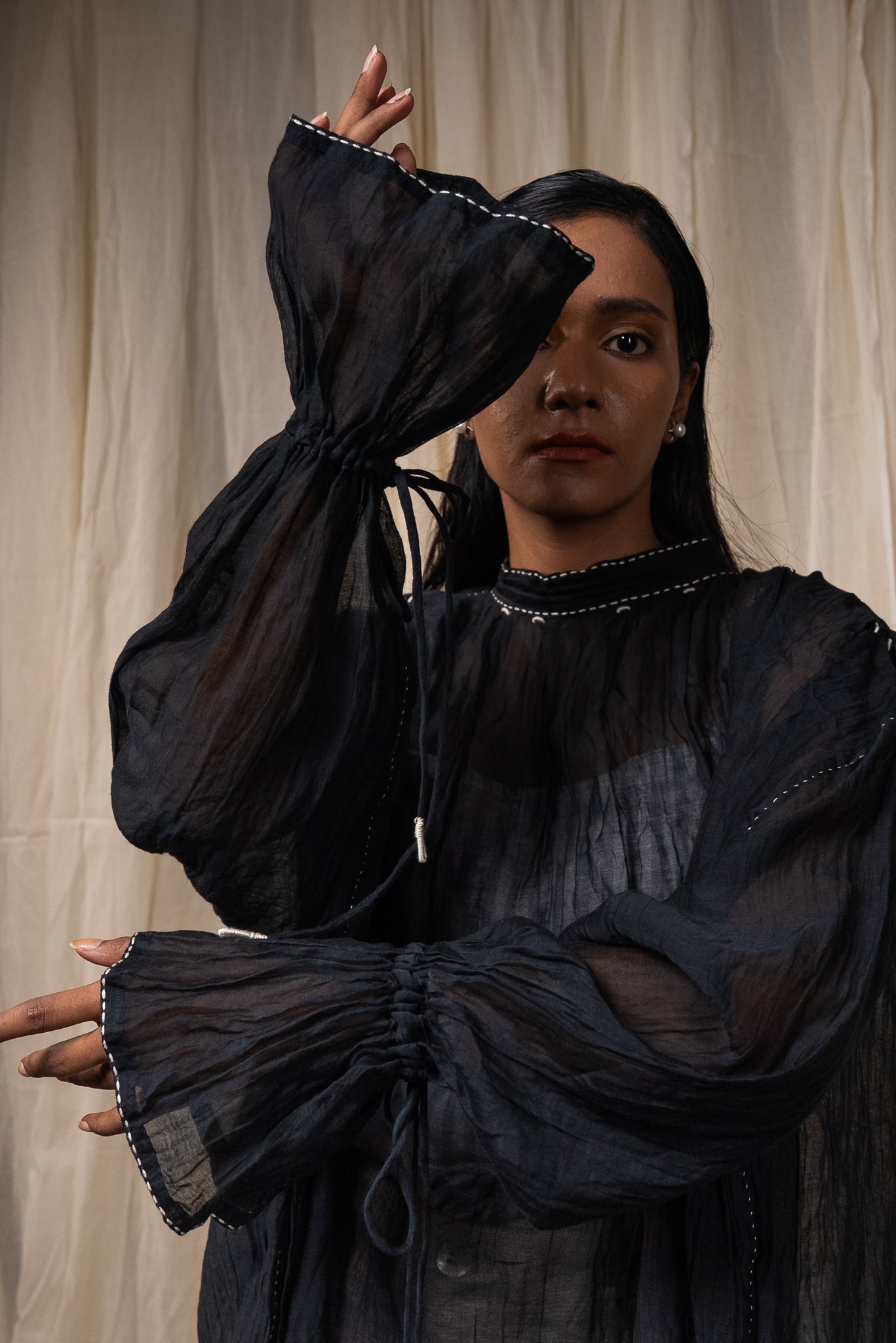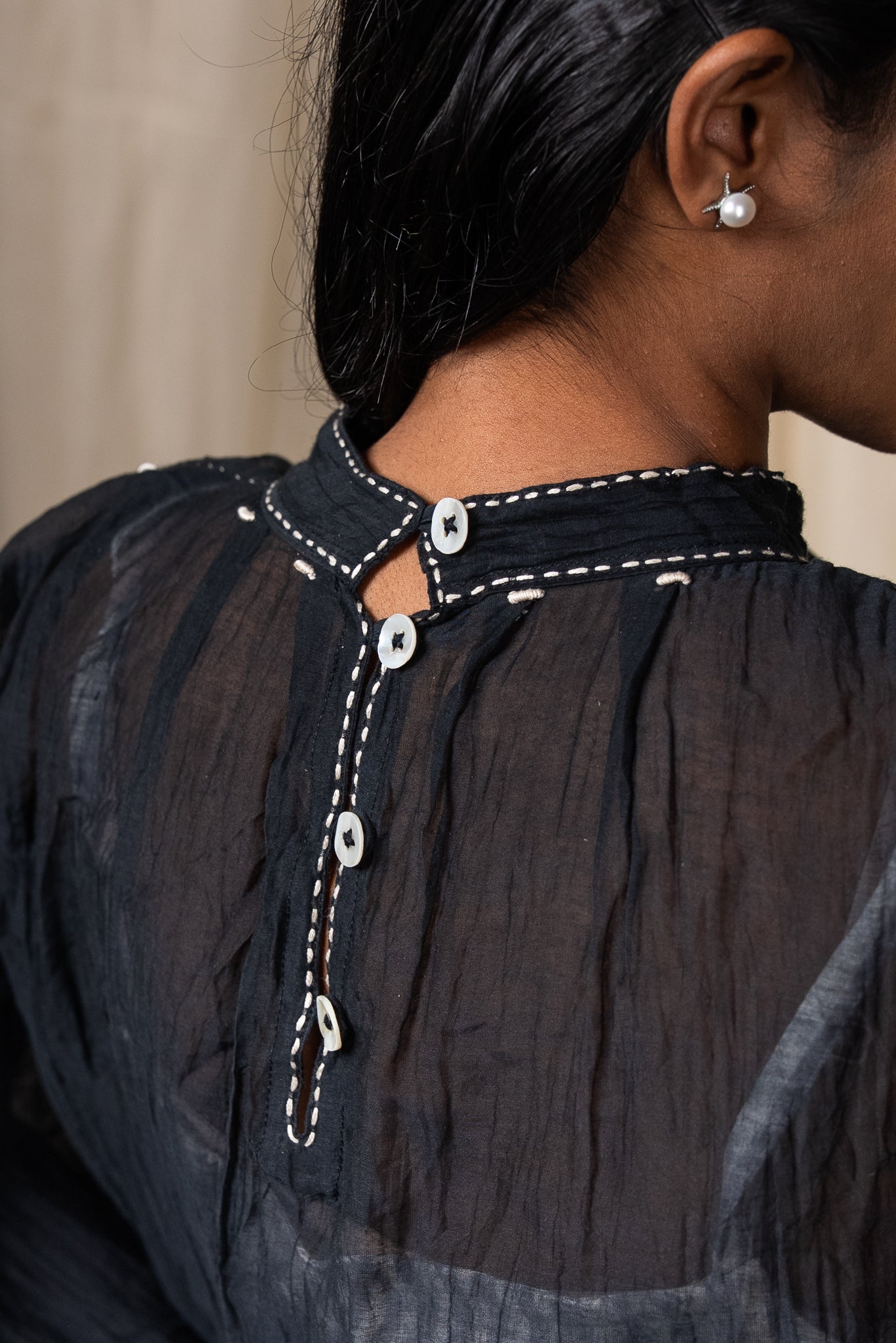 Made from 100% Chanderi and natural materials, this blouse is azo-free dyed in black. The sheer fabric is detailed with pleats around the shoulders, finished with delicate notches and lines of Kantha.