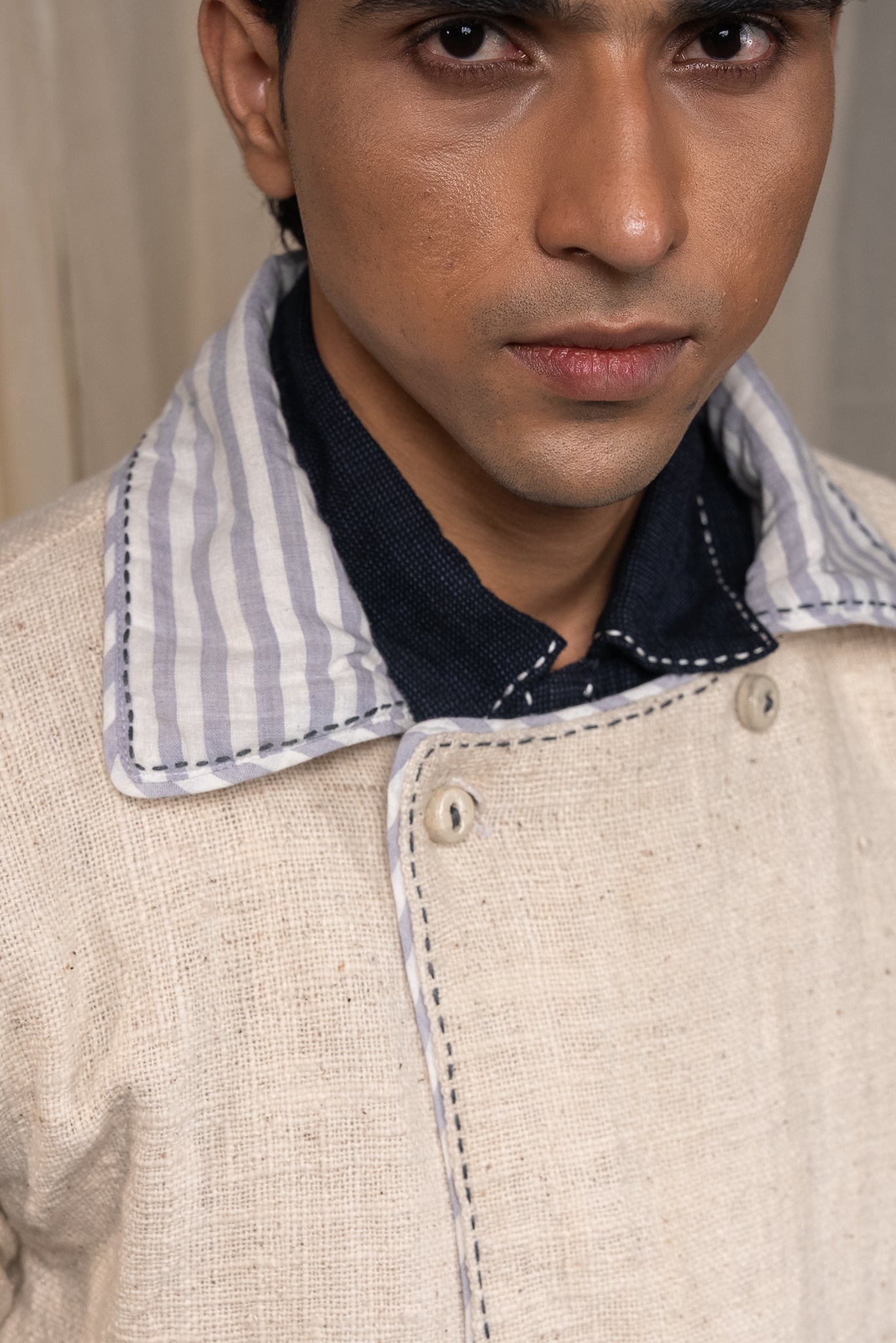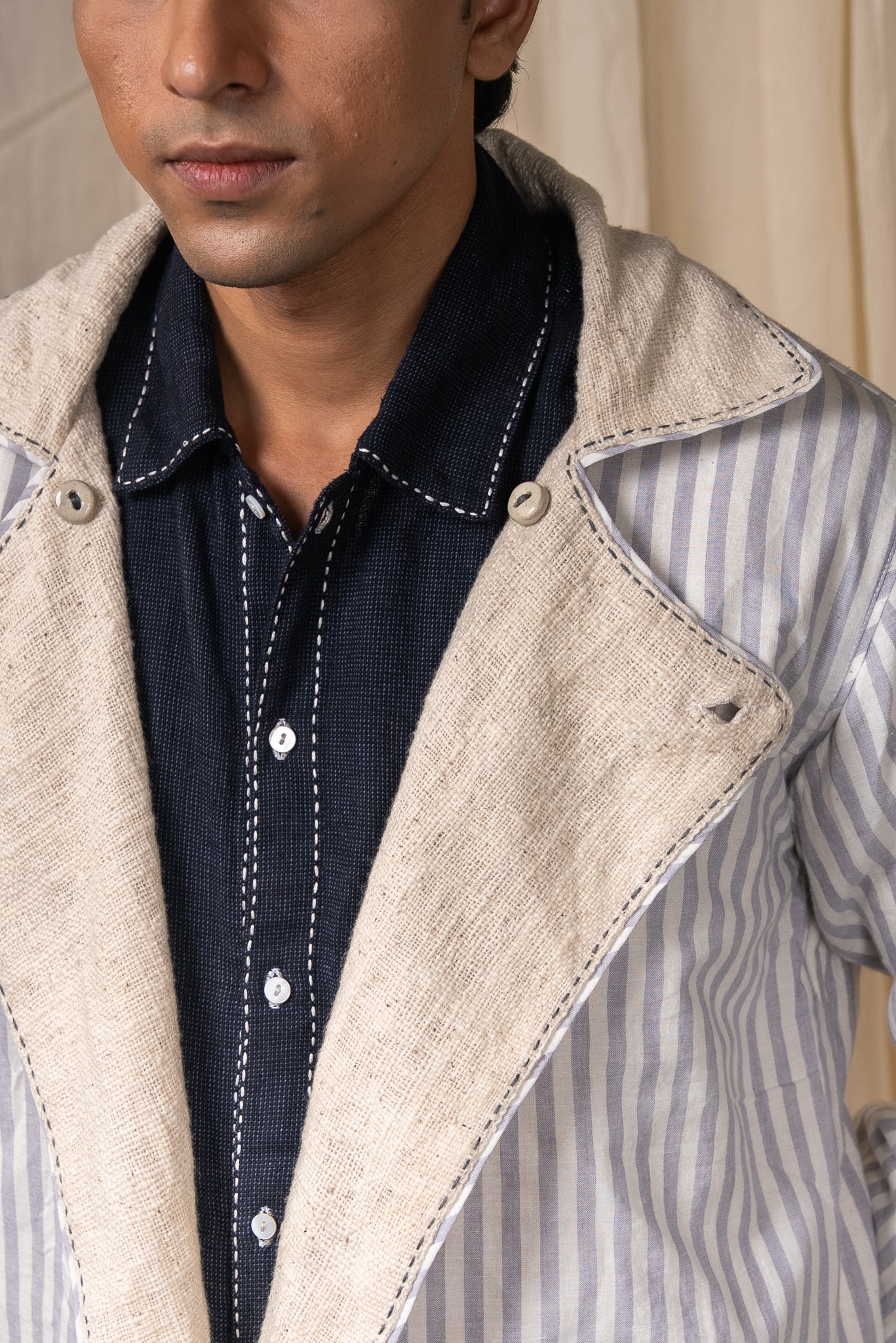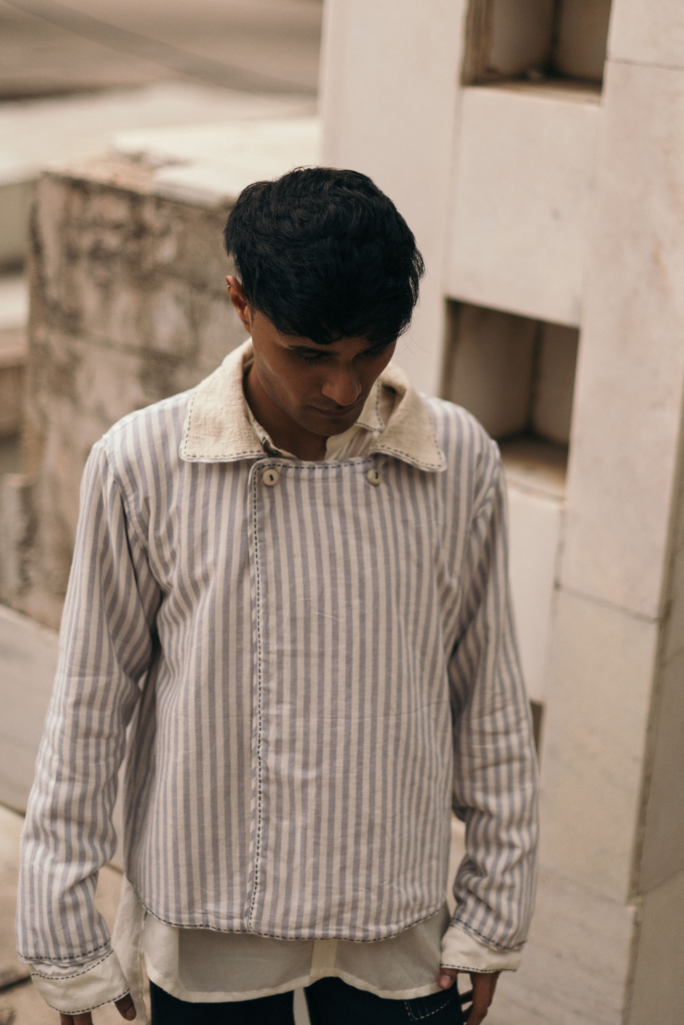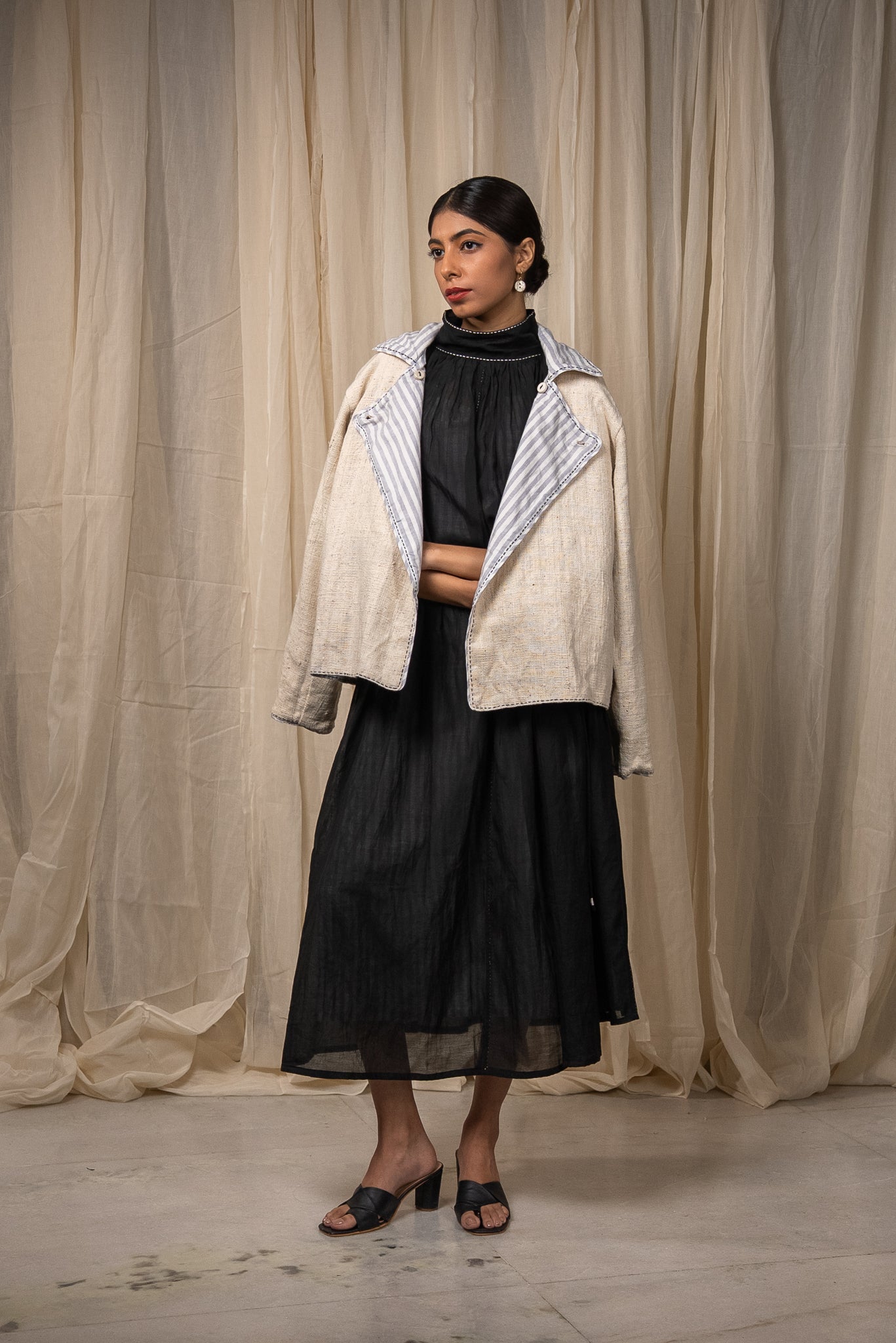 Made from 100% cotton fibres and natural materials, the In-Out Reversible Cropped Jacket brings together two handwoven fabrics - undyed and unbleached zero-count cotton on one side and grey striped cotton on the other. The surface is detailed with minimal hand-done Kantha embroidery, creating quiet linear texture across the fabric.