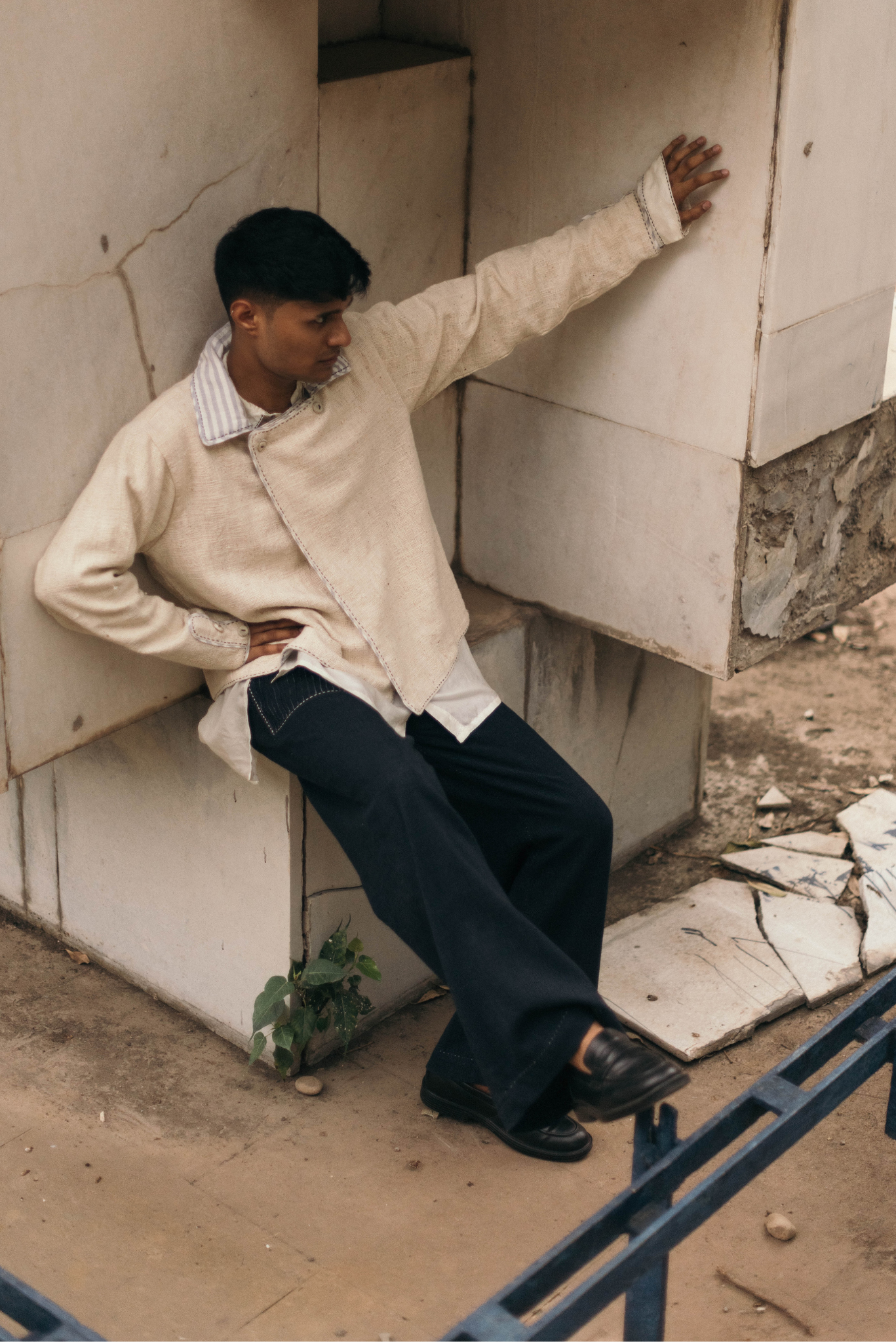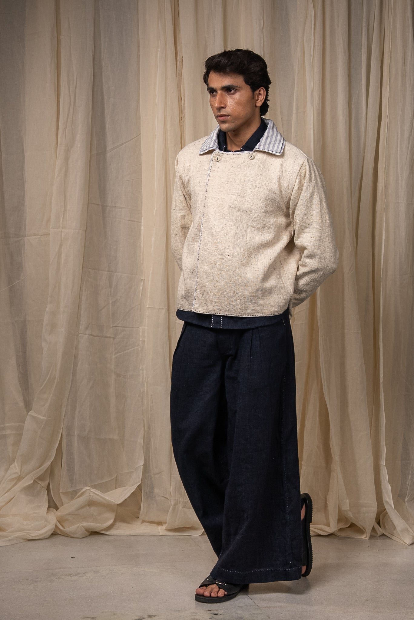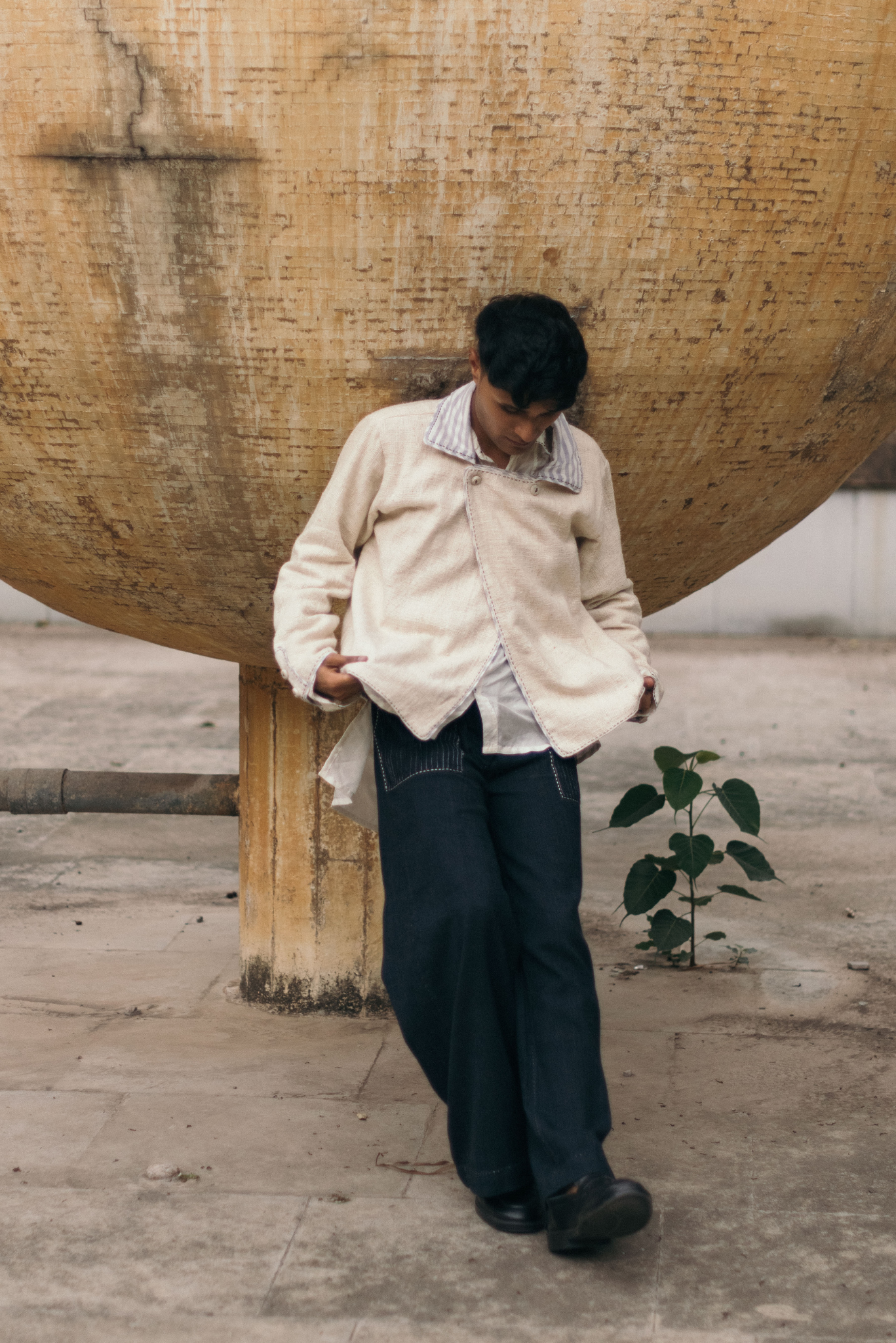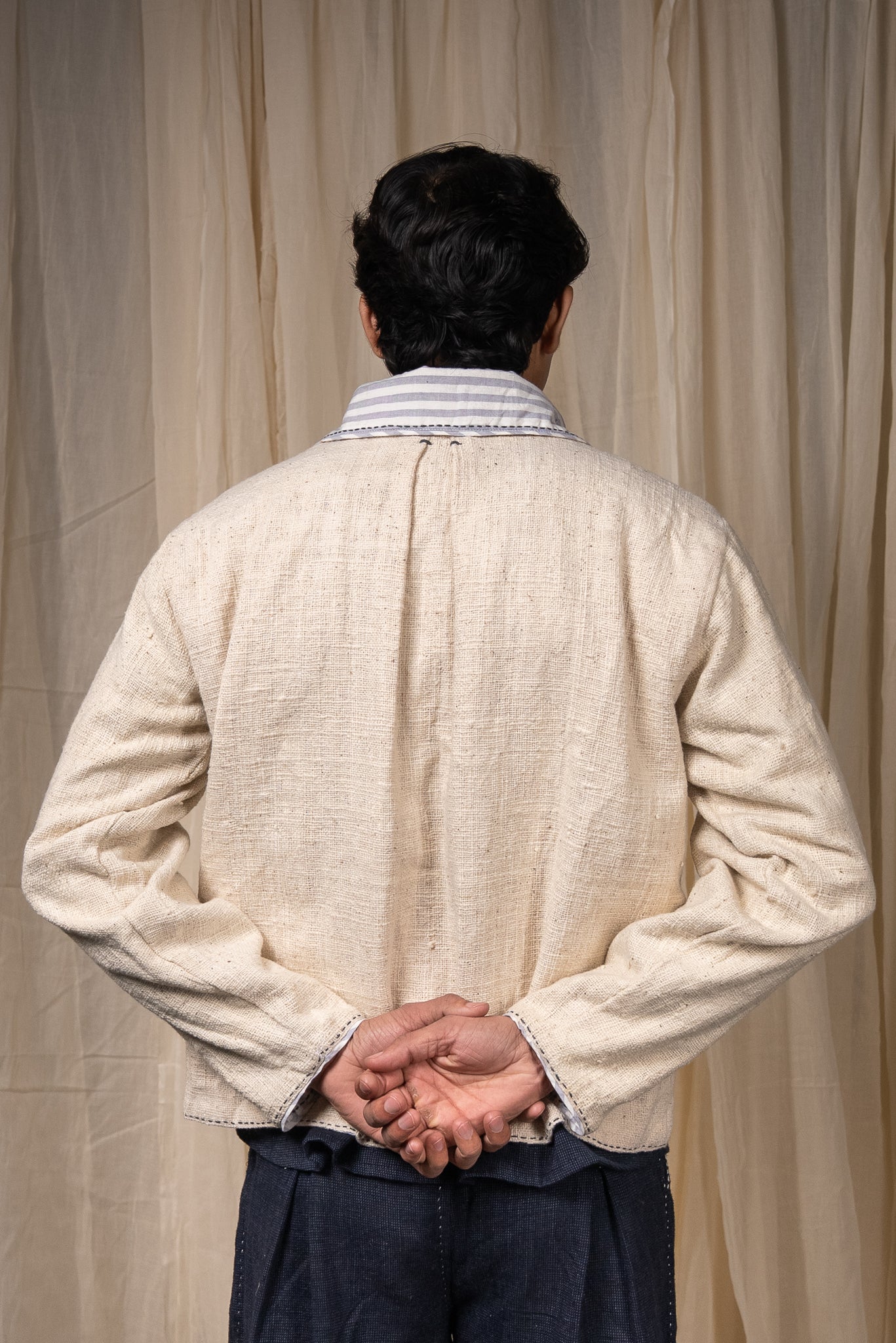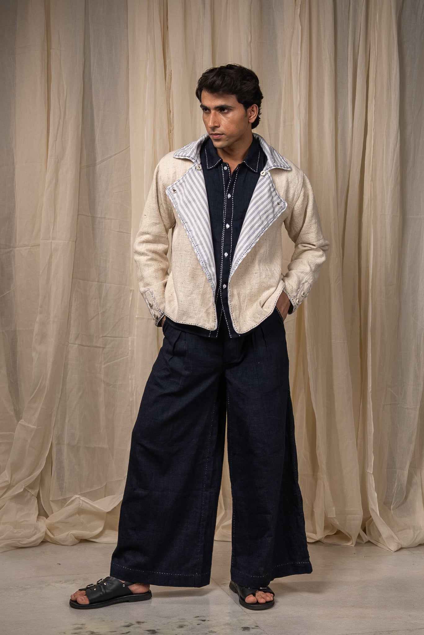 Made from 100% cotton fibres and natural materials, the In-Out Reversible Cropped Jacket brings together two handwoven fabrics - undyed and unbleached zero-count cotton on one side and grey striped cotton on the other. The surface is detailed with minimal hand-done Kantha embroidery, creating quiet linear texture across the fabric.