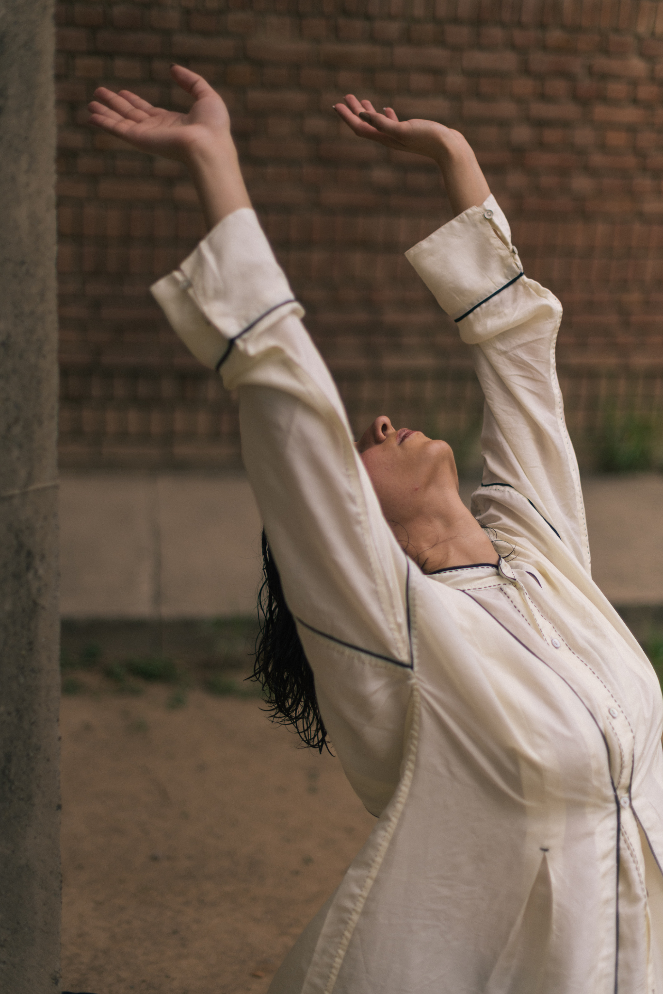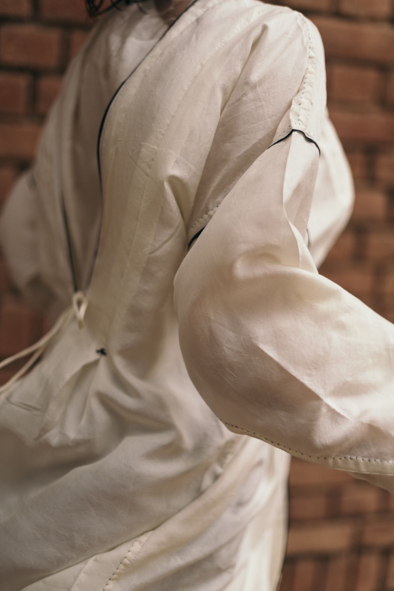 Crafted from 100% undyed and unbleached silk, this dress is shaped through subtle construction that allows quiet transformation. Inverted pleats on the front create soft volume, while a loop button at the side lets the silhouette shift when fastened. Pleats and tie-up at the back offers further adjustability.