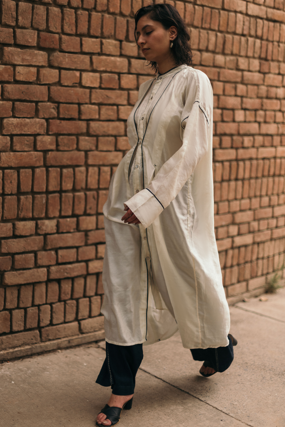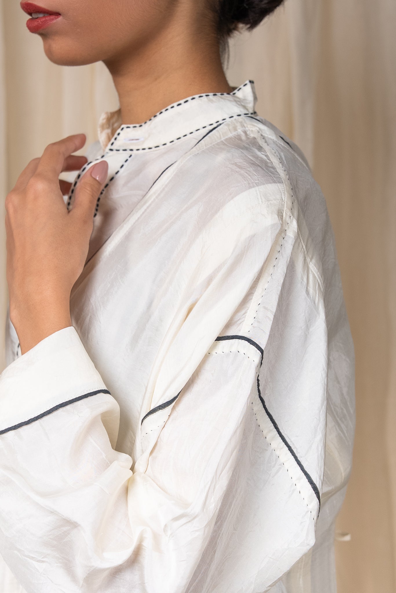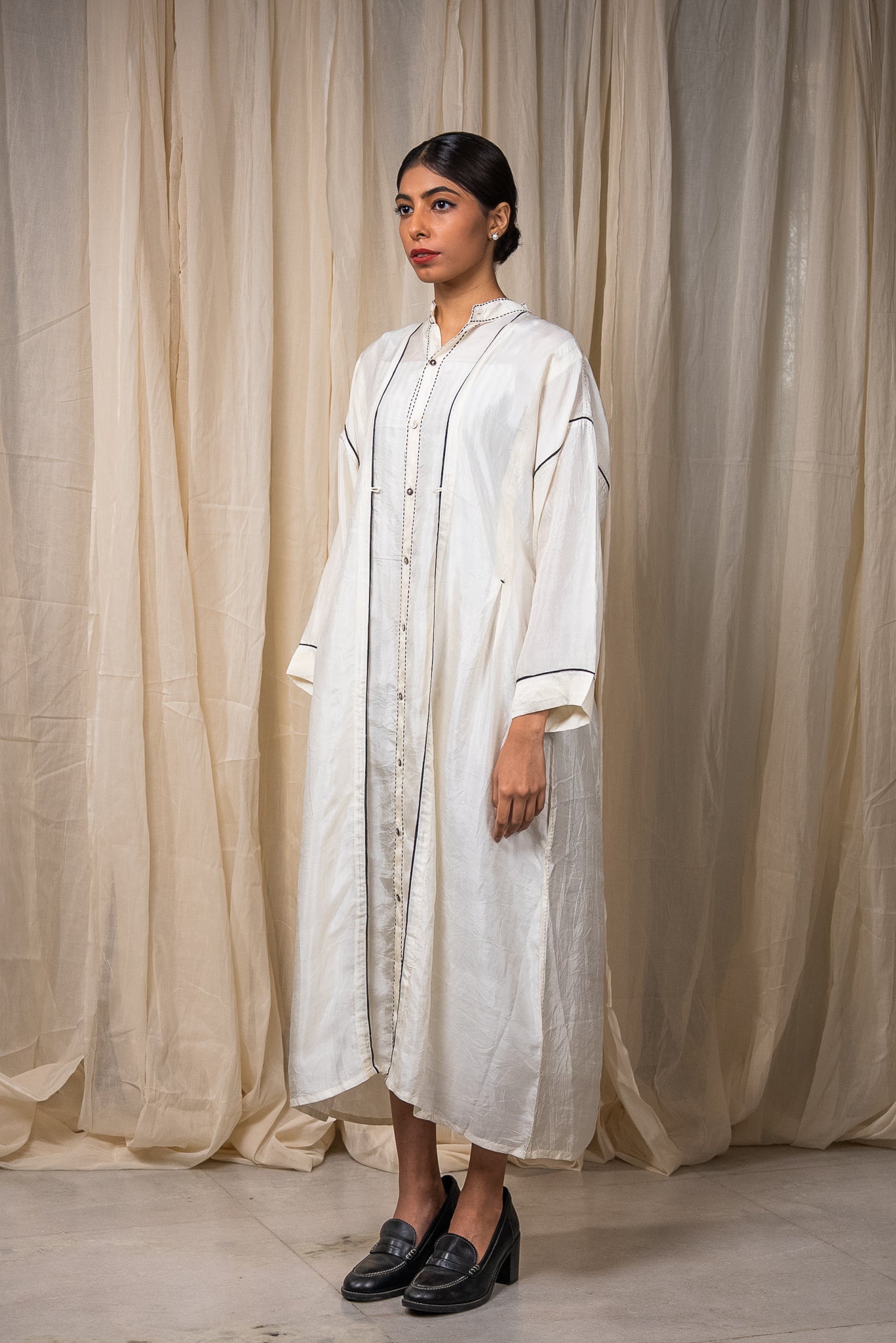 Broad cuffs finish the sleeves, and Midnight Black Chanderi piping traces the seams, adding contrast to the fluid structure.