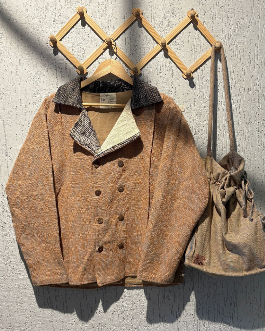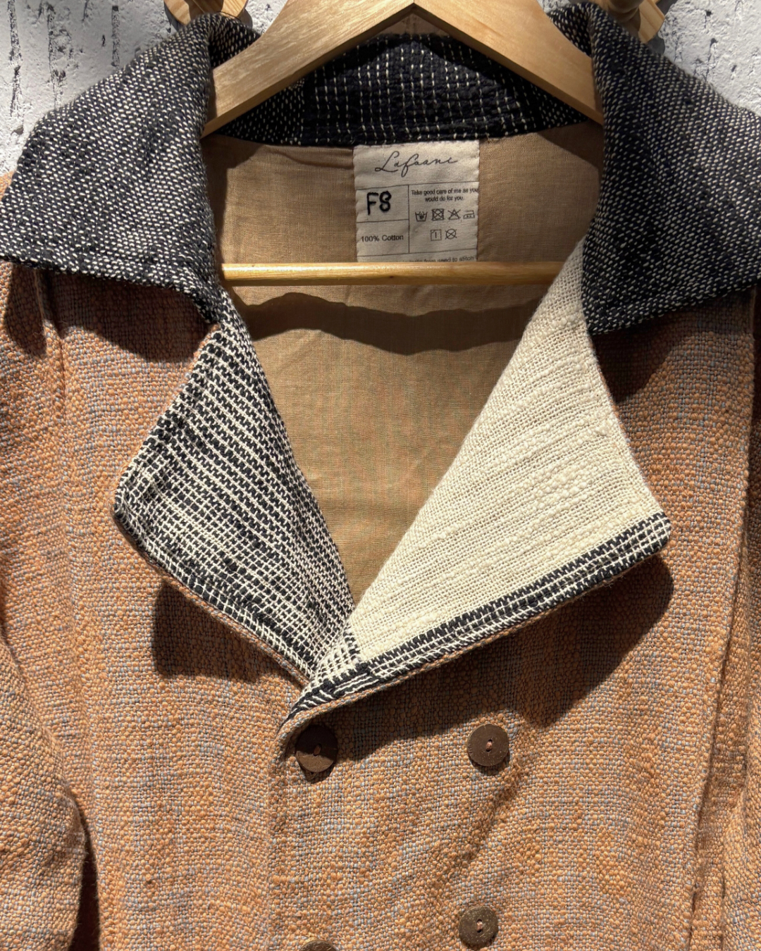 A structured handwoven jacket crafted in a heavier, richly textured weave, designed for warmth and longevity. The double-breasted front and layered contrast lapel bring quiet depth, while natural buttons and a relaxed cut keep it grounded- an enduring, seasonless outer layer meant to soften with wear.