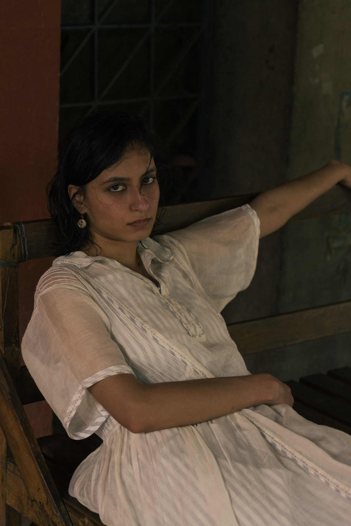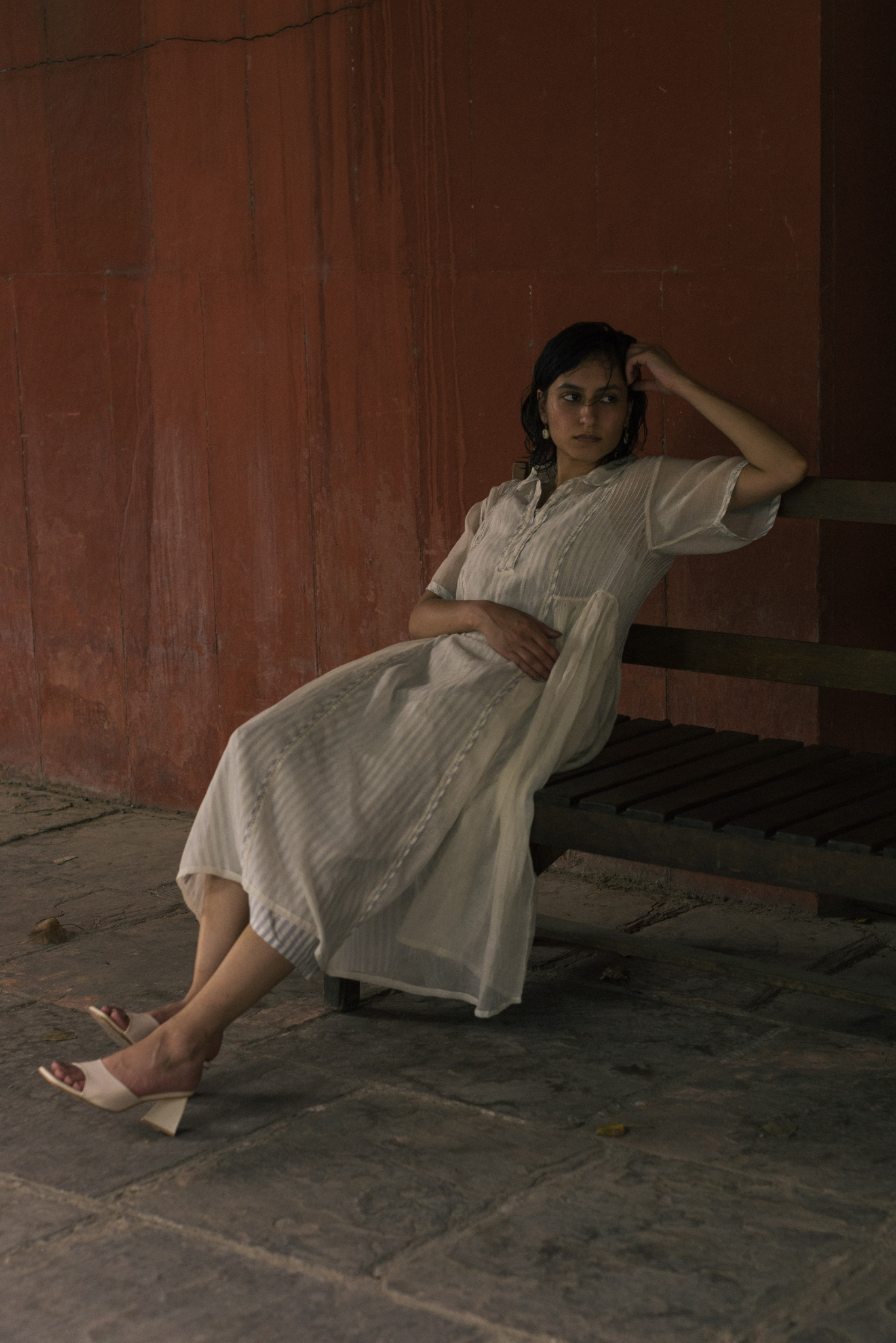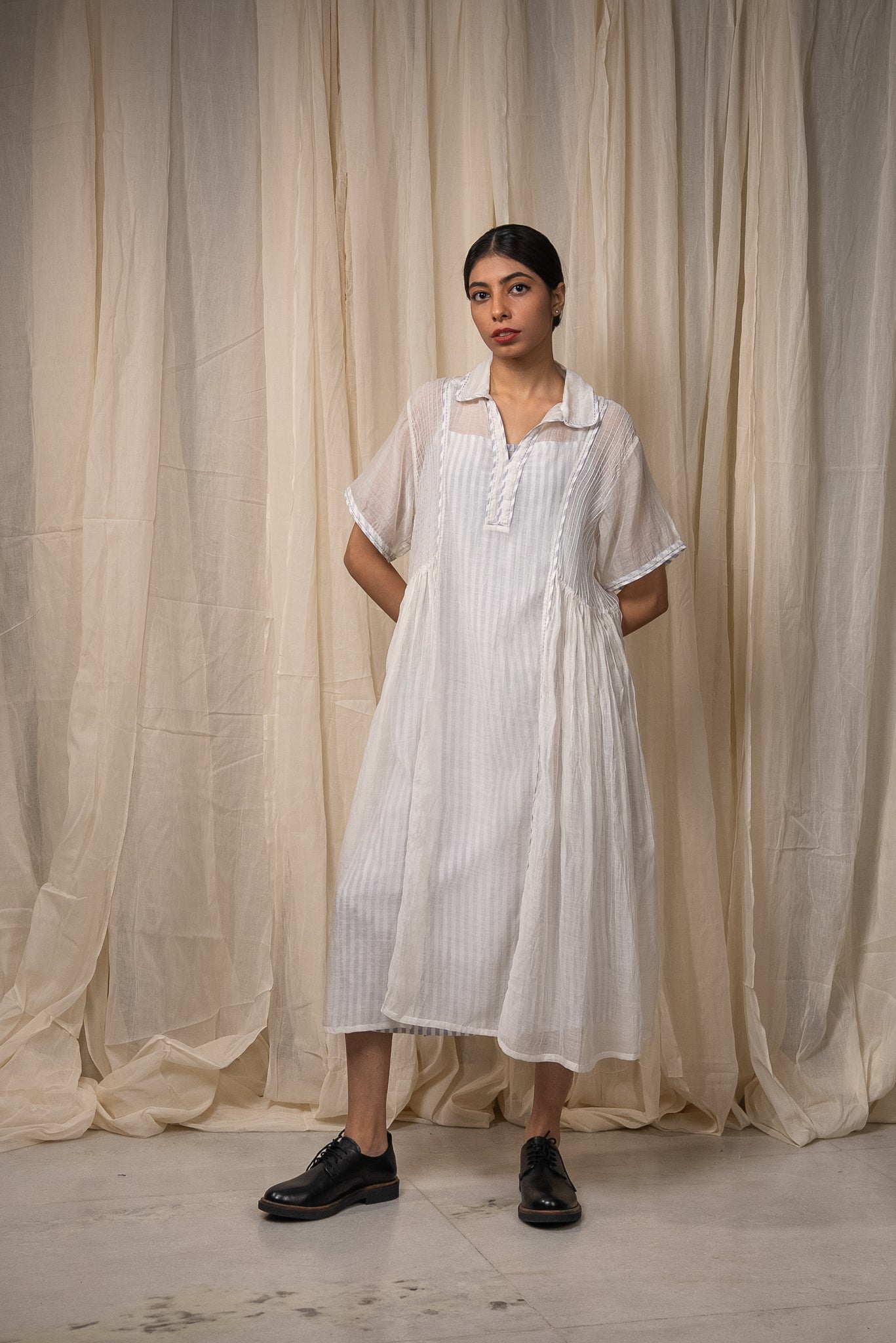 The silhouette features a shirt collar and pintucks along the sides that open into soft gathers from the waist, creating volume with restraint. The construction allows the fabric to move and hold shape with subtle fluidity.