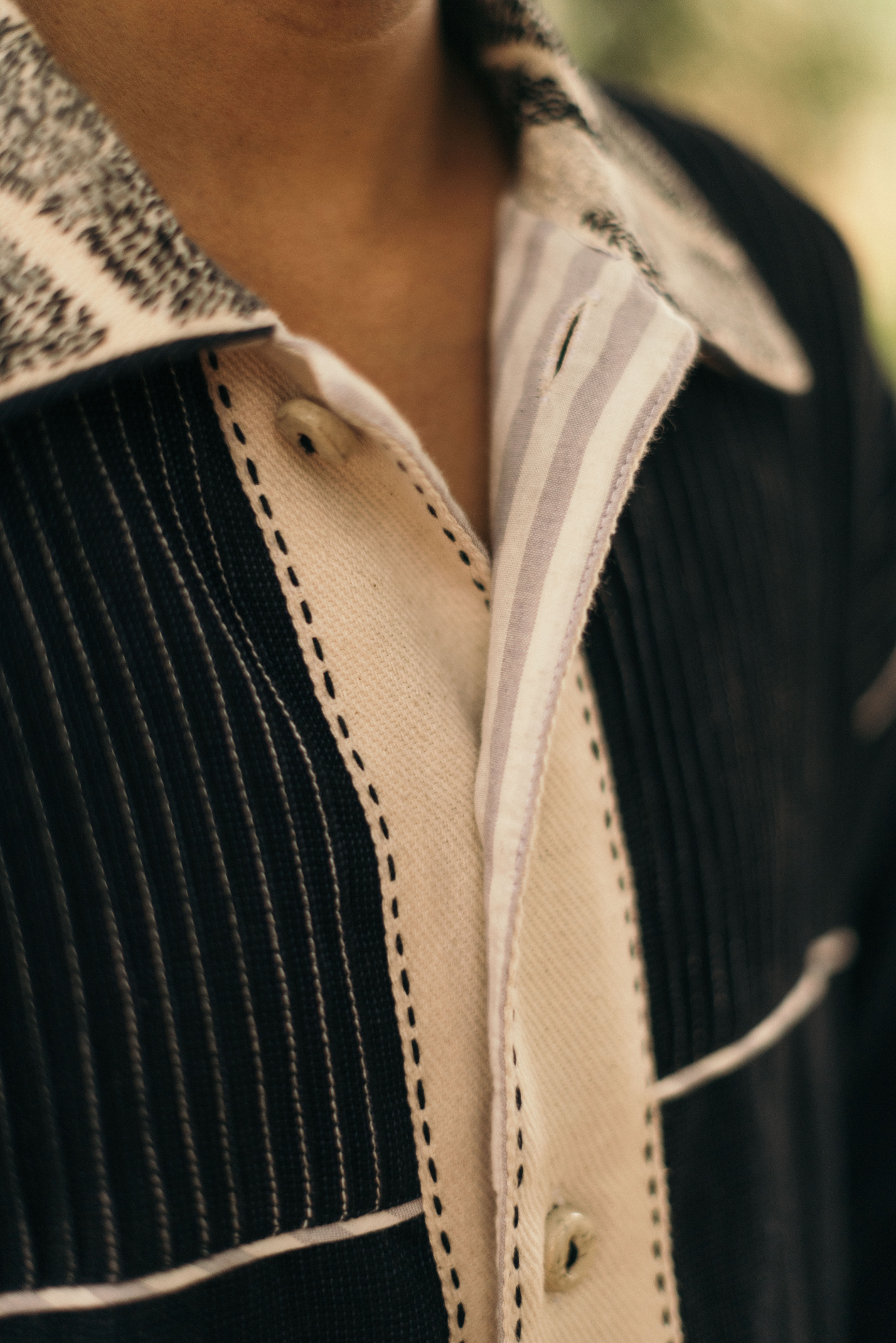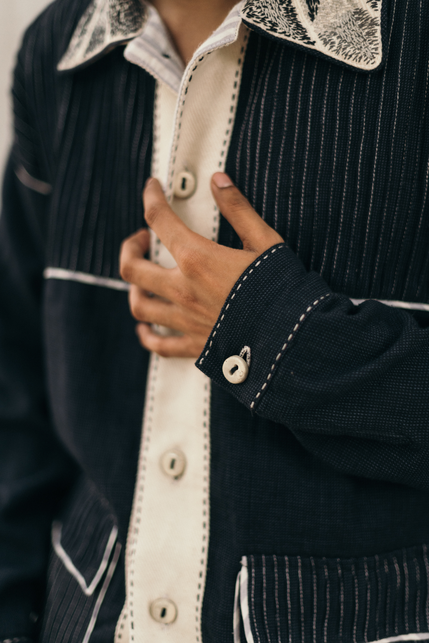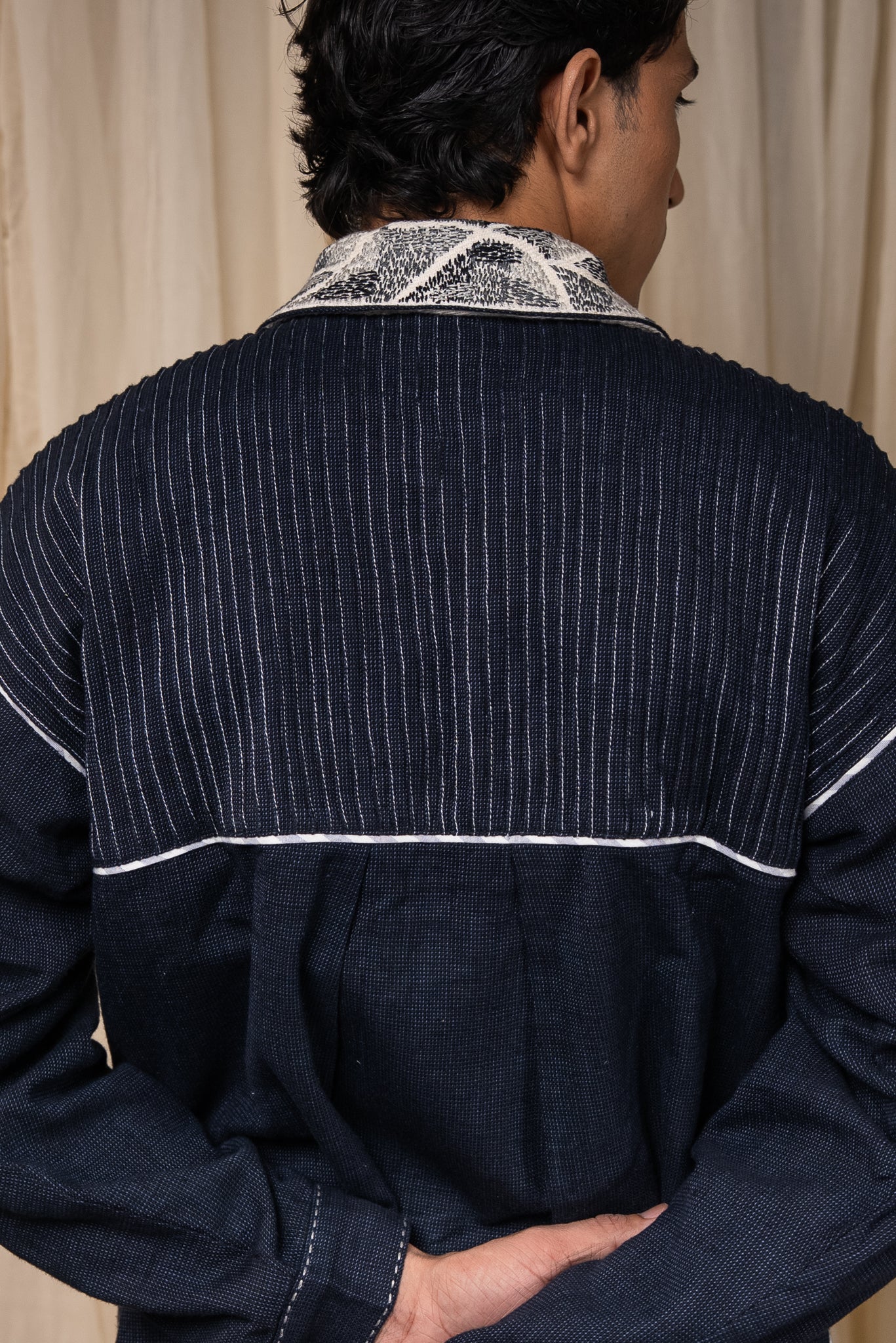 Made from 100% cotton fibres and azo-free dyed Midnight Black cotton, this Jacket is defined by its surface detailing and refined construction. Hand-done Kantha lines run across the fabric, offering quiet rhythm and texture, while pintucks on the front yoke, back, and pockets create subtle depth and structure.