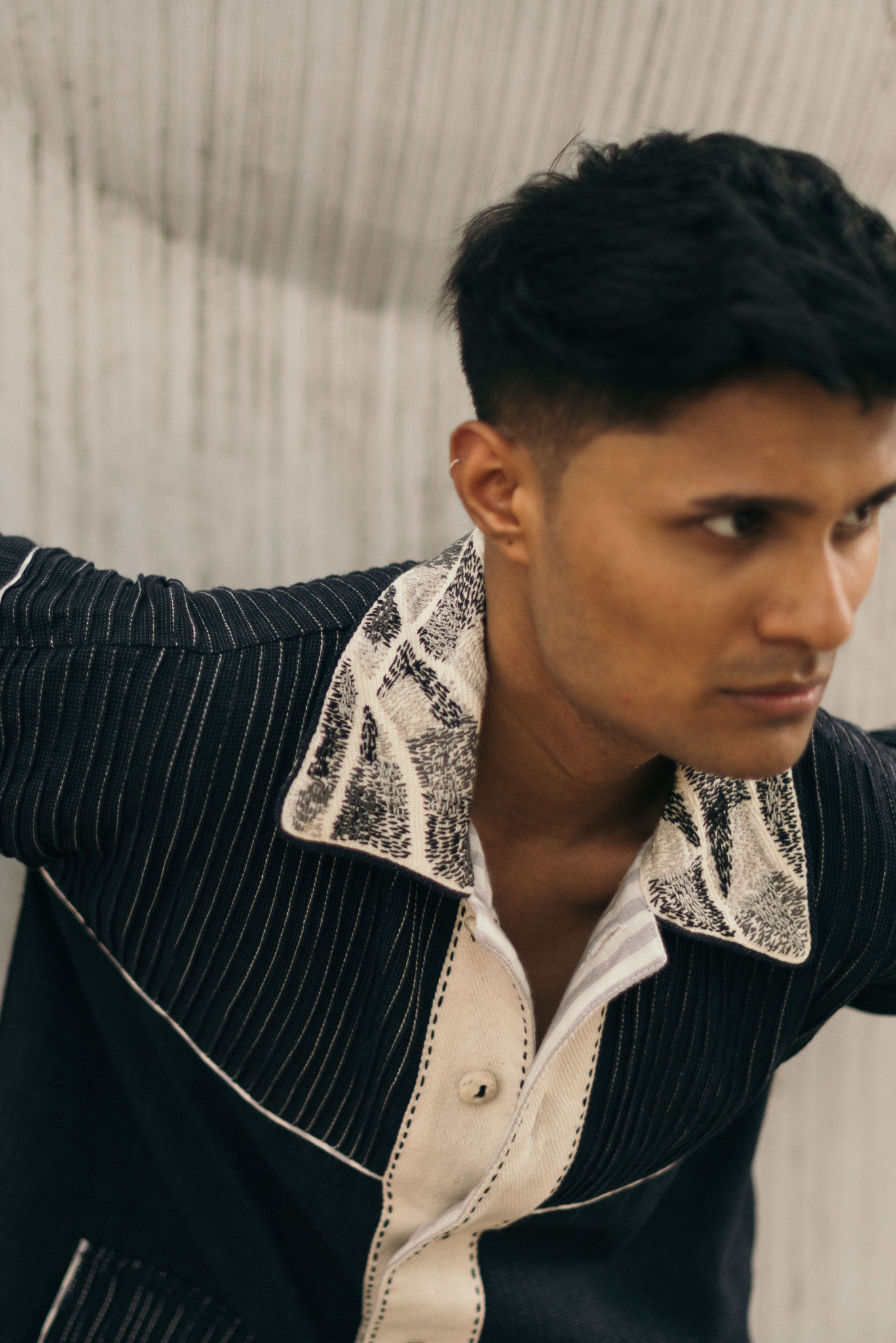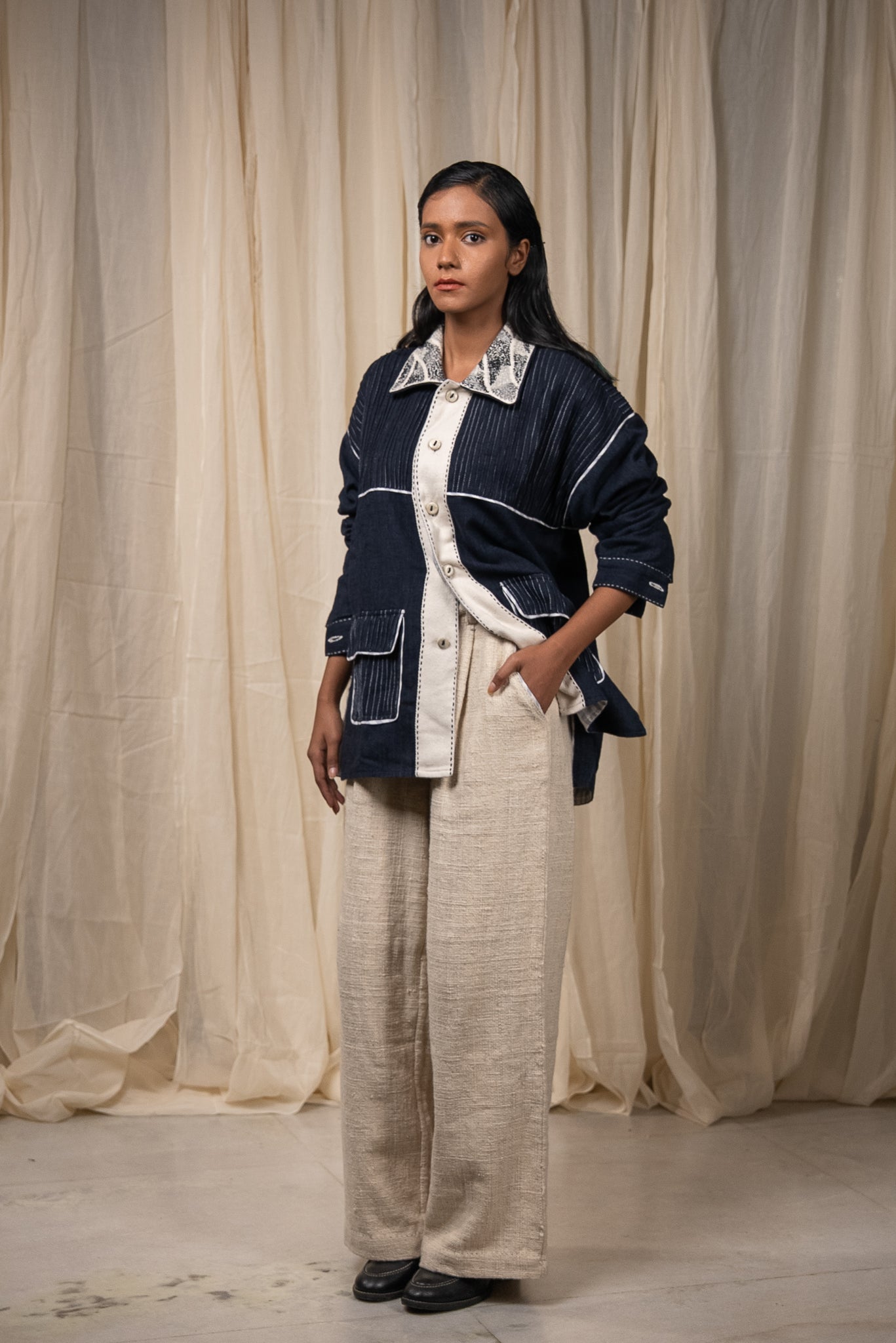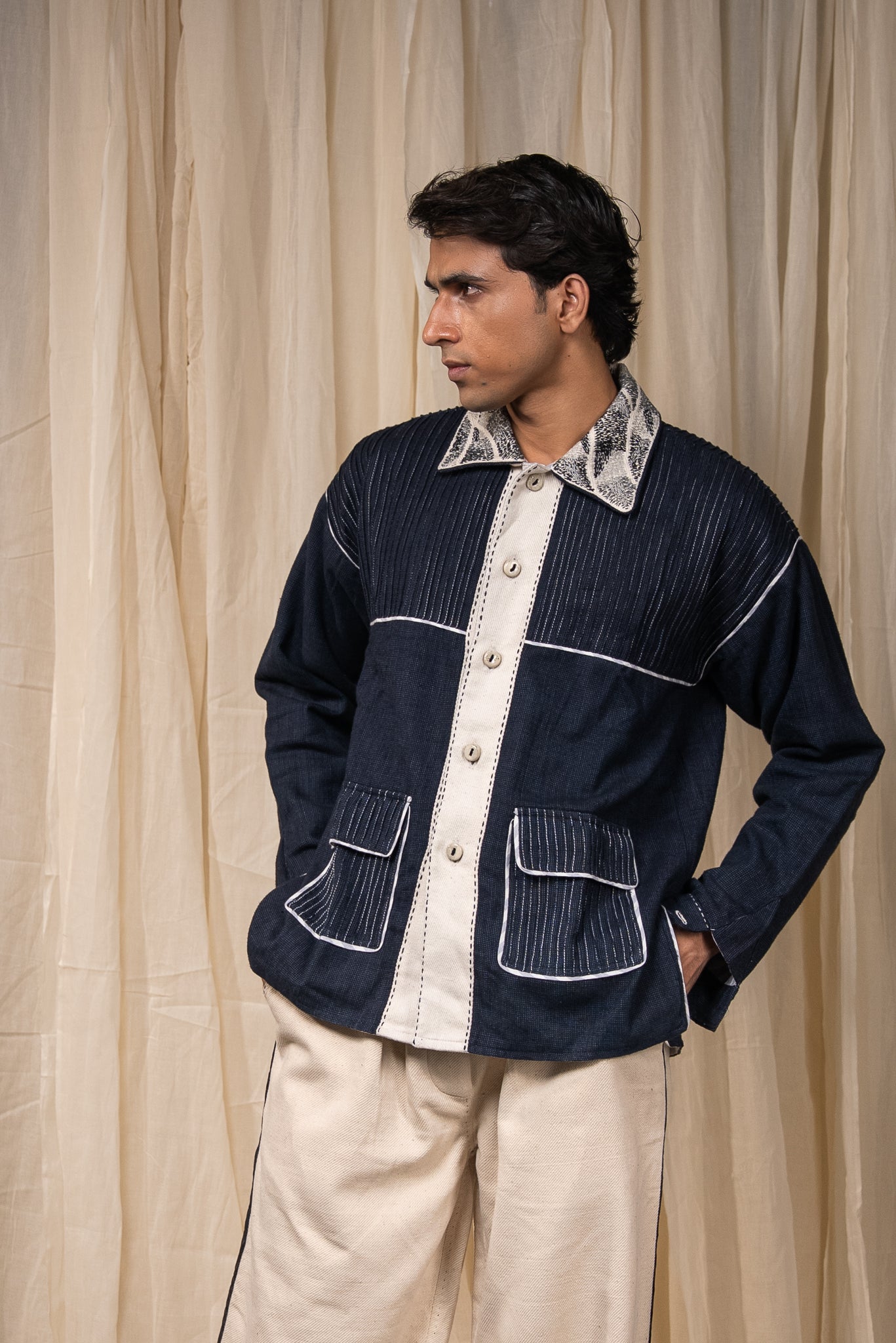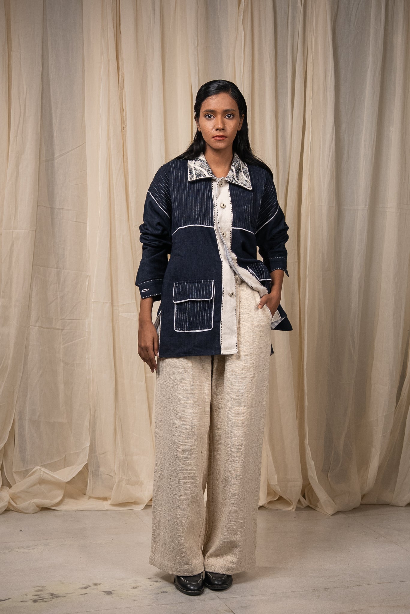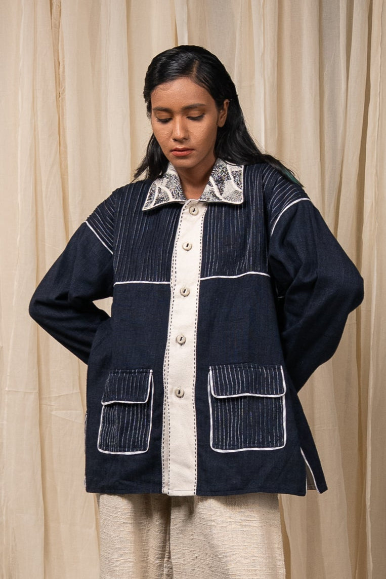 The silhouette features patch pockets with flaps and contrast piping along the edges, framing the form. The collar stands out as a focal point - densely embellished with reimagined Kantha embroidery that elevates the piece with tactility and craftsmanship.