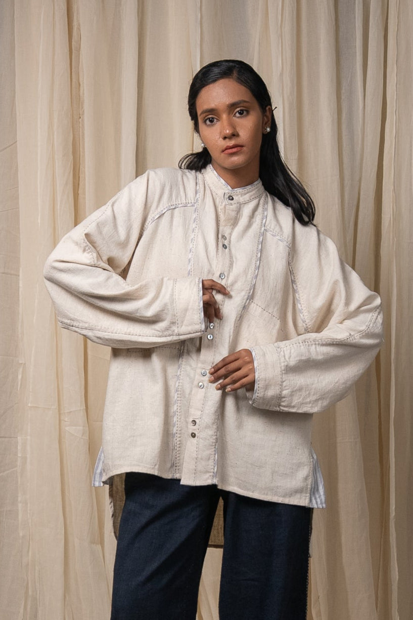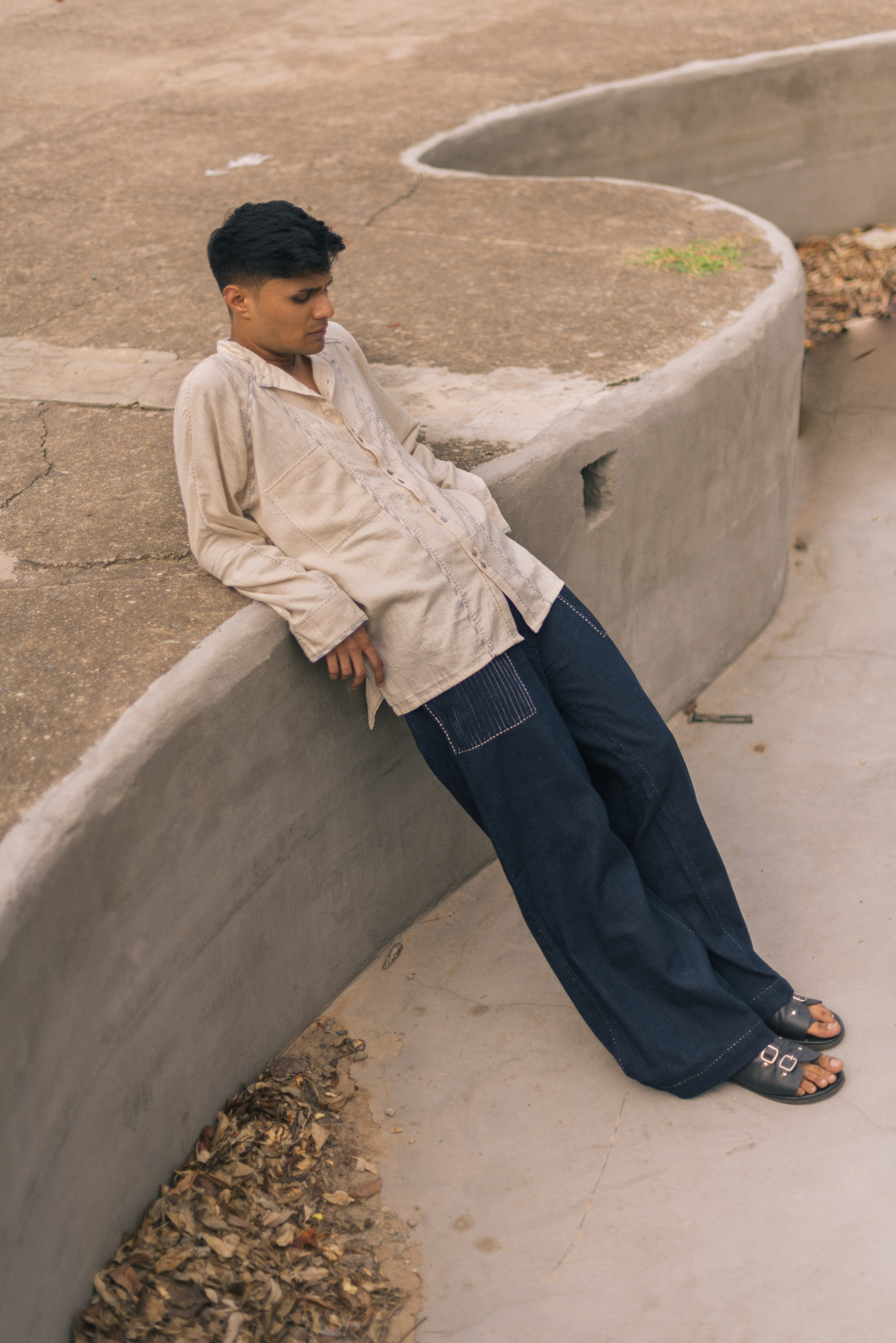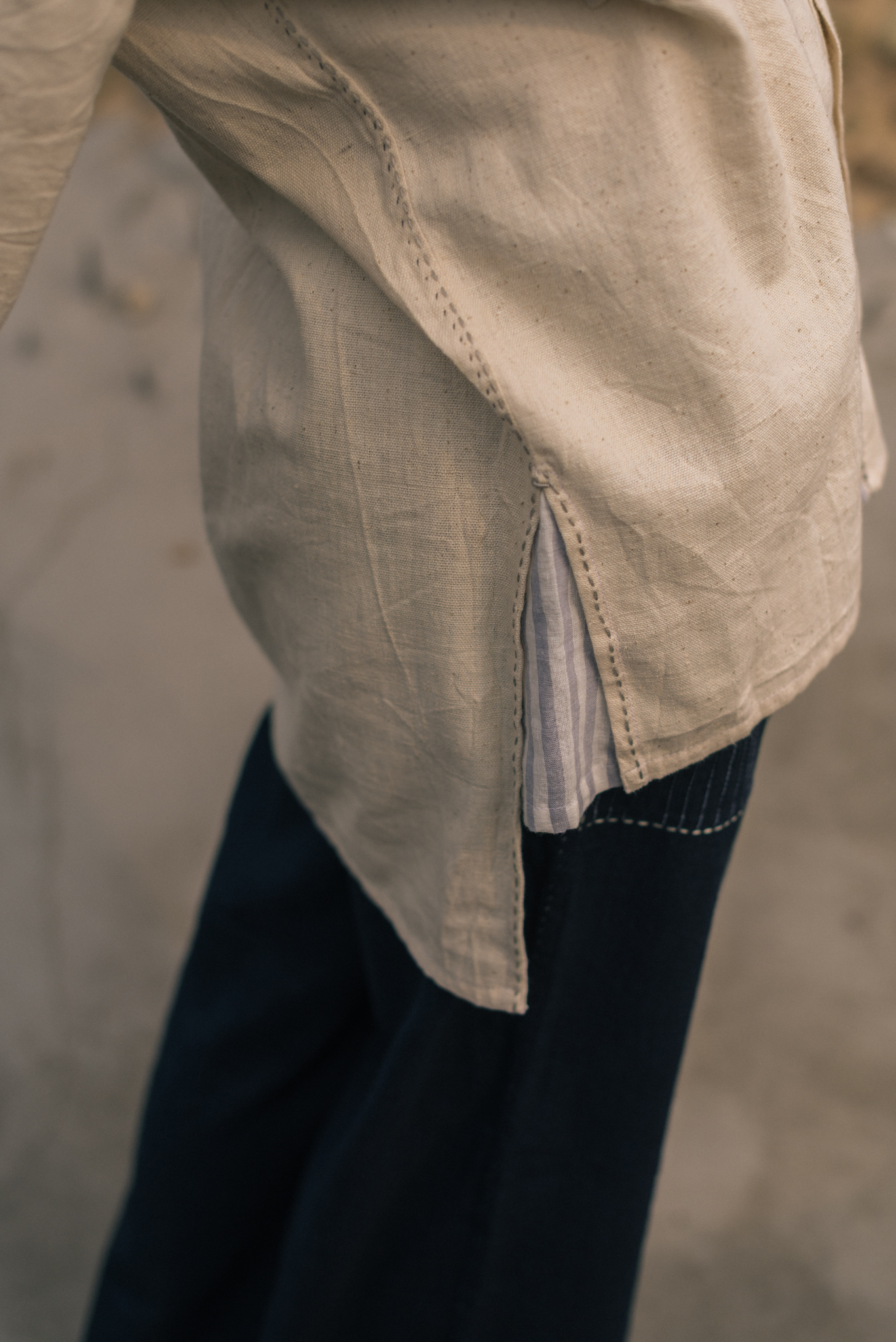 Made from 100% cotton fibres and natural materials, the Seam Shirt is crafted in undyed and unbleached Kora Kala cotton - a soft, textured fabric that holds the natural character of the fibre. Hand-done Kantha embroidery runs along the seams, complemented by piping in grey striped handwoven cotton, subtly framing the garment’s structure.