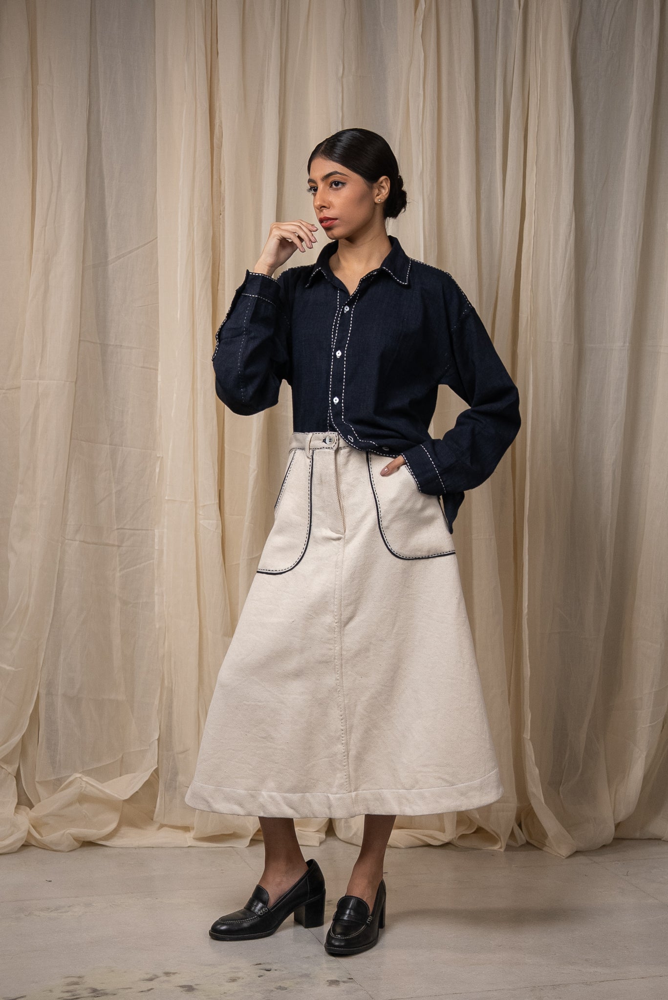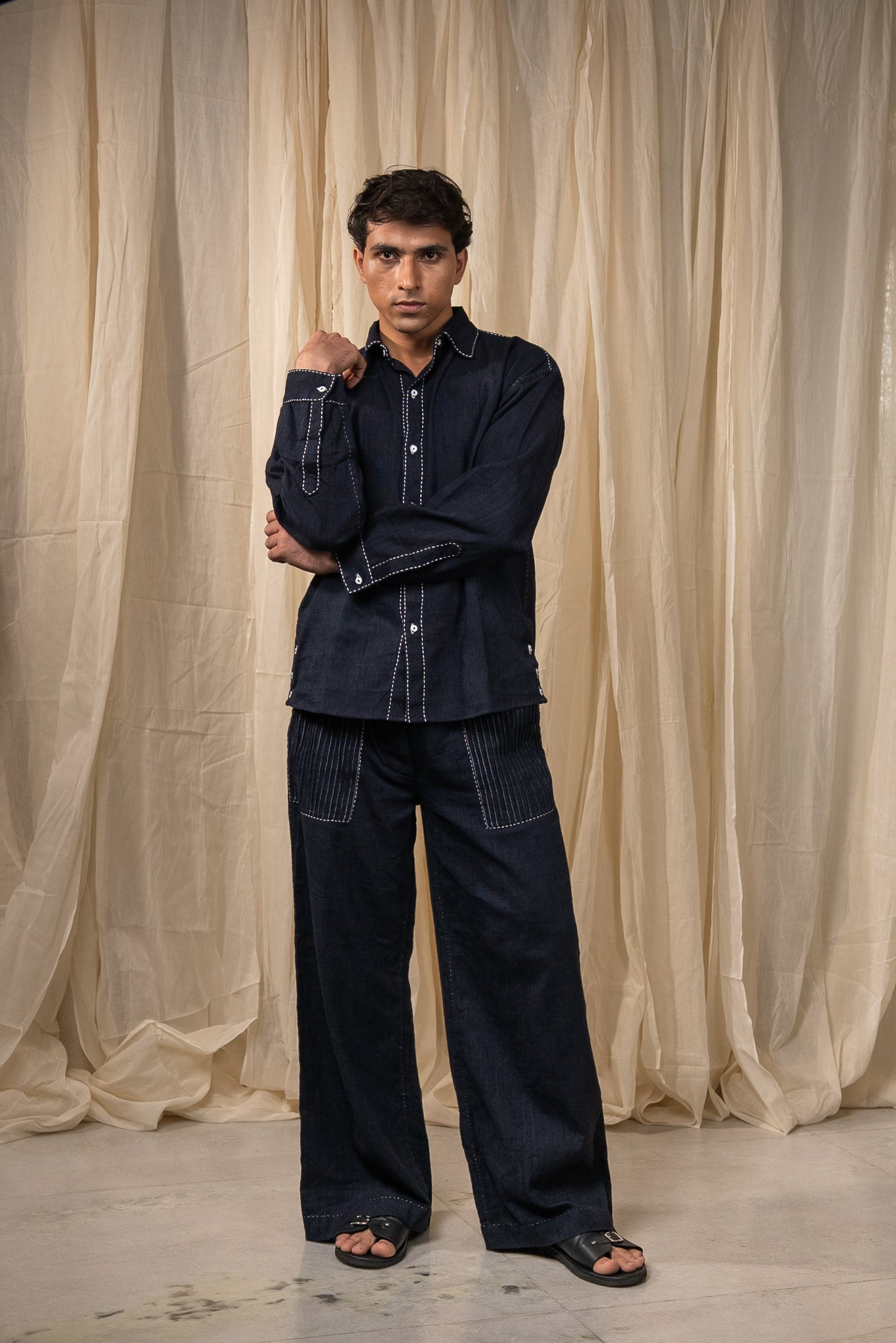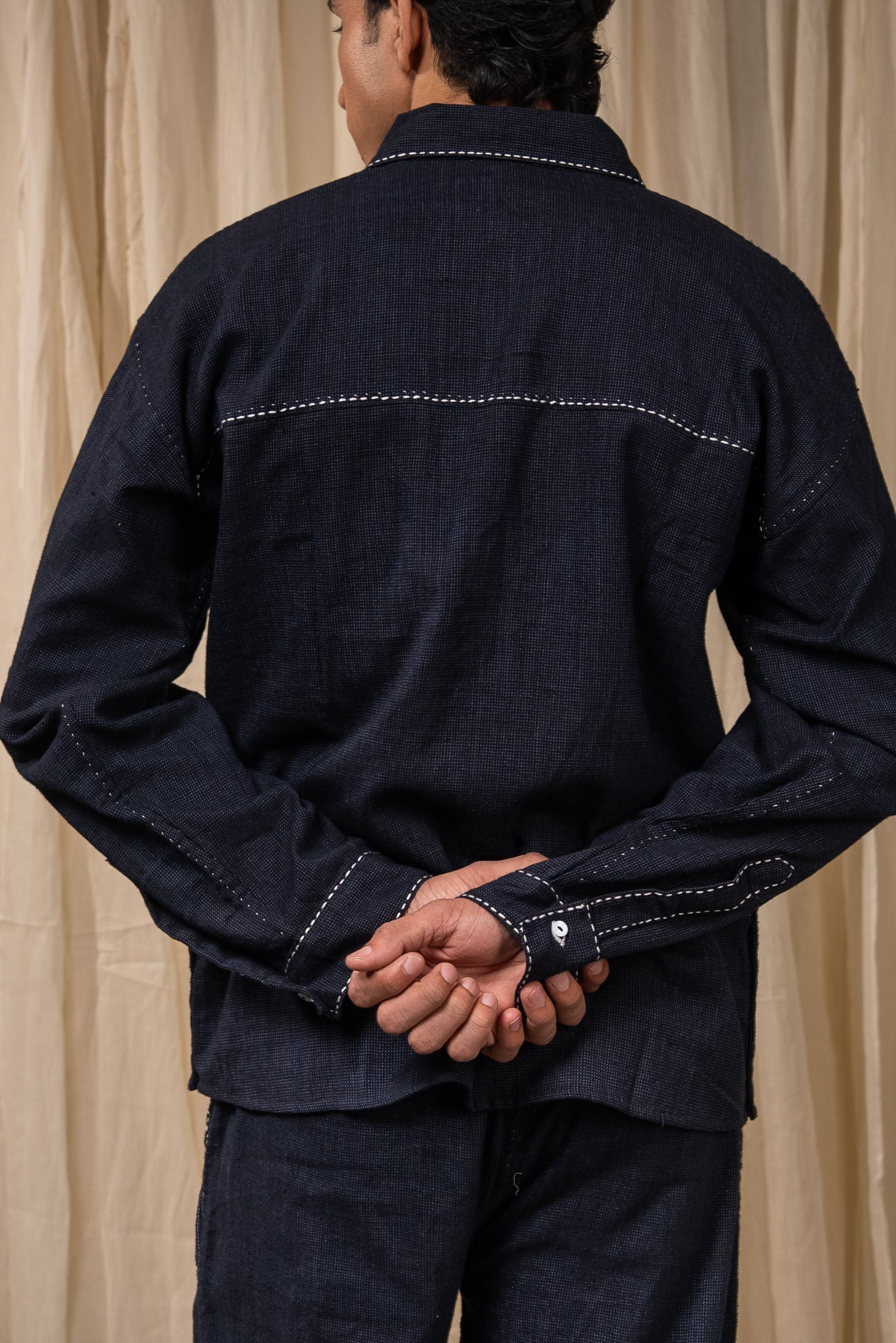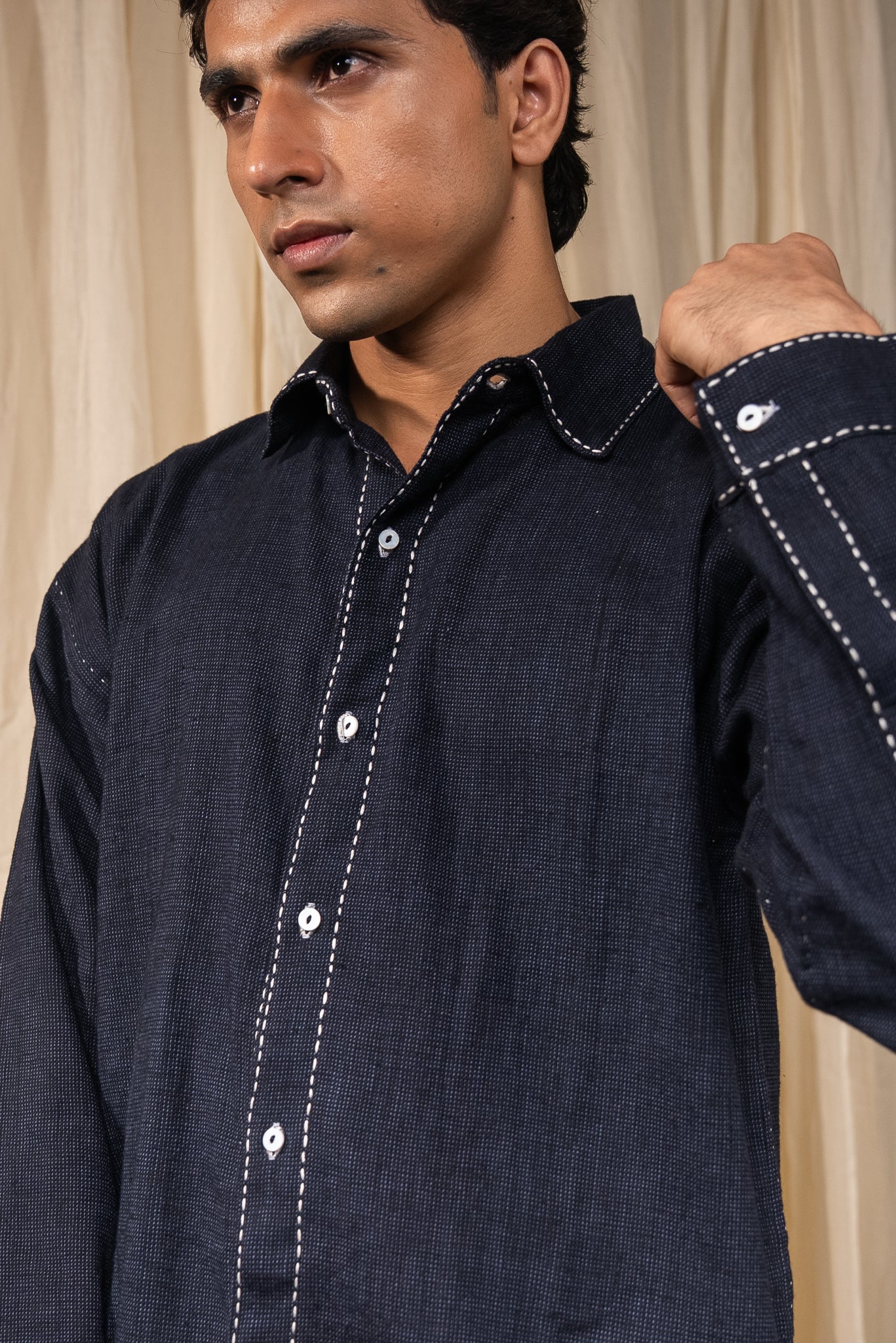 Crafted from 100% cotton fibres and natural materials, this shirt is made from azo-free dyed black handwoven cotton. A classic full-sleeved silhouette is detailed with fine Kantha lines that quietly highlight its form and construction- subtle marks of hand and process. Simple yet versatile, this trans-seasonal piece can be worn on its own or layered with ease.