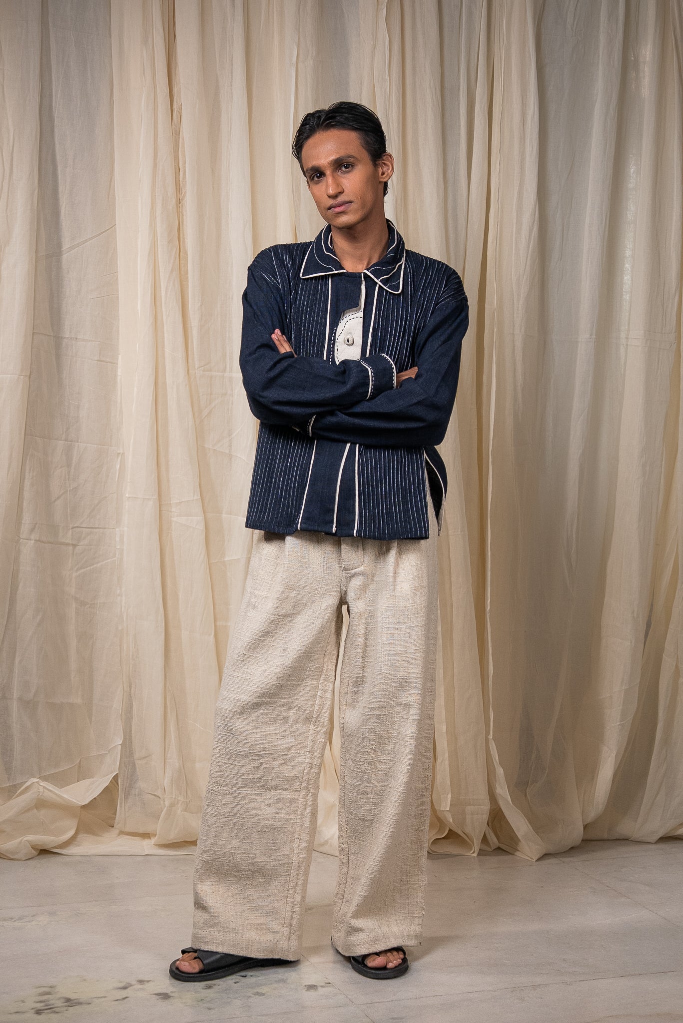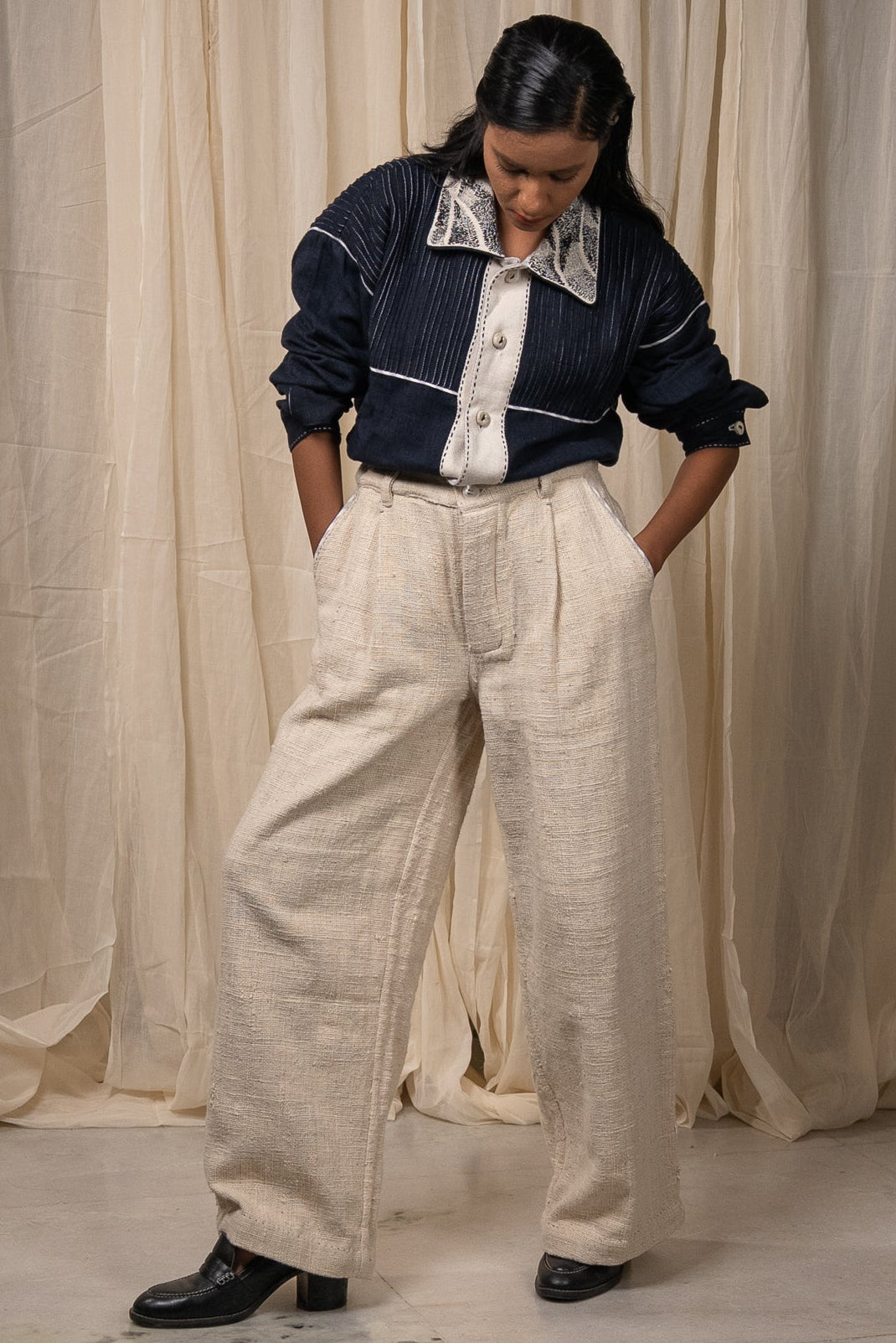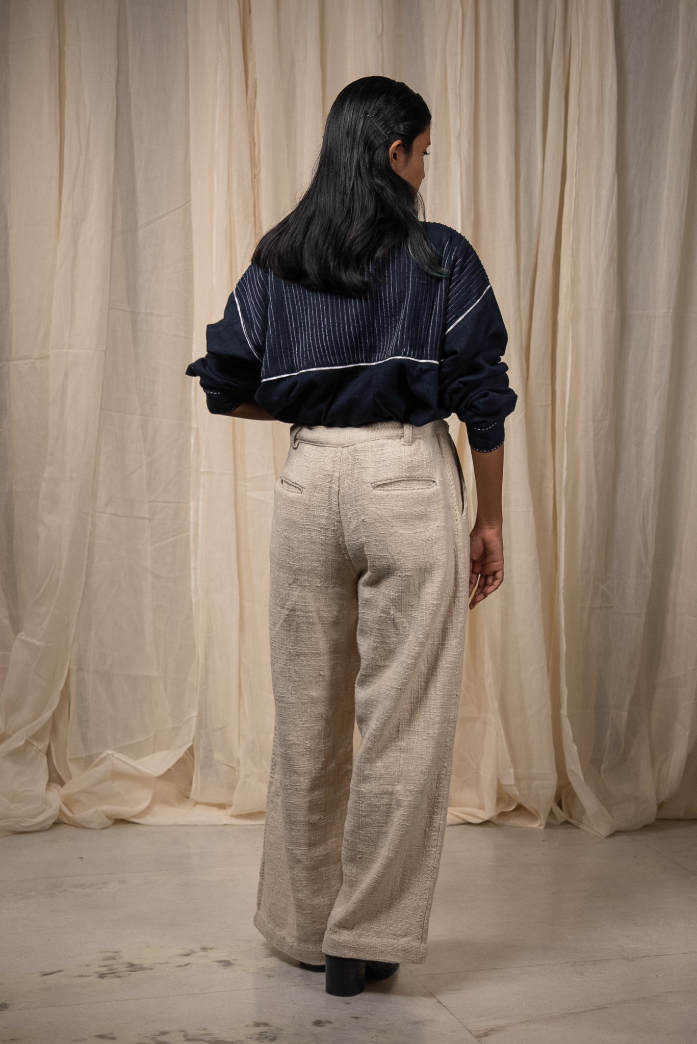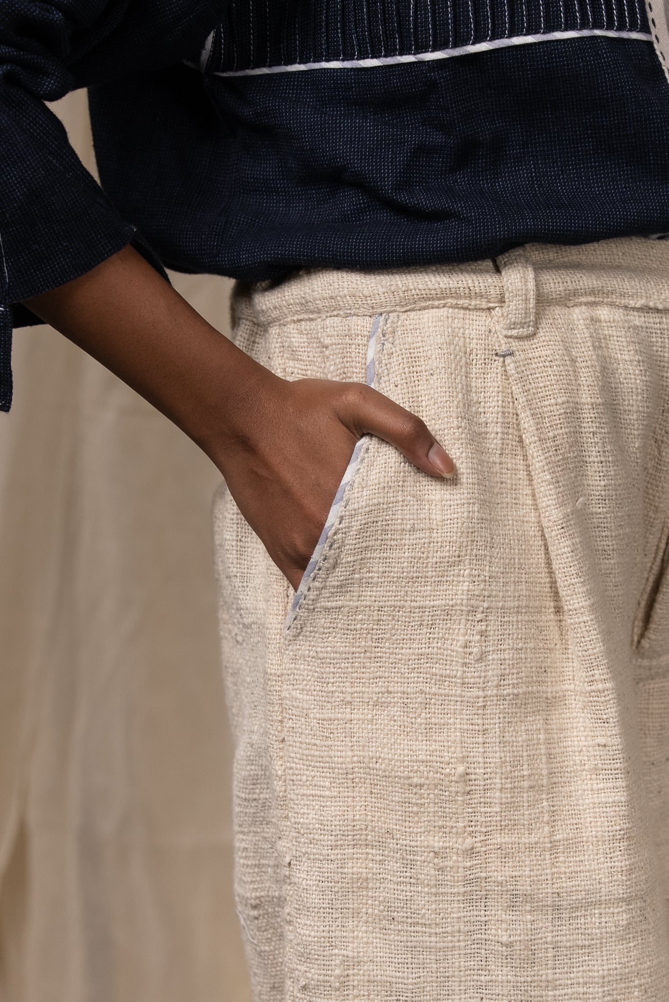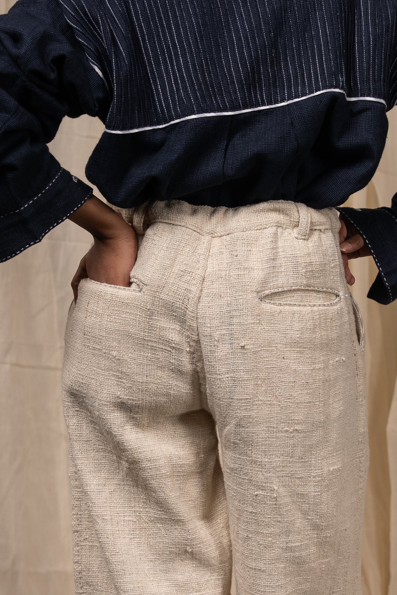 Crafted from 100% cotton fibres and natural materials, this straight-leg pant is made in undyed, unbleached zero count handwoven cotton - a thick, textural fabric that holds shape with structure. Pockets are finished with piping in handwoven grey striped cotton, adding subtle contrast and detail.