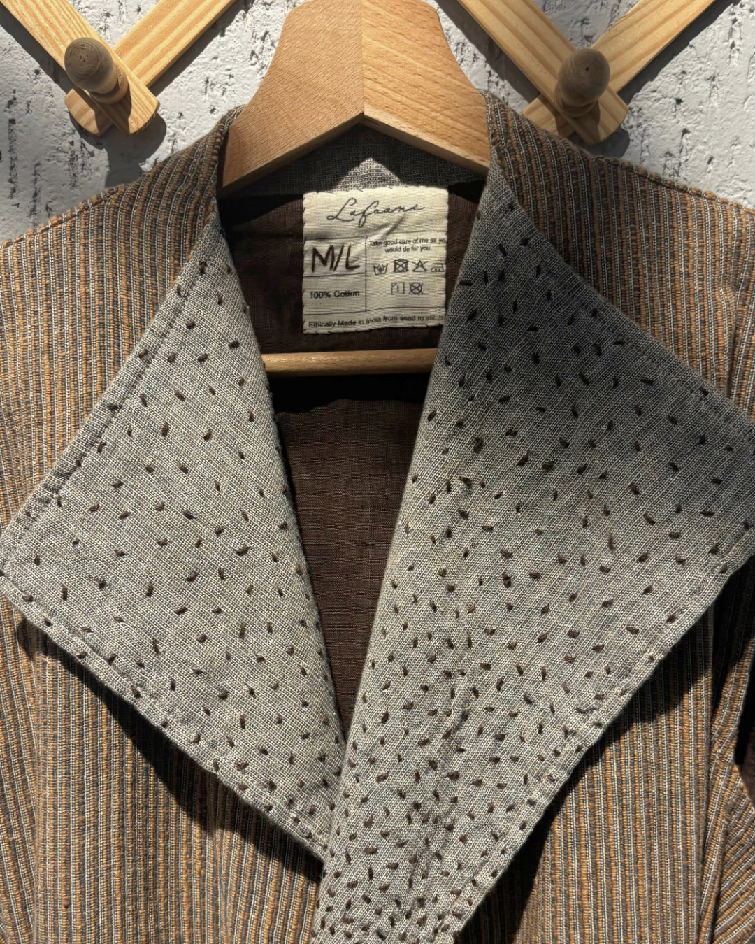 A handwoven sleeveless jacket with a gently tailored silhouette, cinched with a fabric belt and natural wooden buckle. The Kantha embroidered contrast lapel adds a quiet layer of texture and detail, while the striped body brings depth and movement-an expressive, seasonless piece designed for layering and versatility.
