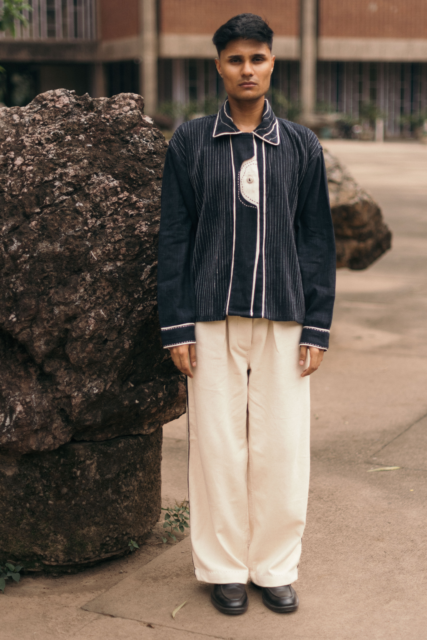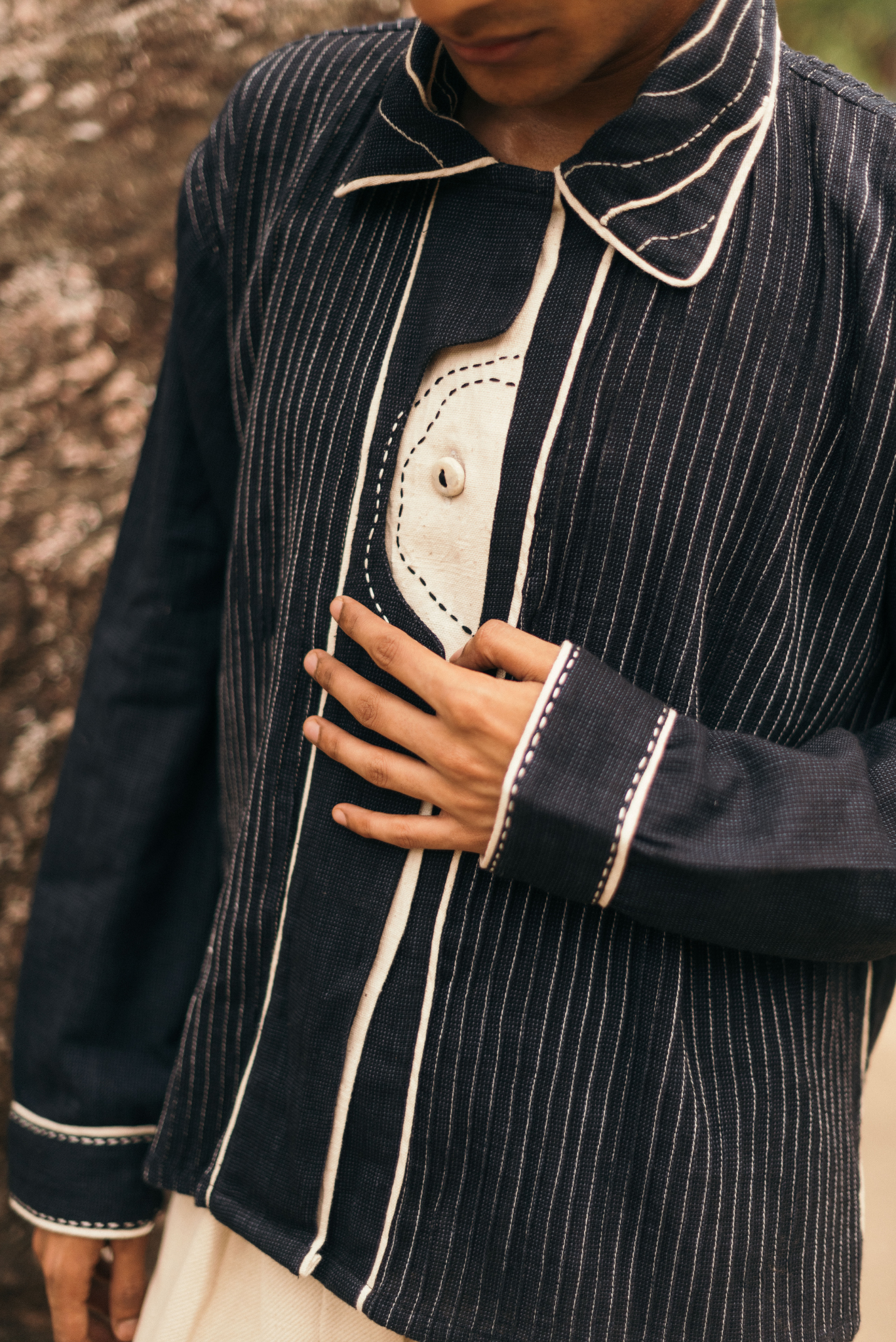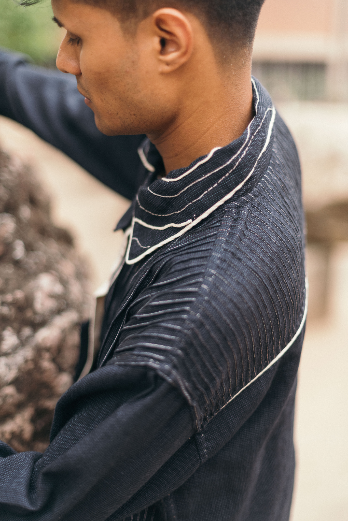 The silhouette is finished with a flap on the sleeve secured with a button, and detailed with Kora Kala cotton piping that traces the edges in soft contrast. Embroidery of the brand logo sits on the collar - rendered through backstitch variations, Kantha, and couching.