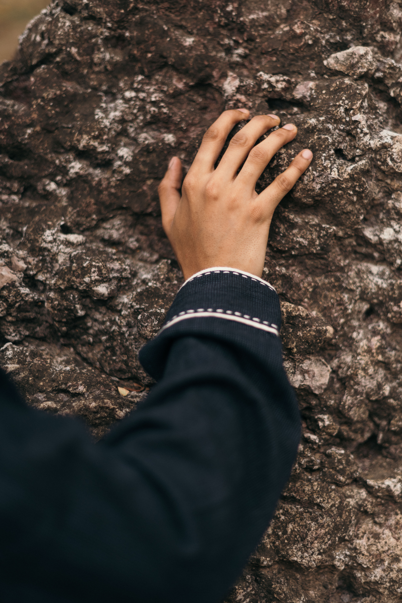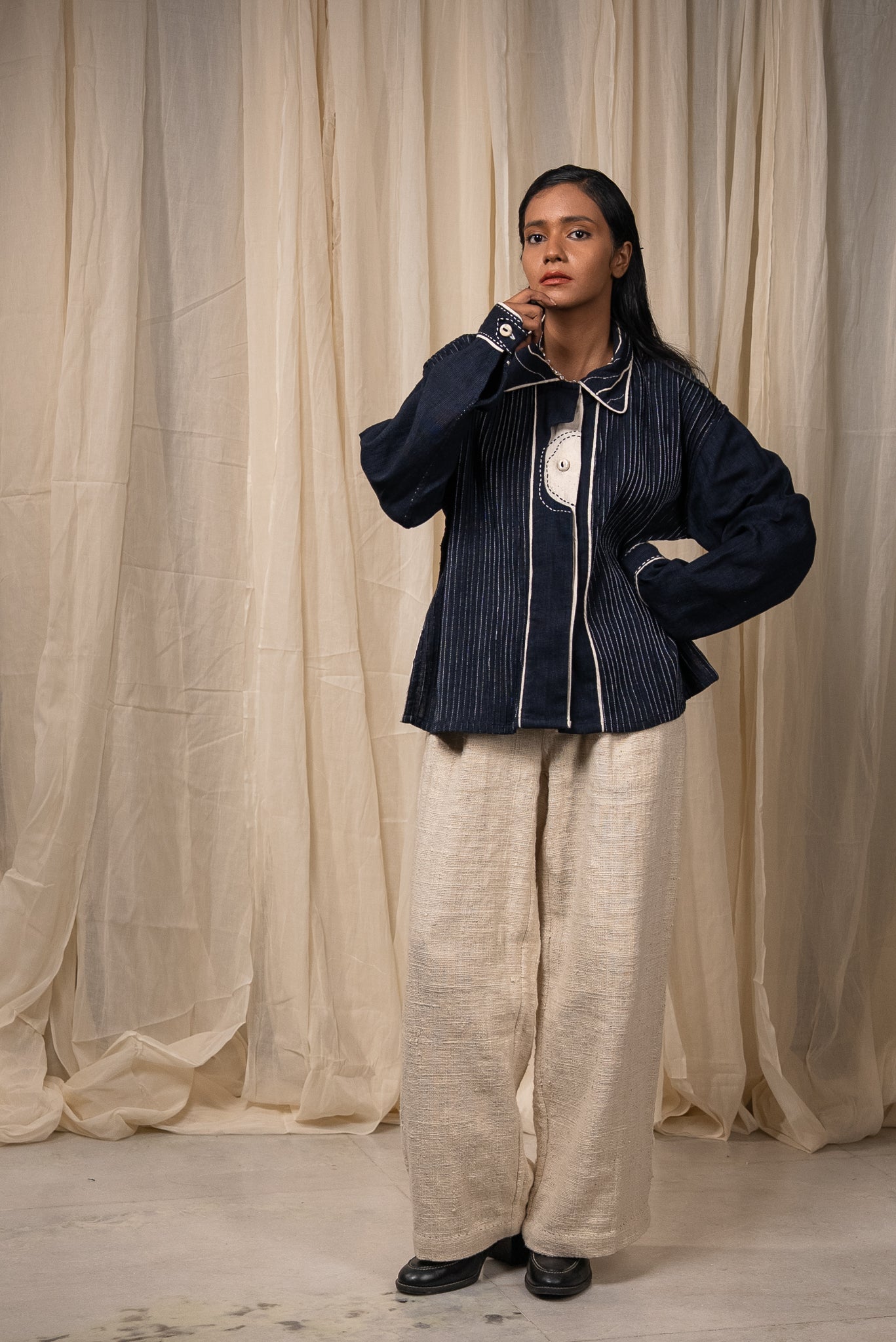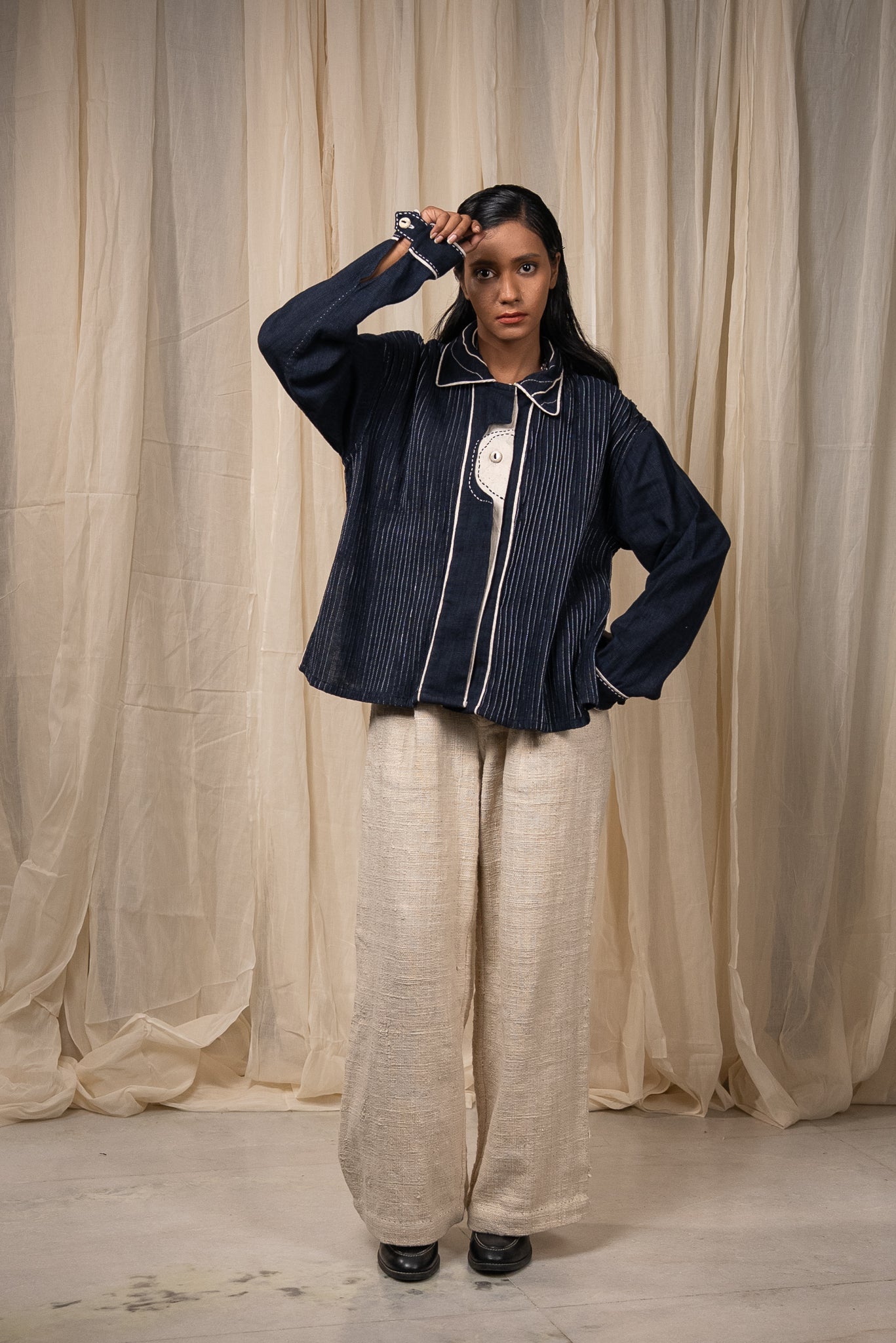 The silhouette is finished with a flap on the sleeve secured with a button, and detailed with Kora Kala cotton piping that traces the edges in soft contrast. Embroidery of the brand logo sits on the collar - rendered through backstitch variations, Kantha, and couching.